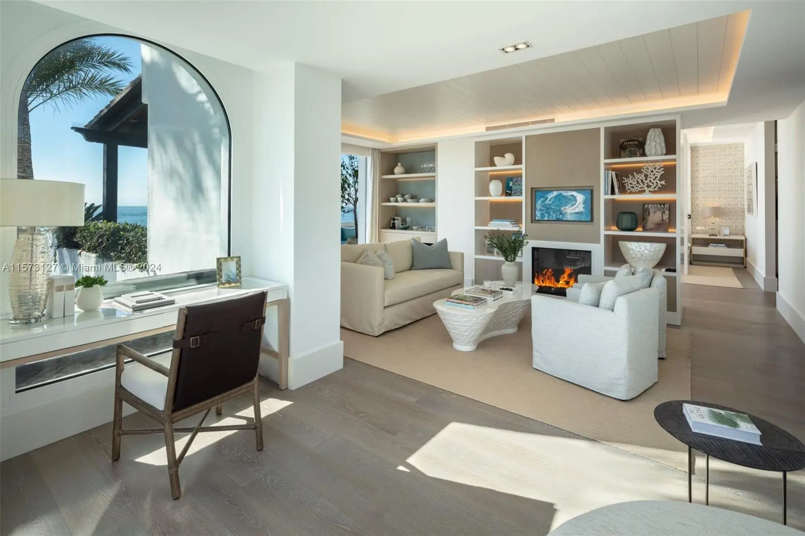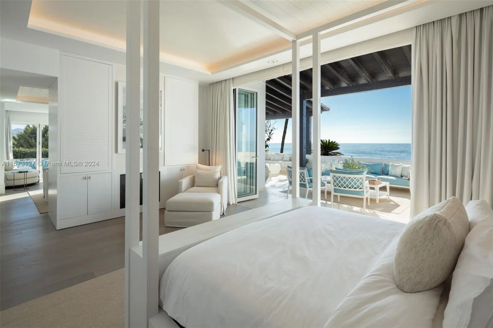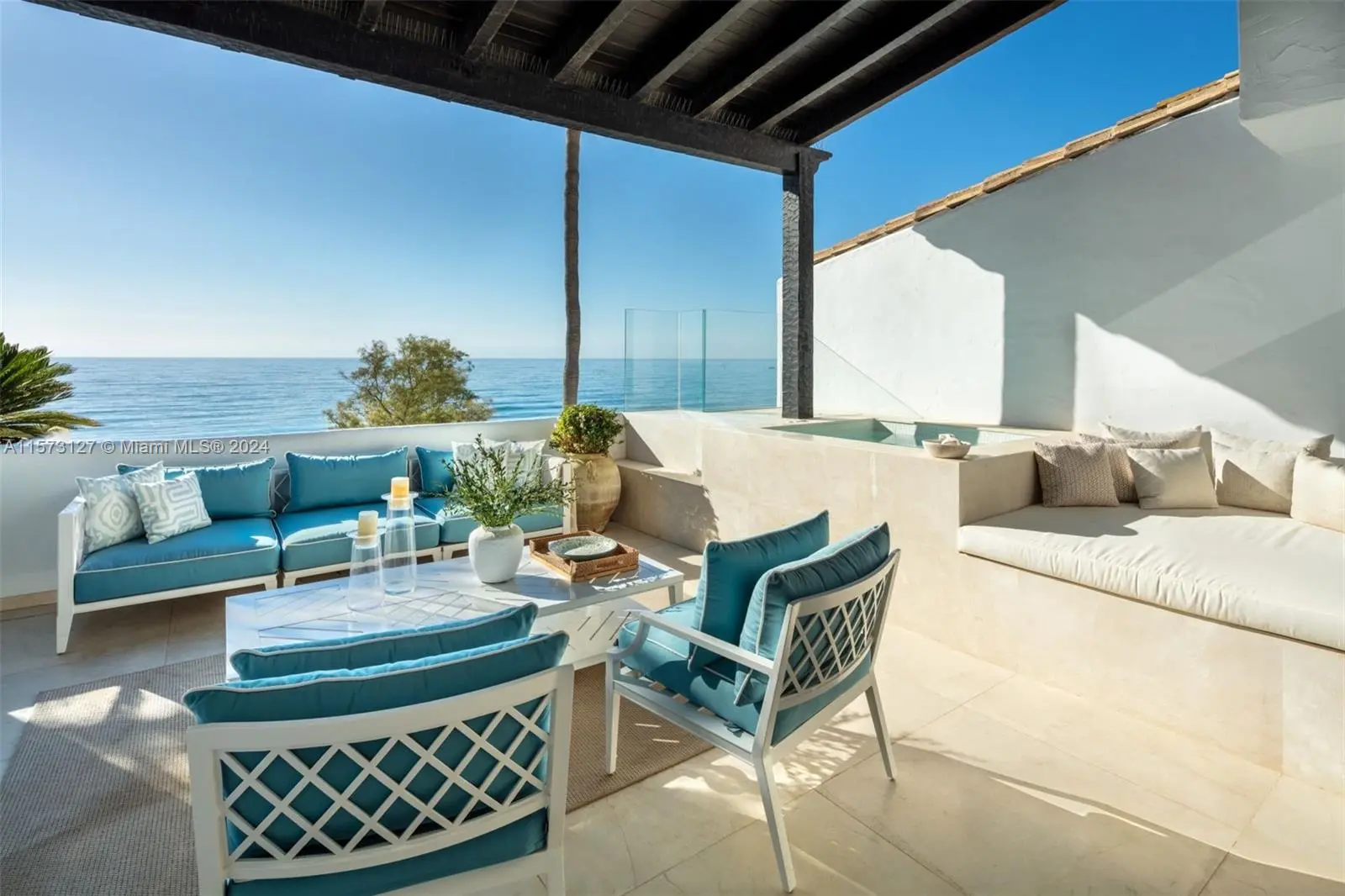 Property is located in Marbella, Spain. Coconut, a luxurious duplex in Puente Romano Resort, boasts stunning sea views and southern exposure. It features expansive terraces, direct terrace access via sliding doors, and a serene blue and neutral color palette. The living area includes a bookshelf, bar, and fireplace, connected to a dining area and a kitchen with a marble island and modern appliances. Two ground floor guest bedrooms have en-suite bathrooms. The master suite upstairs offers a private living area with a fireplace, walk-in closet, en-suite bathroom, and a terrace with a pool overlooking the sea, encapsulating Marbella's elite beachside lifestyle.