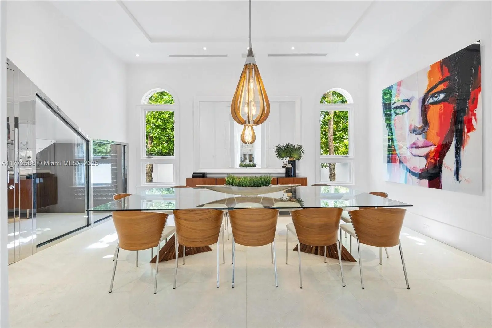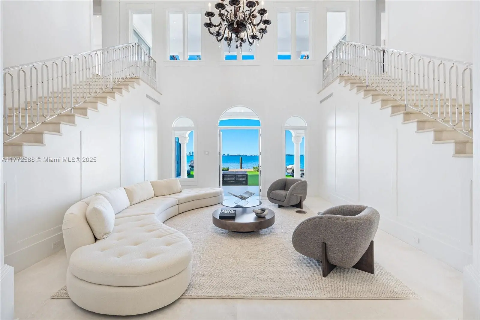 Luxury modern Mediterranean home on prestigious North Bay Road with breathtaking panoramic open bay views. Six bedrooms all with ensuite bathrooms, half bathroom and cabana bath. Featuring grand double height ceiling in entry foyer with stairs either side surrounding intimate sitting area, double master suites, theater/library, den w/fireplace, billiard room, and 12' ceilings throughout. The exterior has large covered patio with chef summer kitchen with commercial Viking appliances, and outdoor entertainment bar. Three car garage with double height ceiling for car lifts. Infinity pool with stunning sunset views to the west. With over 100 feet on water and new dock for you to moor a large yacht, on which you cruise Biscayne Bay to dine at various waterfront restaurants.