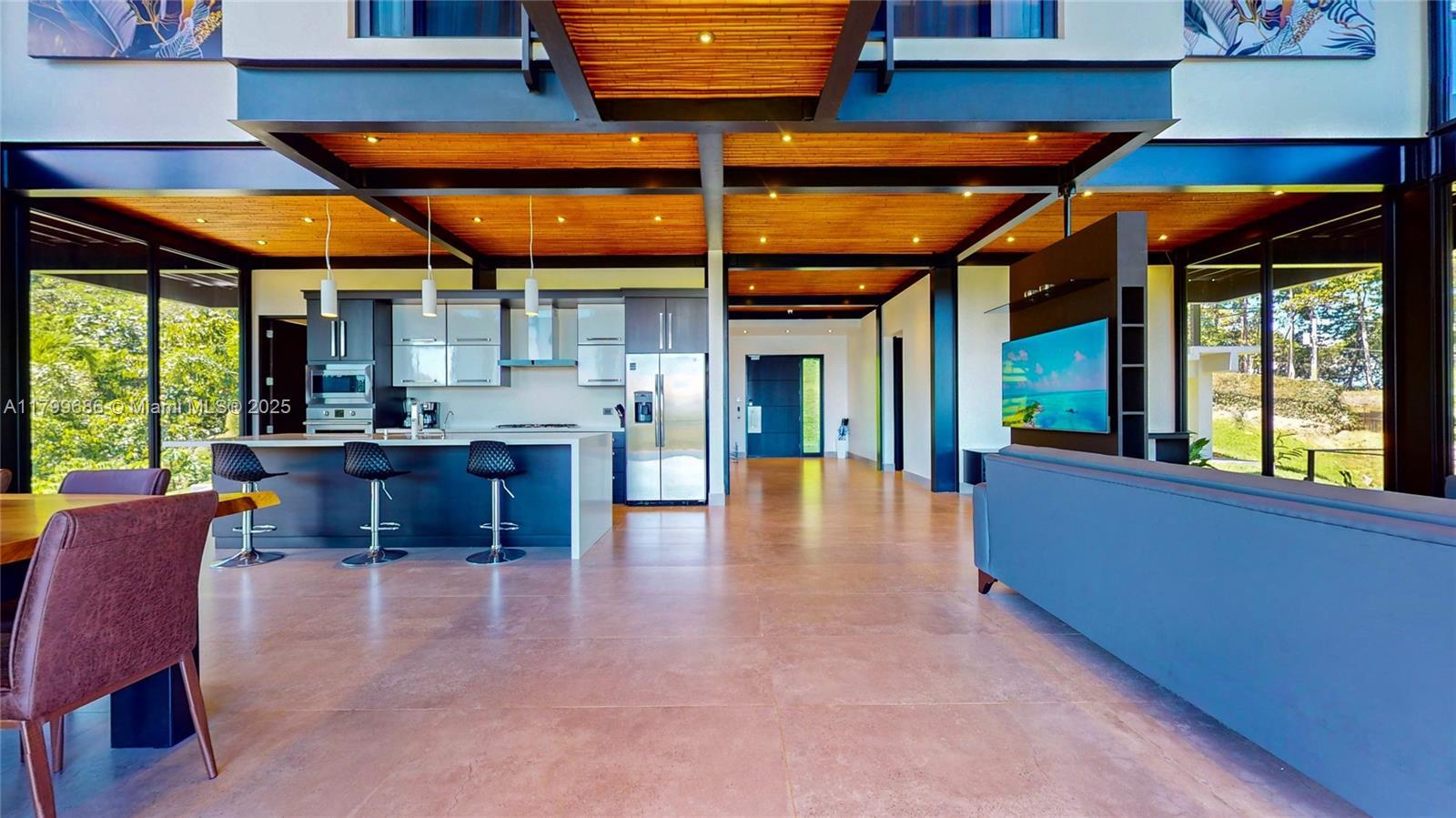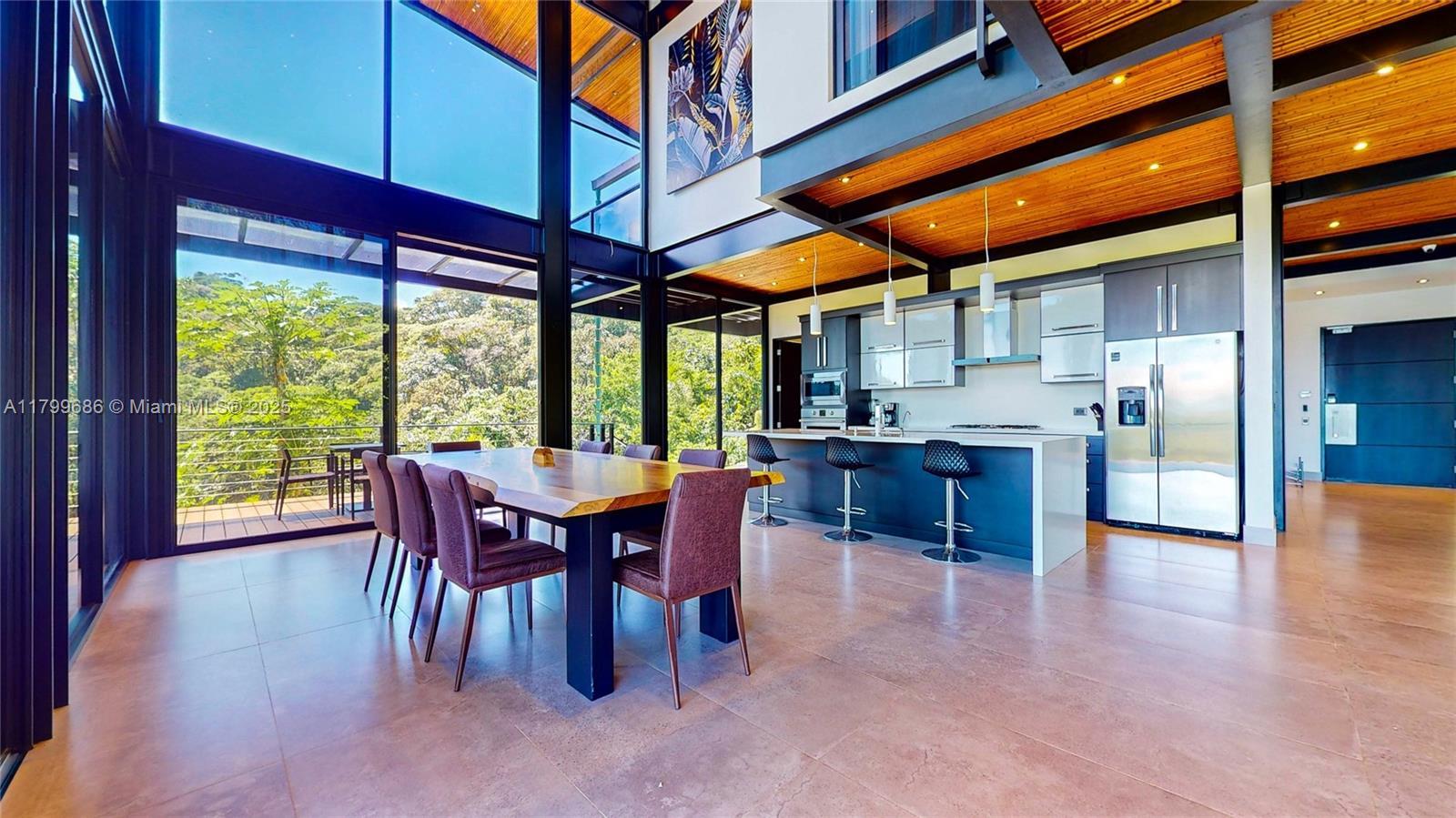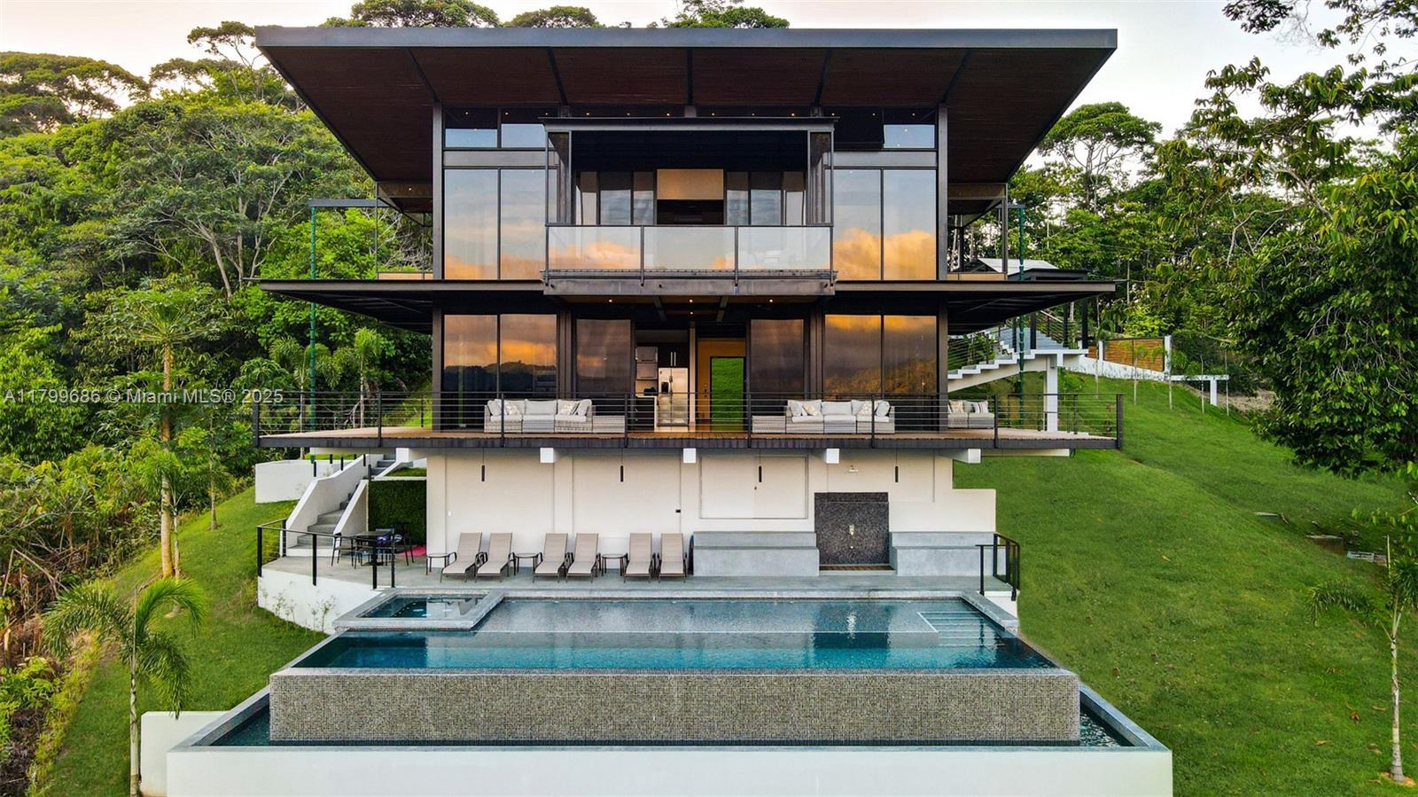 Escape to a world of peaceful serenity with this unique Costa Rican property nestled in the upscale community of Escaleras. This modern, multi-level home blends contemporary architecture with the natural surroundings, creating a private oasis that is ideal for luxury living and boutique rental opportunities. The four-level structure is thoughtfully designed into the hillside, featuring expansive three-sided glass walls, a glass-roofed carport, and a party-sized pool deck that takes advantage of the incredible views. With a design that blends industrial style and natural warmth, this home is true architectural gem. Inside, wood finishes, granite countertops, and stone, wood, and bamboo inlays create a sense of refined elegance. Situated just 10 mins from the beaches of Dominical.