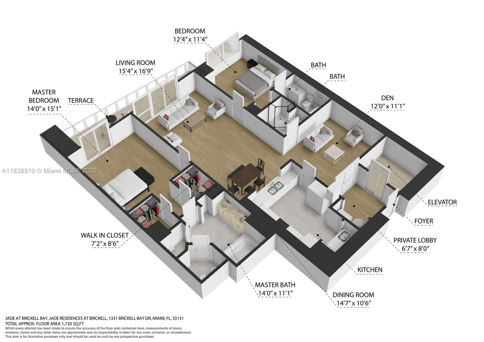 Luxurious & fully furnished 2 Bedroom + Den condo with unobstructed water views at the Jade Brickell. Enjoy direct ocean views from the living room & both bedrooms. This unit has a private elevator opening into a private foyer for the residence. Each bedroom has an en-suite bath, the separate den also has an en-suite bath. 10-foot ceilings and automatic blinds. Building amenities: Secure entry, private elevators, 24-hour valet, bayfront pool, fitness center with pilates & spa, business center & rooftop clubroom. Located on quiet Brickell Bay Drive within easy walking distance to Brickell. FULLY FURNISHED.