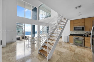 Live in the skies in this bright, airy, and spacious two-story loft featuring mesmerizing views of Biscayne Bay. The main level offers open living and dining areas, ideal for entertaining, along with a convenient half bath. Upstairs, two comfortable bedrooms and two full bathrooms provide privacy and relaxation. Enjoy dramatic ceiling heights, abundant natural light, and thoughtful separation between social and sleeping areas. The building offers great amenities including a pool, gym, games room, and social/party room. However, this exclusive unit enjoys access to a private roof-top sky deck who only floors 40 and up can access. A rare opportunity to own a beautifully designed loft-style condo with panoramic bay views in a full-service building.