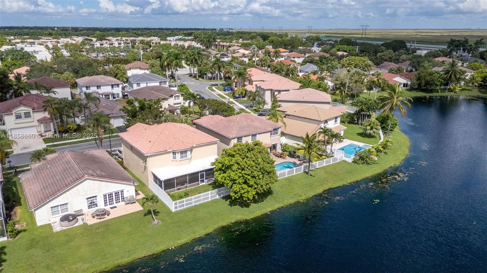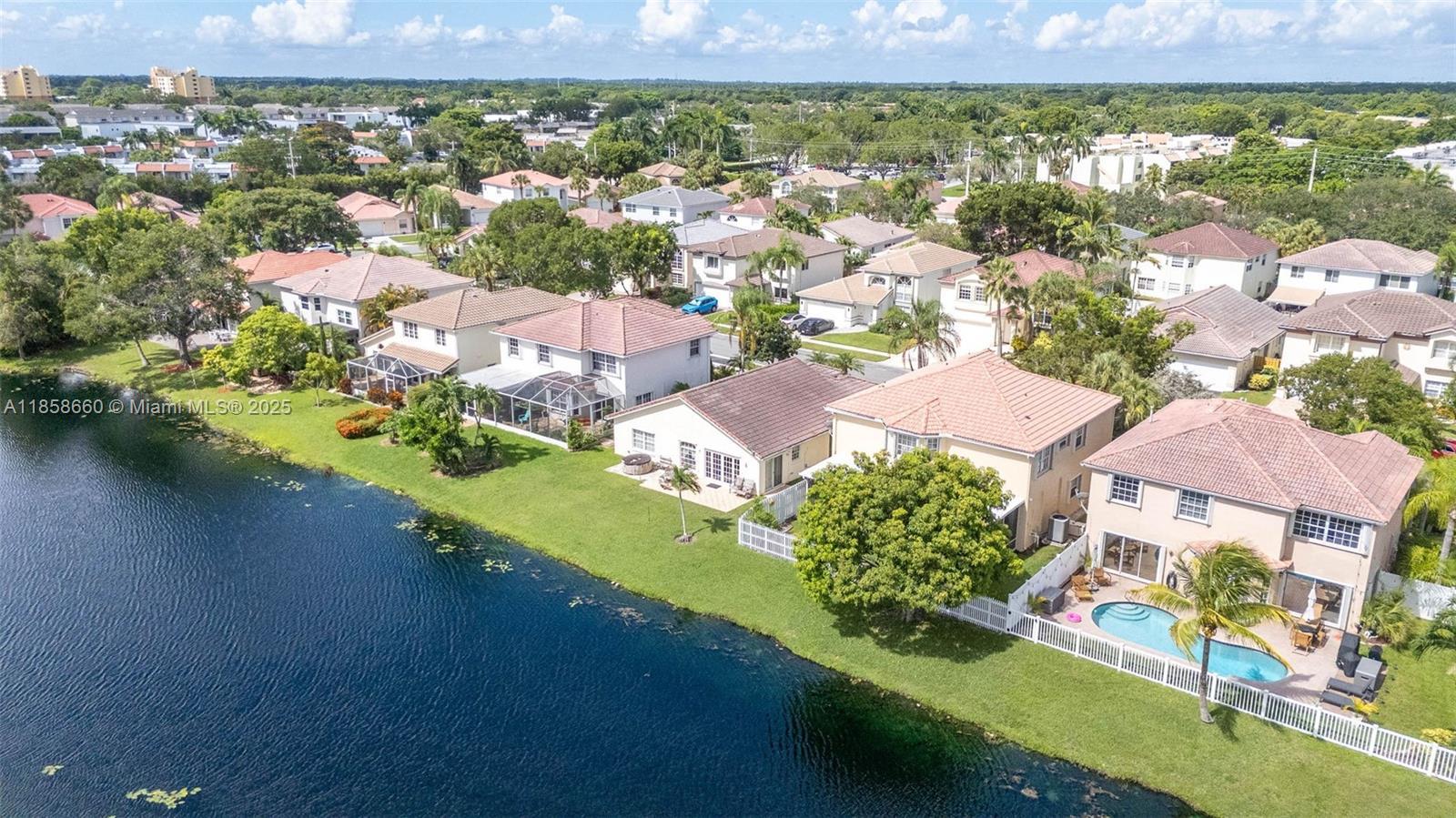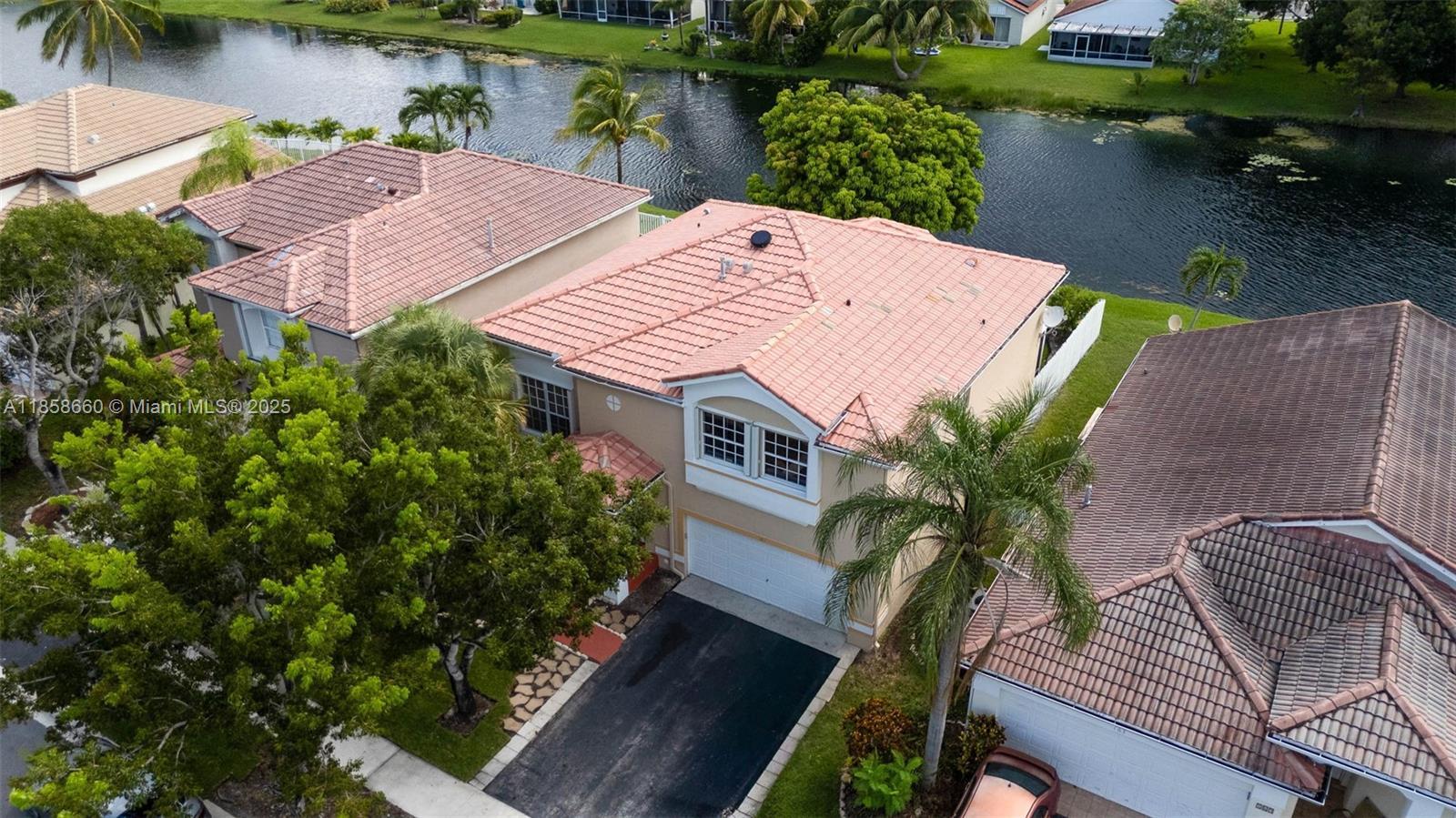 Beautiful Gem in Weston... Two-story home in the highly sought-after community of The Gables. This amazing five-bedroom, four-bath lakefront home is ready for new owners! The home just received a new plumbing upgrade ($25K), has been freshly painted, popcorn removed from the first floor, with living/dining areas featuring remote shades and high ceilings. The first floor bedroom, stairs, and second floor have wood floors. The house includes a built-in generator that can power the entire house during an outage and accordion shutters throughout. Enjoy the stunning covered and screened patio overlooking peaceful lake views. Neutral finishes throughout, house and fence freshly painted, roof just cleaned—it's a must-see! Amazing schools and friendly neighborhood!