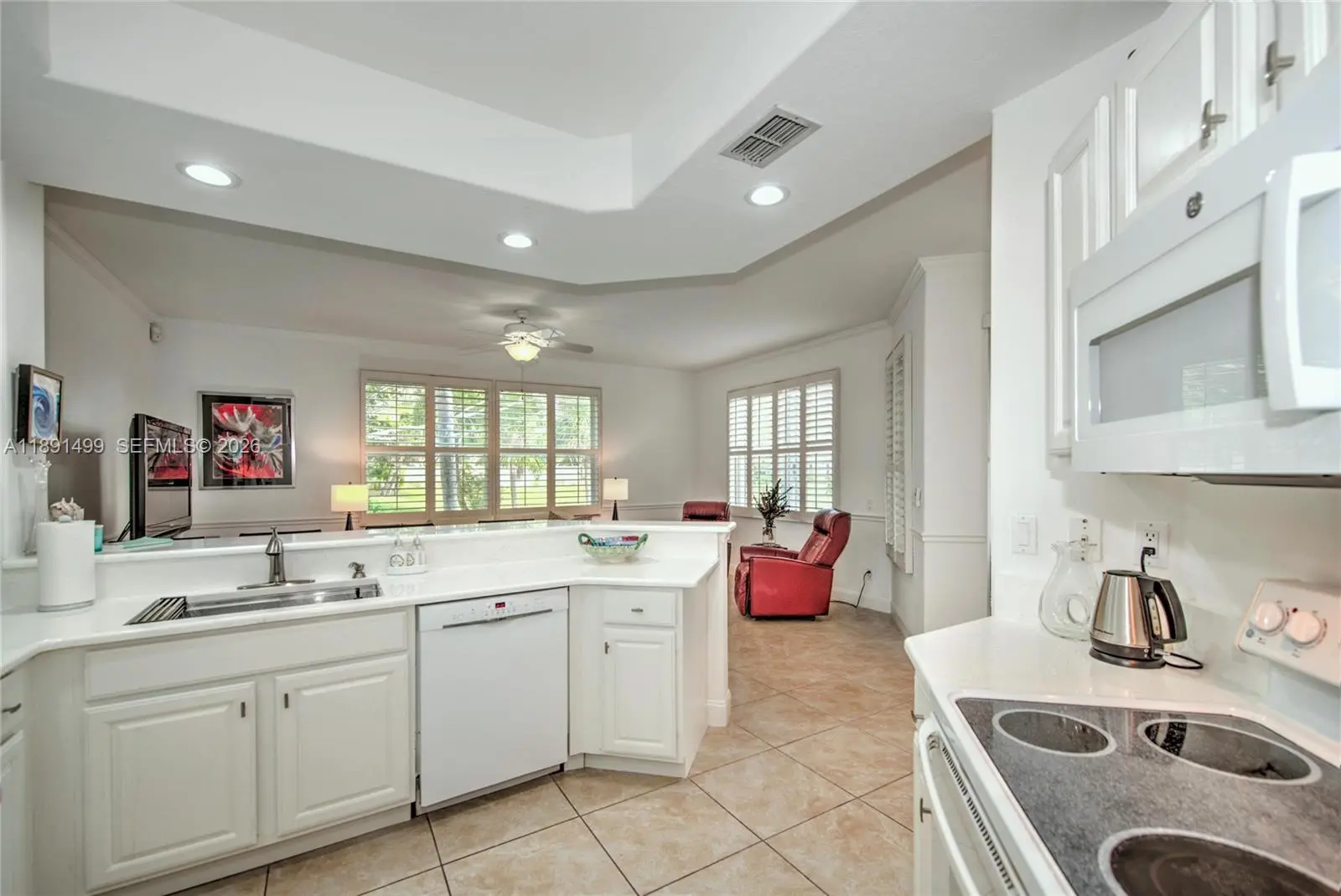 Beautiful, corner unit on serene pond with screened lanai and attached one-car garage. This freshly painted, light and bright unit features 2 bed/2 baths plus den; newer quartz counters, new microwave in open kitchen; beautiful new chandelier in dining room; new LV floors and ceramic floors; new counters and new lighting in both bathrooms; brand-new LC washer and dryer in laundry room. Great, friendly, small community with pool. Whisper Trace is located in Fiddler's Creek, a 5+amenities-rich membership community with 2 pools and 2 restaurants, state of the art gym, tennis, pickleball, classes, events and more. Golf Club memberships is additional. Located 10 minutes from Marco Island, and 20 minutes to Downtown Naples. Available up to 6 months from 1/26.