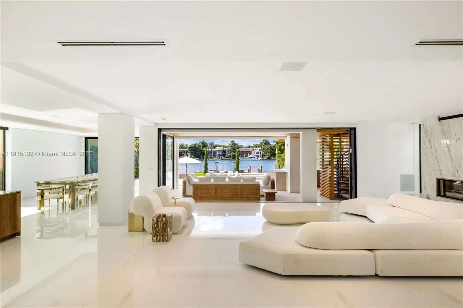 Modern waterfront retreat on gated Hibiscus Island, this residence blends architectural drama with refined comfort & wellness-driven design. Beyond a 23ft steel entry, light-filled living spaces open through telescopic glass walls to sweeping skyline views & spectacular sunsets. The great room centers on a stone fireplace, while the chef’s kitchen features marble & fluted oak finishes, cooking island, illuminated wine wall, Tyent hydrogen system & Control4 automation. Upstairs, a floating staircase leads to 4 beds, including a primary suite with dual lounges, custom dressing room & a spa bath with cold plunge & UV sauna. Outdoors, southern exposure sets a resort tone with a sleek pool & spa, covered lounge, summer kitchen, sunken firepit, 60' of water frontage & reverse-osmosis filtration