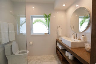 Exquisitely fully furnished modern living space with high ceilings and open airy spaces. White throughout, including large cool terrazzo tiles in the living area and wide-planked Siberian white wood in the bedrooms. High impact windows and doors and custom closets. Immaculately maintained high-end kitchen including marble counters and top of the line appliances. Large lush private canopied/tropical backyard with mature trees and nearly 1/2 acre fenced property with saltwater heated pool. Outdoor shower and patio with awning for all year round entertaining. A tropical paradise! NO DOGS ALLOWED.