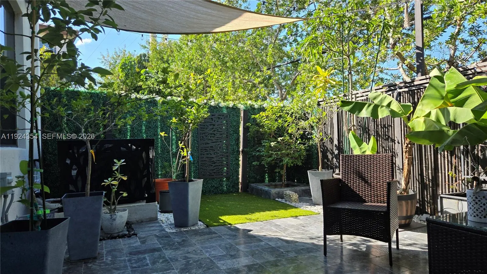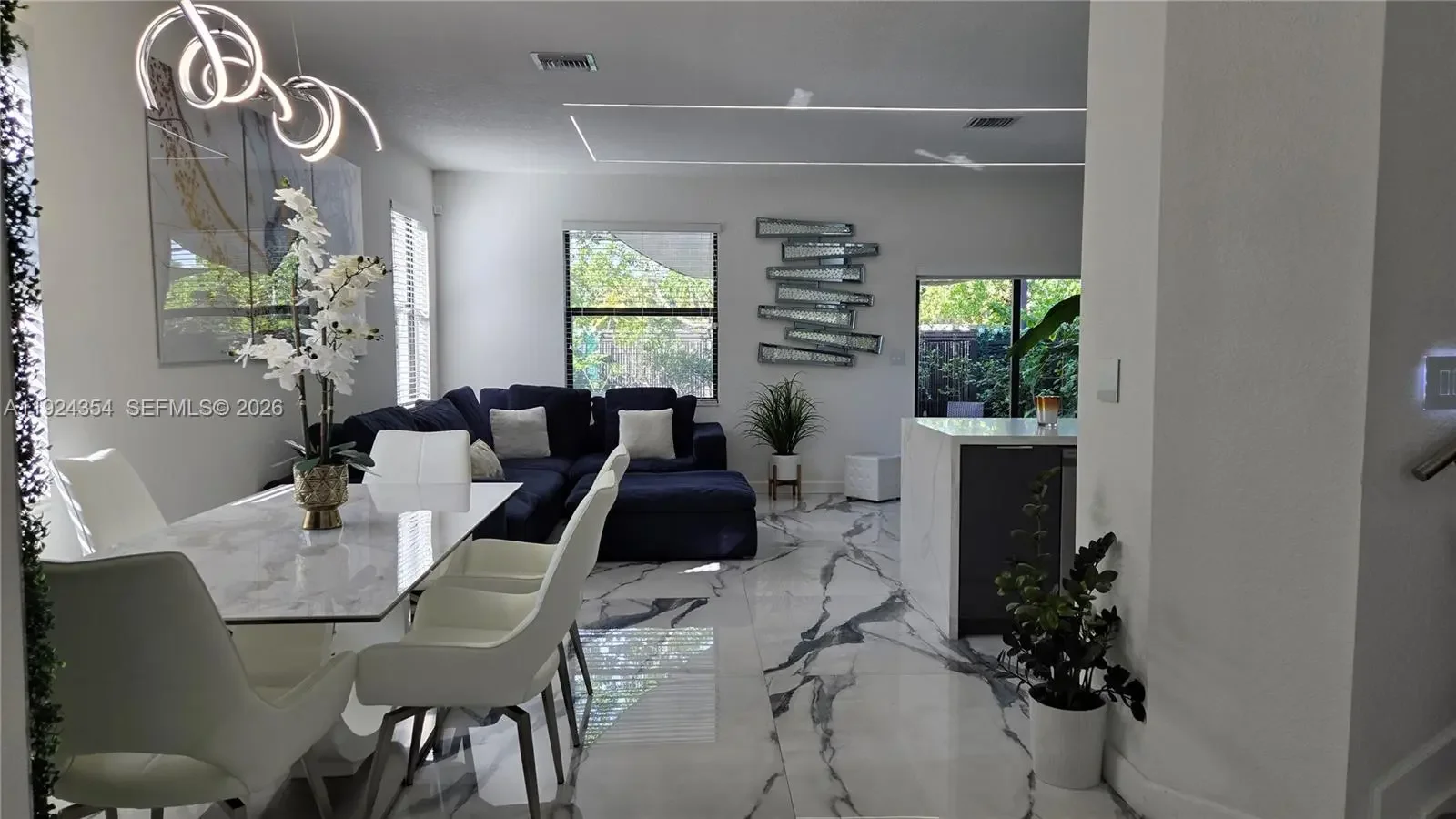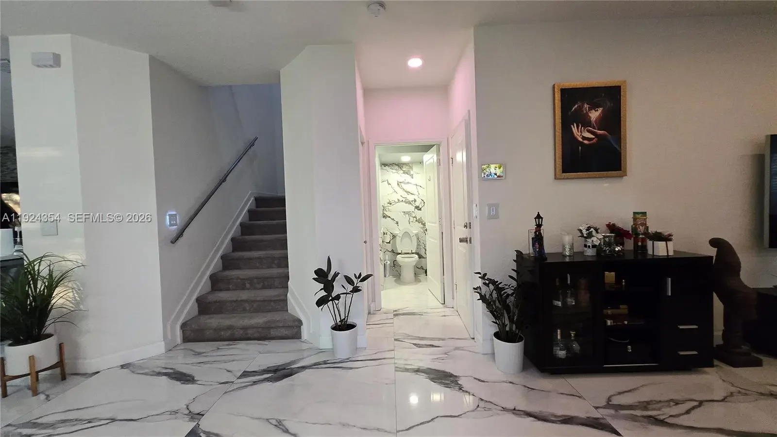 SUBMIT OFFER TODAY! WILL NOT LAST! LARGER CORNER UNIT! Key Features: Beautifully upgraded smart home featuring Ruckus Wi-Fi extenders on both floors, smart thermostat, smart switches/lighting, keypad entry, Ring Camera Pro, Ring Alarm Pro, and Ring Doorbell Pro. Community includes two 24/7 security patrol units. Approved electric car charging station (charger not included). Certified No Flood Zone. Interior: Italian-made tile flooring, designer recessed linear lighting, Armani Italian backsplash, marble accent wall, faux wood blinds, and motorized zebra blind on patio slider. Gourmet kitchen with two-tone Italian Formica cabinets, soft-close drawers, Cabella Quartz counters with triple waterfalls, and backlit glass switches. Master suite includes custom-built walk-in closet with Italian porcelain flooring. Bathrooms feature custom cabinetry and upscale accent walls. Garage & Parking: One-car garage, two-car driveway, apron parking, plus guest parking directly across. Garage upgraded with vinyl plank flooring, creating a yoga-studio–inspired wellness space with space-saving gym equipment and ample storage. Home Systems: Full-home custom color-changing recessed lights, Wi-Fi extenders throughout, and a coated HVAC system with two UV sanitation lights (regularly serviced). Exterior: Custom exterior AC cover, marble tile patio with recessed wall lighting, and luxury touches including grass wall and bamboo accents.