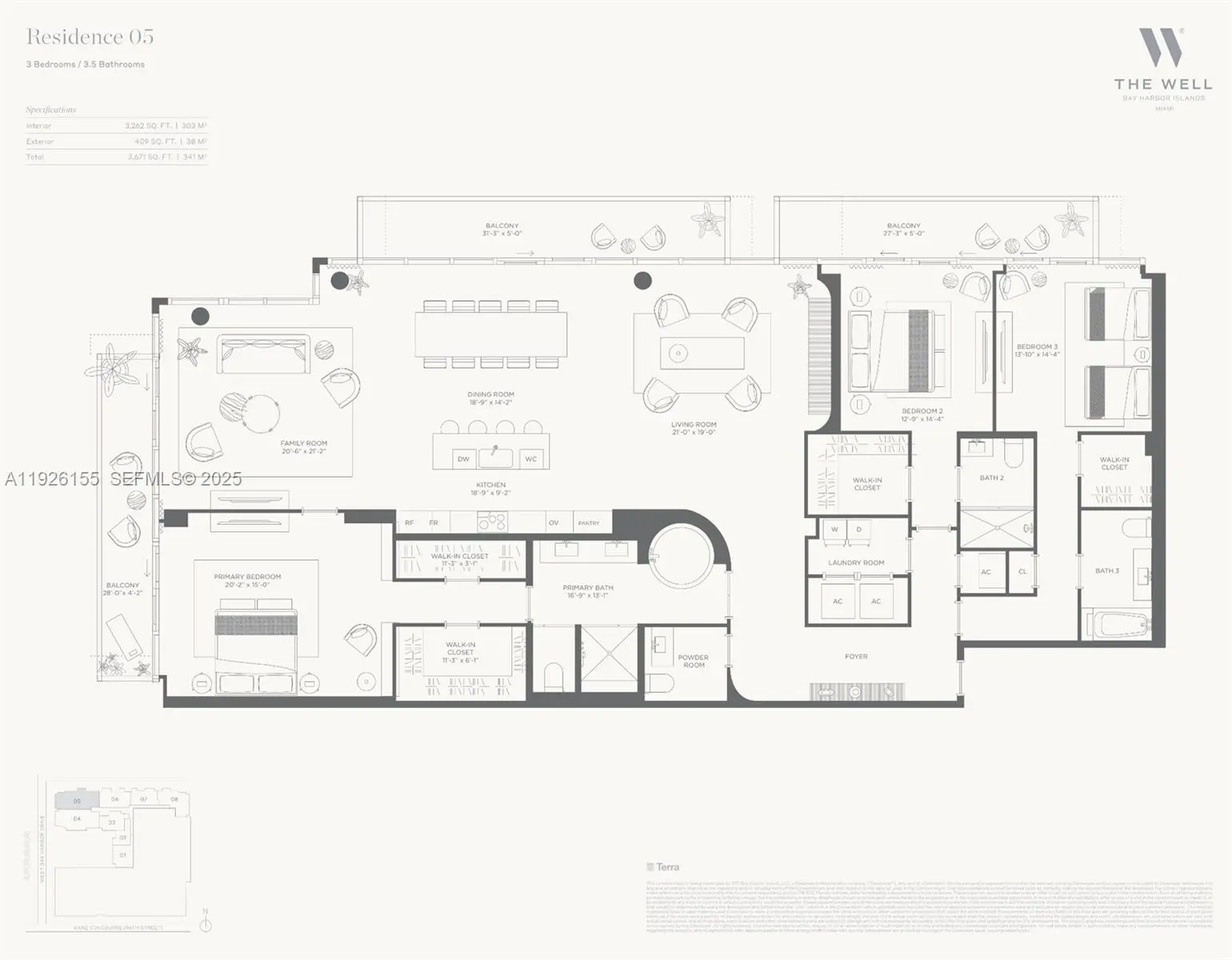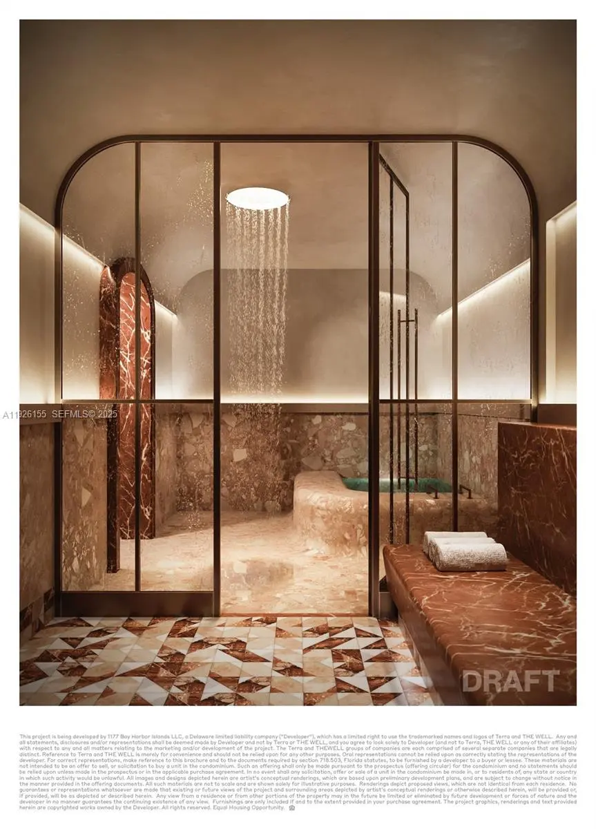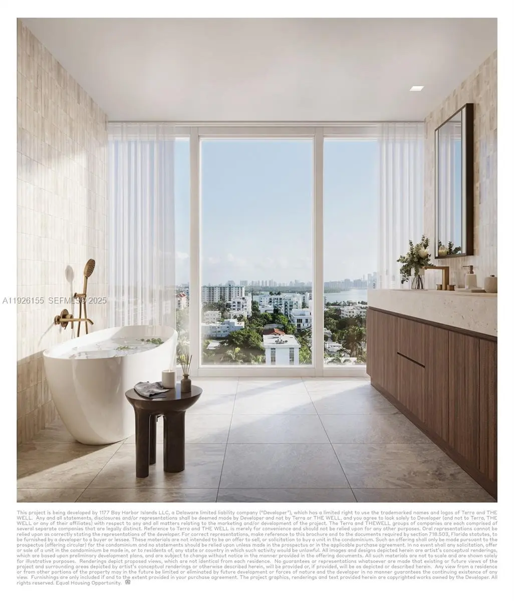 Welcome to The Well, the crown jewel of Bay Harbor Islands' renaissance! Perfectly located in the center of Miami's best live, work, play neighborhood, The Well Residences is a a boutique, low-rise, luxury building designed by Arquitectonica to bring complete health and wellness to the residents. #305 offers 3,262 sq. ft. featuring 3 Bedrooms 3.5 Bathrooms, and 3 large balconies totaling 400+ square feet of outdoor living space. Grand residence offers a formal entrance, a luxurious 60' foot long Great Room featuring stunning quartzite countertops, SubZero and Wolf kitchen, oak flooring, floor to ceiling glass walls, and multiple wide open living areas. 47' foot long Primary bedroom suite with circular spa tub and shower featuring a lymphatic massage hose! This soon to be landmark building features 22,000 square feet of Spa Amenities including a state of the art fitness and wellness center PLUS a Resident only Gym, Rooftop Pool, and Private full service Beach Club! Valet or Self Park for 2 vehicles. New construction, Developer inventory available on 1 to 3 Bedrooms starting at $1.3m Developed by Terra Group & David Martin, Designed by Meyer Davis. Live, work, and play in Bay Harbor and Bal Harbour where health, luxury, and wellness are part of your everyday! New Year, New Home! Delivering health and wellness in the first quarter of 2026! Contact Listing Agent soon for limited developer inventory. Sales Gallery Open Daily at 1160 Kane Concourse, Bay Harbor Islands!