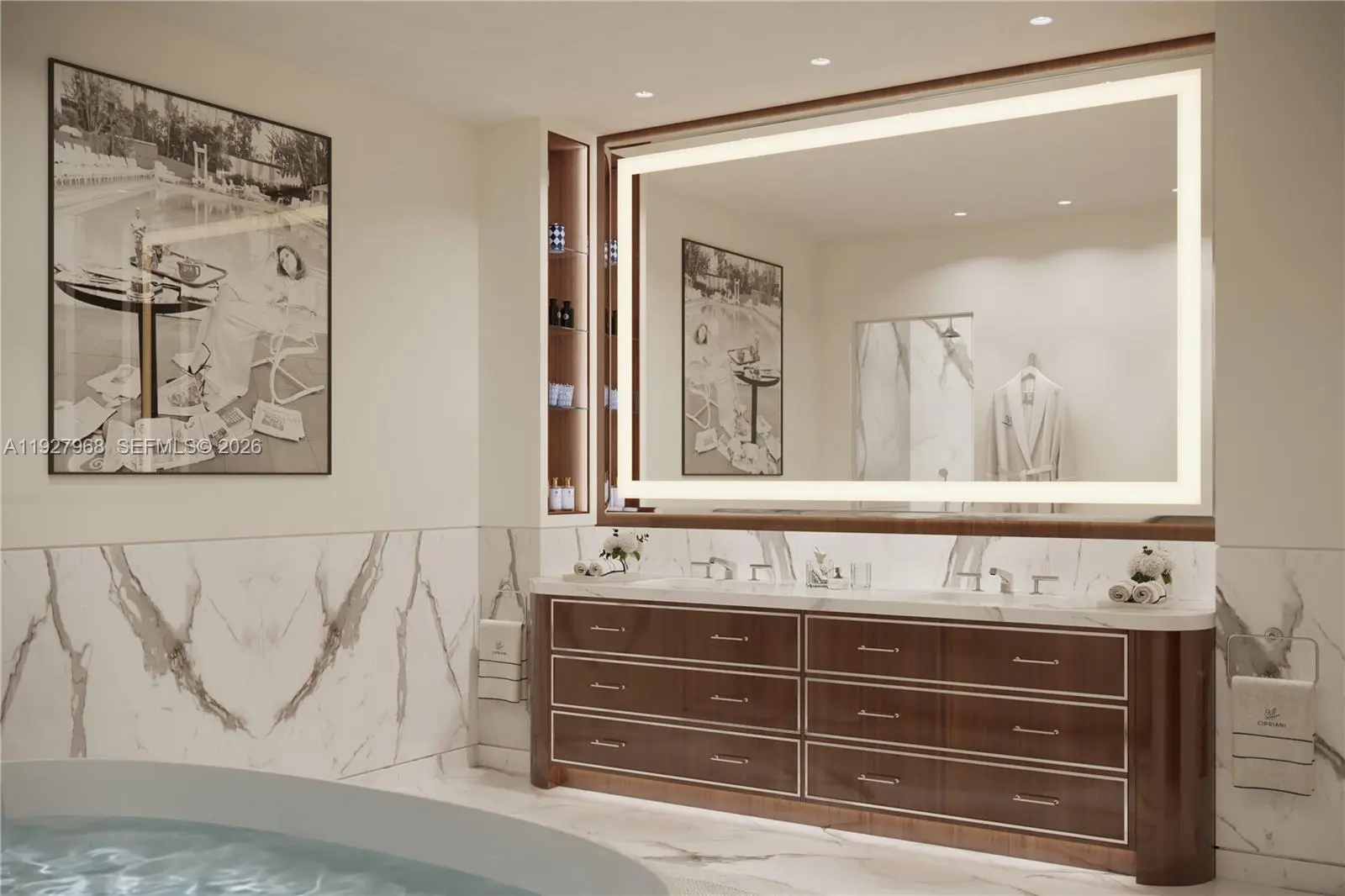 CIPRIANI RESIDENCES MIAMI. Bespoke ultra luxury residence located on the 63rd floor, with breathtaking views and perfect floorplan, private elevator, two bedrooms with a spacious den, three full bathrooms. The eat-in Kitchen is well appointed with custom Italian cabinetry and Wolf and Sub-Zero appliances including wine cooler and integrated refrigerator. Primary bedroom suite includes a gracious walk-in wardrobe and en-suite bathroom with marble floors, freestanding sculptural bathtub and glass-enclosed shower. The amenities serve as an extension of one's home, residents will have exclusive access to private Cipriani dining rooms. Dining services extend to the resort deck, where residents can enjoy a Bellini on the sun terrace or lounge in cabanas beside the 2 swimming pools.