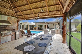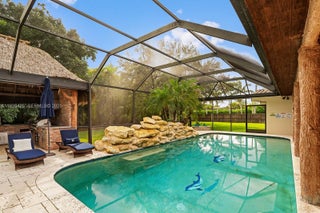 Welcome to Pine Knoll at The Falls — a rare estate home on an oversized corner lot offering exceptional space, privacy, and fully upgraded living. Introducing a resort-style home situated on a private builder's acre and a total of 3,356 sqft. this property offers a luxurious and comfortable living experience. The main house features three bedrooms and two bathrooms, while outside there is a separate cabana with one bedroom and one bathroom. The outdoor area has a screened-in eight-foot-deep pool with a beautiful waterfall and heater, for your convenience. Additionally, there is an outdoor kitchen with a charming Chicago brick under a tiki-style roof. Inside, the home offers an open-concept layout, with the kitchen featuring high-end Viking appliances. The home comes fully furnished and decorated, making it move-in ready for you. This property is the epitome of turnkey living, offering a harmonious blend of comfort and style.