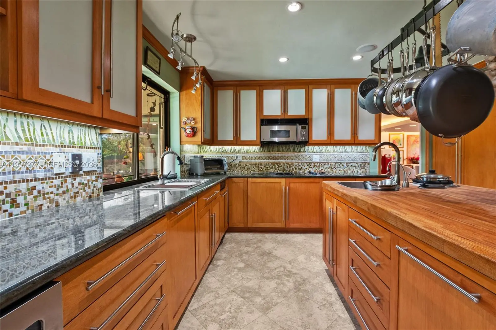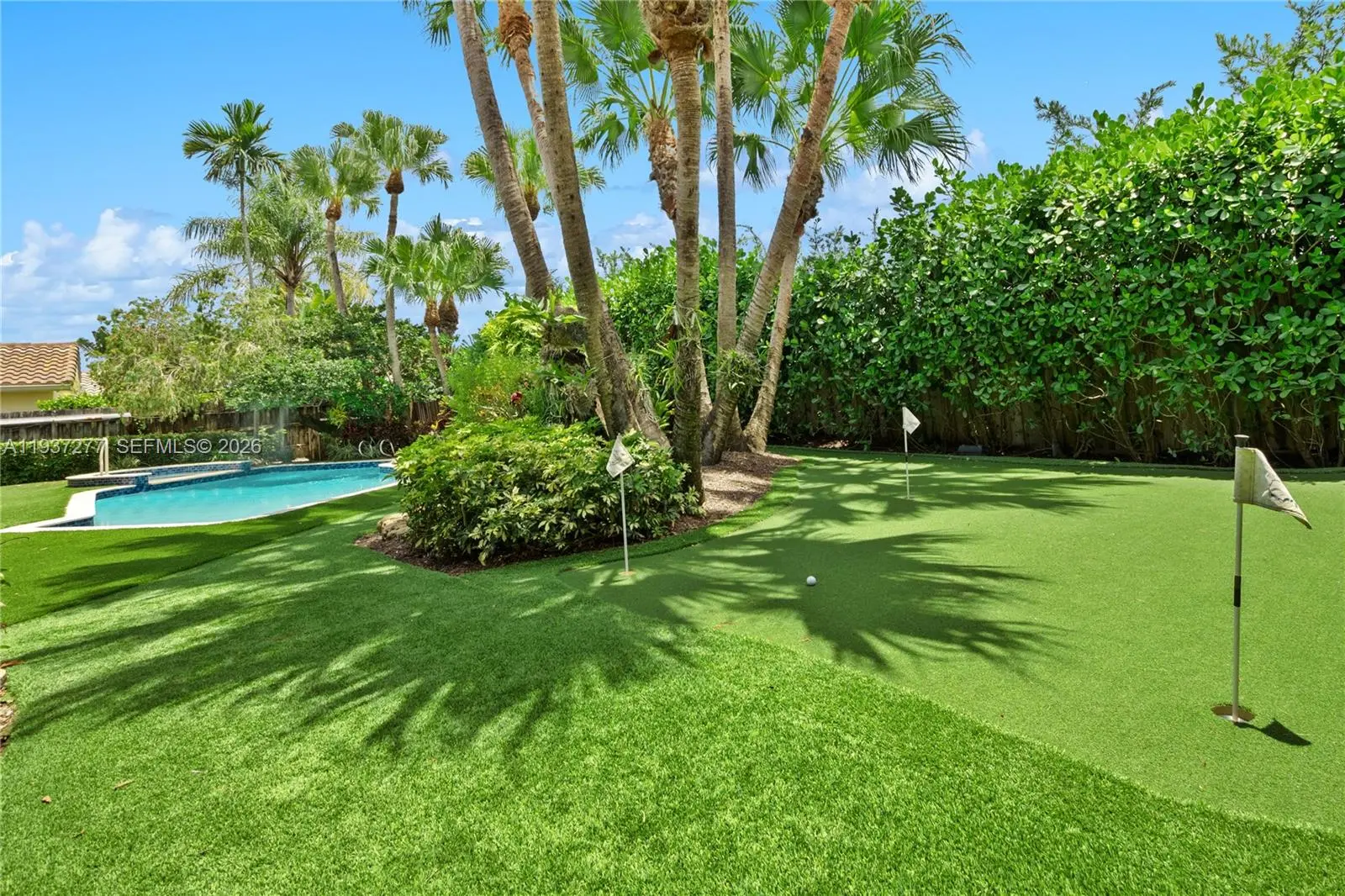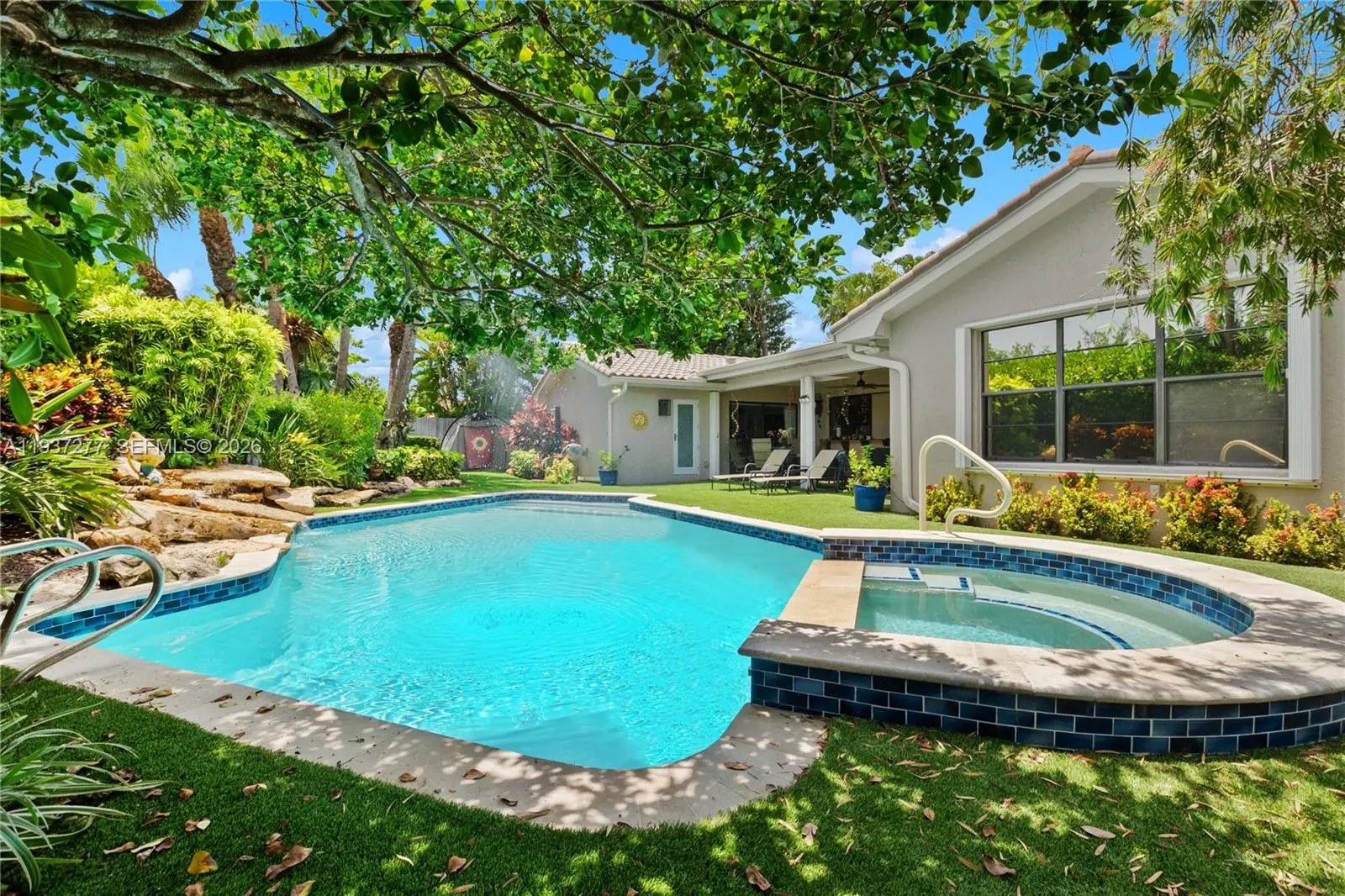 Beautifully updated 4-bedroom, 2-bath home 2700+SQFT home designed for comfortable family living and effortless entertaining. Marble floors highlight the main living areas, with warm wood floors in all bedrooms. The gourmet kitchen features rich wood cabinetry, mosaic backsplash, granite countertops, a wine cooler, center island, and premium stainless-steel appliances including an oversized refrigerator, grill, and double oven. The primary suite offers a walk-in closet, remote shades, and a spa-inspired bathroom with steam shower, bidet, and Culligan system. Step outside to your private backyard oasis with a heated saltwater pool and spa, putting green, covered patio with TV, and 25 mature palm trees—perfect for gatherings and everyday enjoyment. Additional features include hurricane-rated doors, impact windows and shutters, tankless water heater, 5-ton A/C (2022), and Nest system. A wonderful place to call home with motivated sellers—this one is truly special.