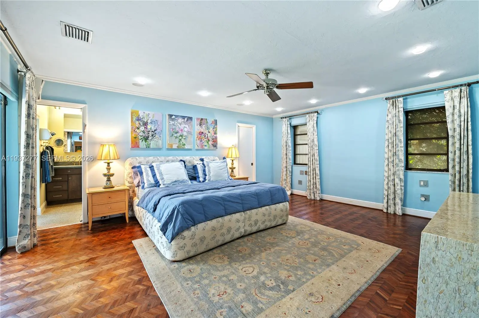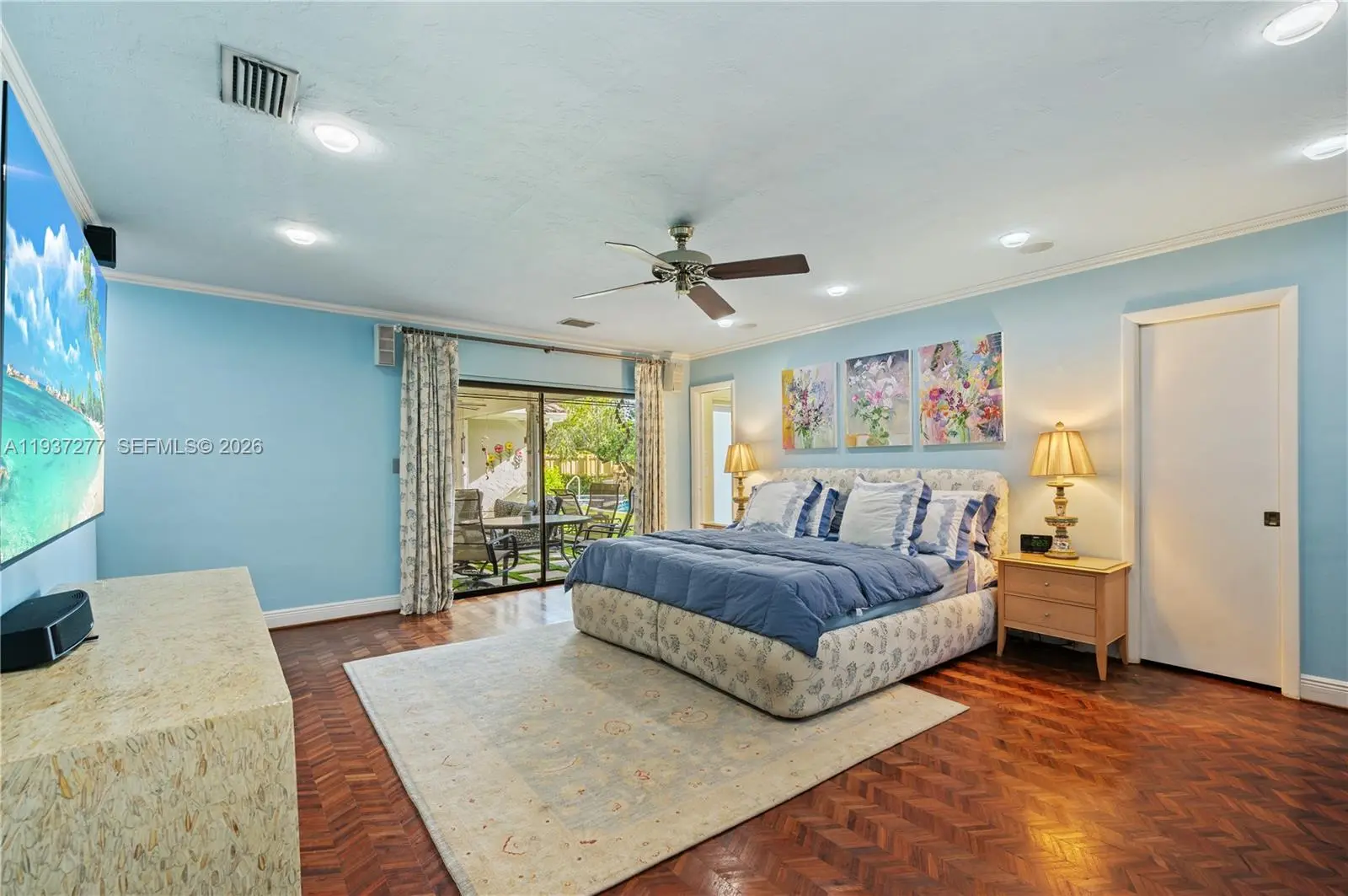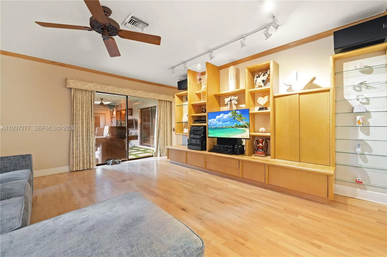 Beautifully updated 4-bedroom, 2-bath home 2700+SQFT home designed for comfortable family living and effortless entertaining. Marble floors highlight the main living areas, with warm wood floors in all bedrooms. The gourmet kitchen features rich wood cabinetry, mosaic backsplash, granite countertops, a wine cooler, center island, and premium stainless-steel appliances including an oversized refrigerator, grill, and double oven. The primary suite offers a walk-in closet, remote shades, and a spa-inspired bathroom with steam shower, bidet, and Culligan system. Step outside to your private backyard oasis with a heated saltwater pool and spa, putting green, covered patio with TV, and 25 mature palm trees—perfect for gatherings and everyday enjoyment. Additional features include hurricane-rated doors, impact windows and shutters, tankless water heater, 5-ton A/C (2022), and Nest system. A wonderful place to call home with motivated sellers—this one is truly special.