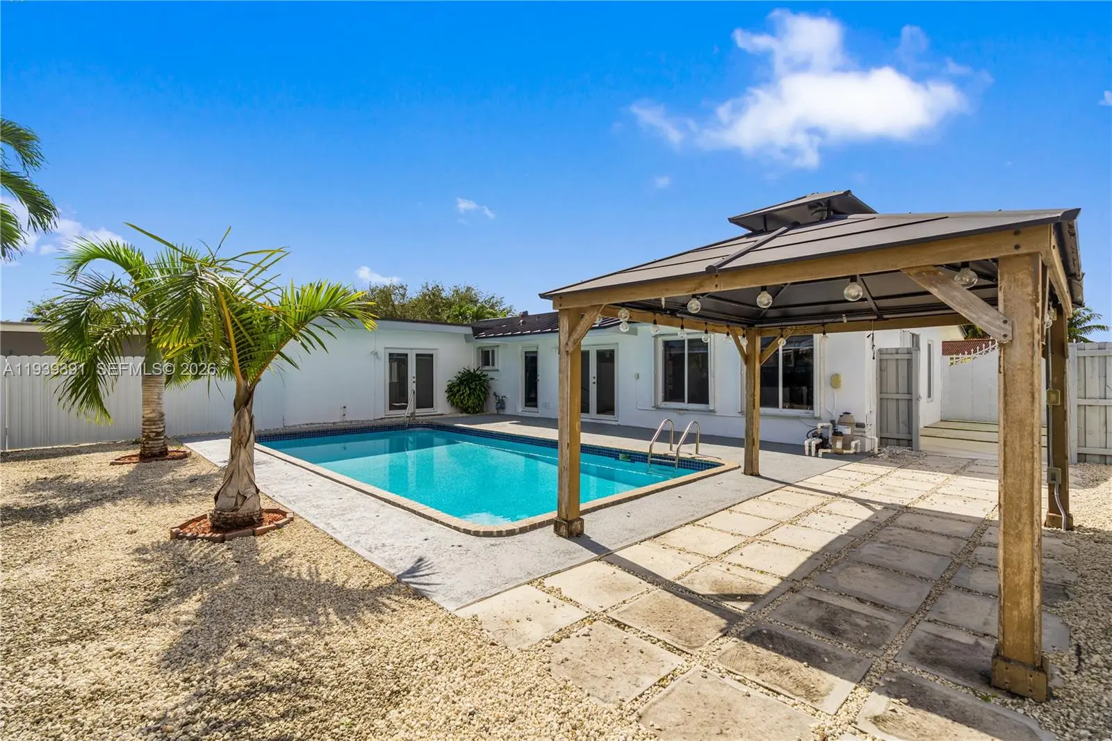 This move-in-ready 4-bedroom, 2-bath residence blends modern upgrades with everyday comfort. Highlights include a durable metal roof, impact windows, and a newly poured oversized concrete driveway. The interior and exterior have been freshly painted, creating a bright, clean canvas throughout. An open, sun-filled living space flows into a renovated kitchen with granite counters and stainless-steel appliances. Step outside to a fully fenced backyard designed for relaxation, featuring a sparkling pool, covered gazebo, and a separate storage structure. Low-maintenance landscaping completes this private retreat, all conveniently located near major roads, shopping, and dining.