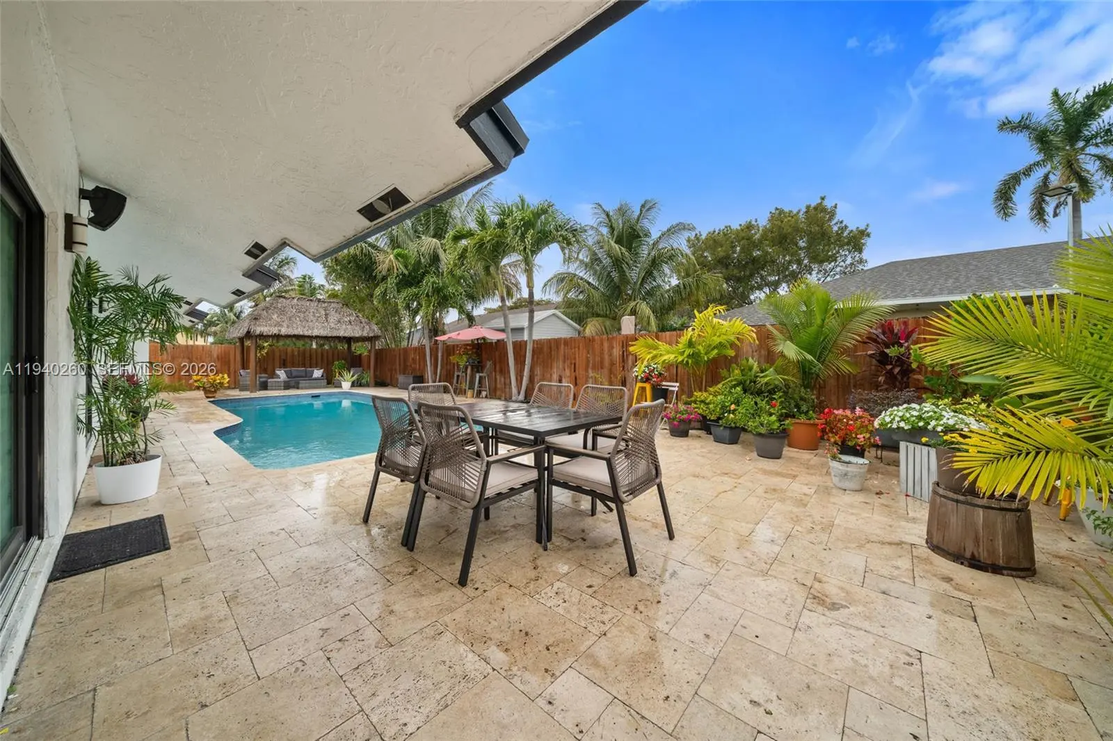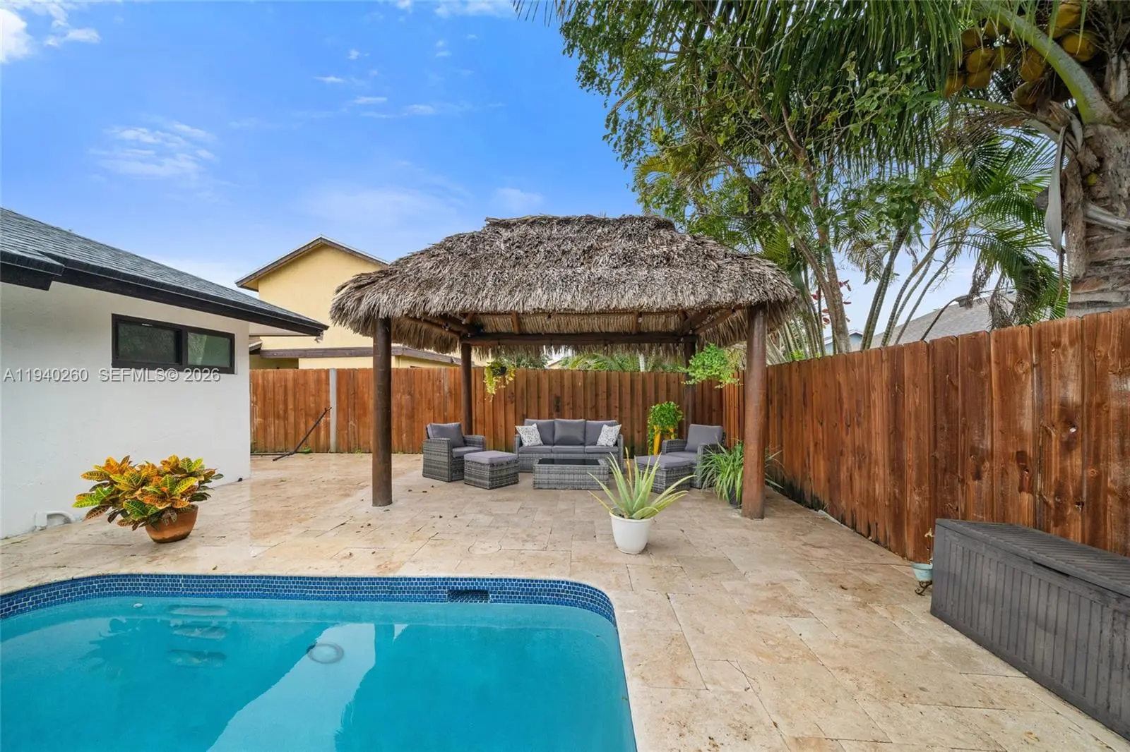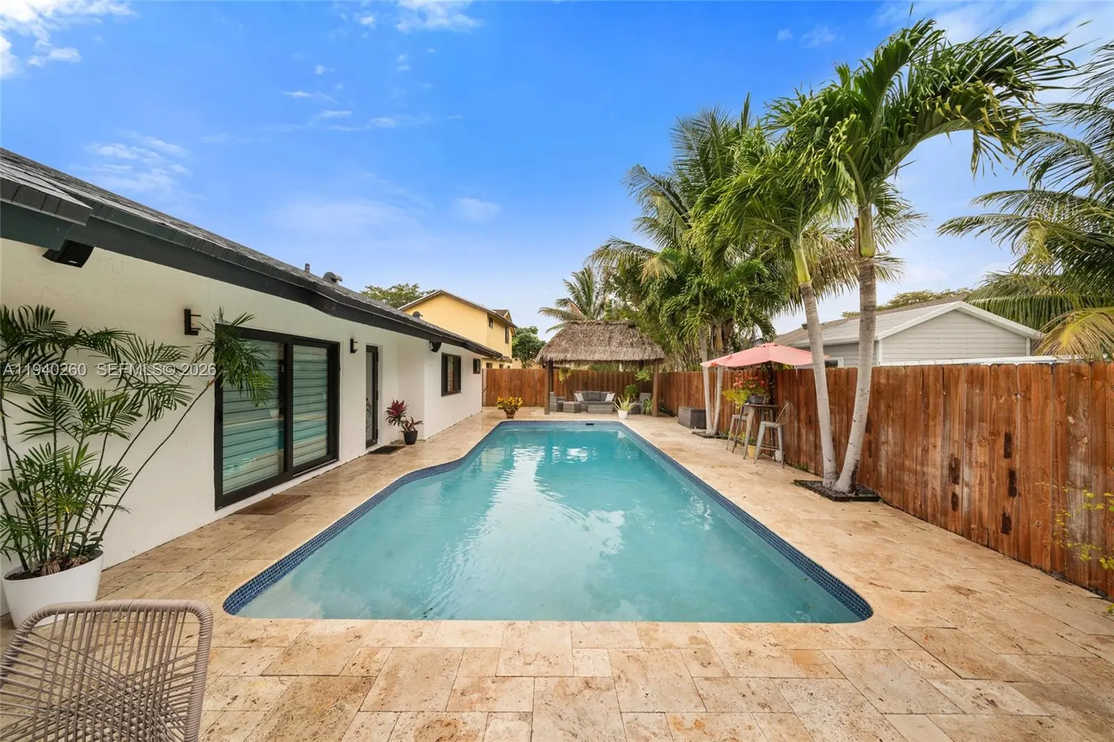 Welcome to your private, year-round summer retreat. This exquisitely remodeled residence showcases a bright, open-concept design ideal for both elegant entertaining and relaxed family living. The home offers three generously sized bedrooms and two beautifully appointed bathrooms, thoughtfully curated for comfort and style. Outdoors, indulge in true resort-style living with a stunning resurfaced pool surrounded by a lush setting. Entertain effortlessly in the chic tiki lounge, fully furnished and equipped with fans and outdoor Harman Kardon speakers, creating the perfect ambiance for unforgettable gatherings. Outdoor security cameras provide added peace of mind while you enjoy your private oasis. Additional luxury features include a circular driveway, two-car garage, impact windows and doors, brand-new roof, and freshly painted interiors and exterior, all reflecting meticulous attention to detail. ? Fast approval An exceptional opportunity to experience elevated Florida living at its finest.