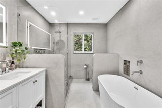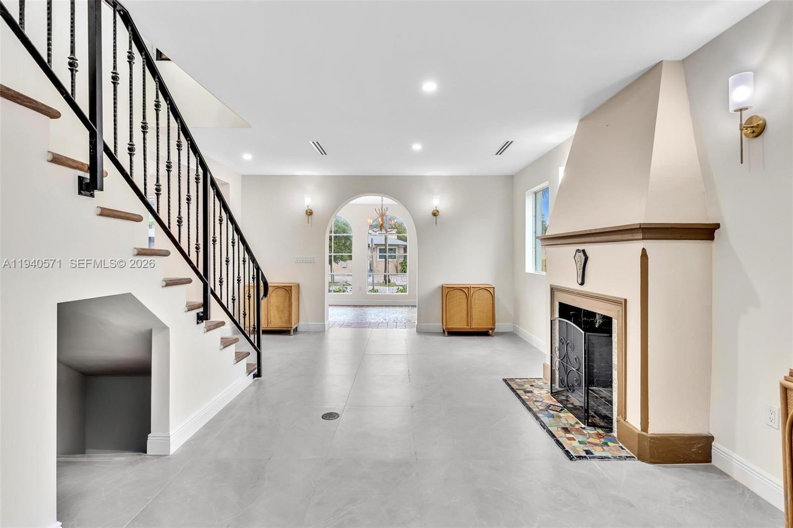 Beautifully renovated two-story Mediterranean residence with a fully detached guest house. The main home features arched windows, elegant tilework, and a bright open layout anchored by a designer kitchen with custom cabinetry, quartz waterfall island, double ovens, and statement vent hood. Living and dining areas flow seamlessly, highlighted by a fireplace, decorative tiled stair risers, and wrought-iron railings. Multiple outdoor spaces include a private upstairs terrace and a landscaped courtyard ideal for entertaining. The detached ADU offers a private entrance, deck, and garden—perfect for guests, extended family, or rental income. Gated parking, tropical landscaping, and multiple patios complete this exceptional property.