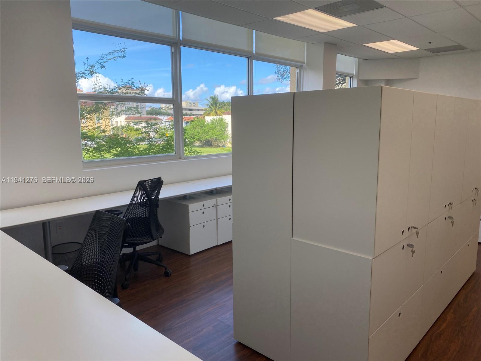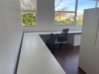 Turnkey office space in The Ponce de Leon Condominium building, 2 offices, a large bullpen area with cabinetry, a kitchen with built-in microwave for eating and relaxing, 974 square feet with lots of natural light because it has wall to wall windows facing north and west. 3 covered and gated parking spaces with 24 hour security system. It is truly a prestigious boutique mixed use building with concierge services and only 9 commercial offices on the second floor, built in 2008. Perfect for an accountant, title company, law office, support services, real estate office, architect office and any other professional office. Only 10 minutes (3.3 miles) to Miami International Airport! This is a gross lease with no extra charges nor CAM to tenant!