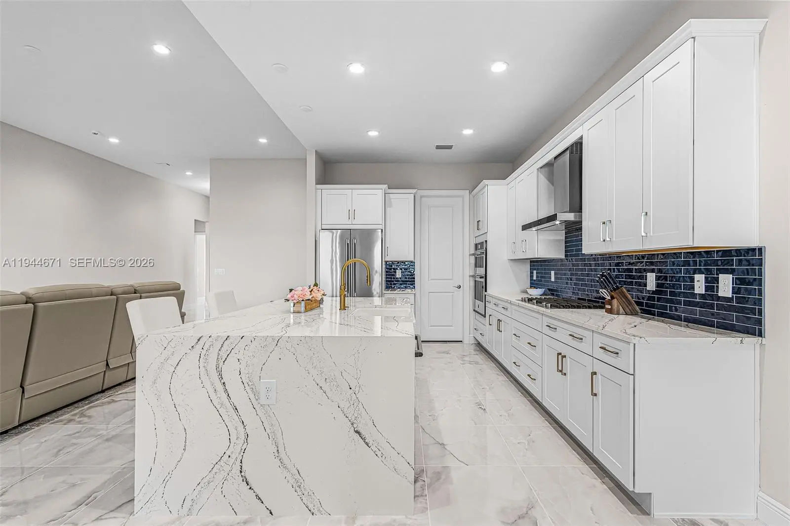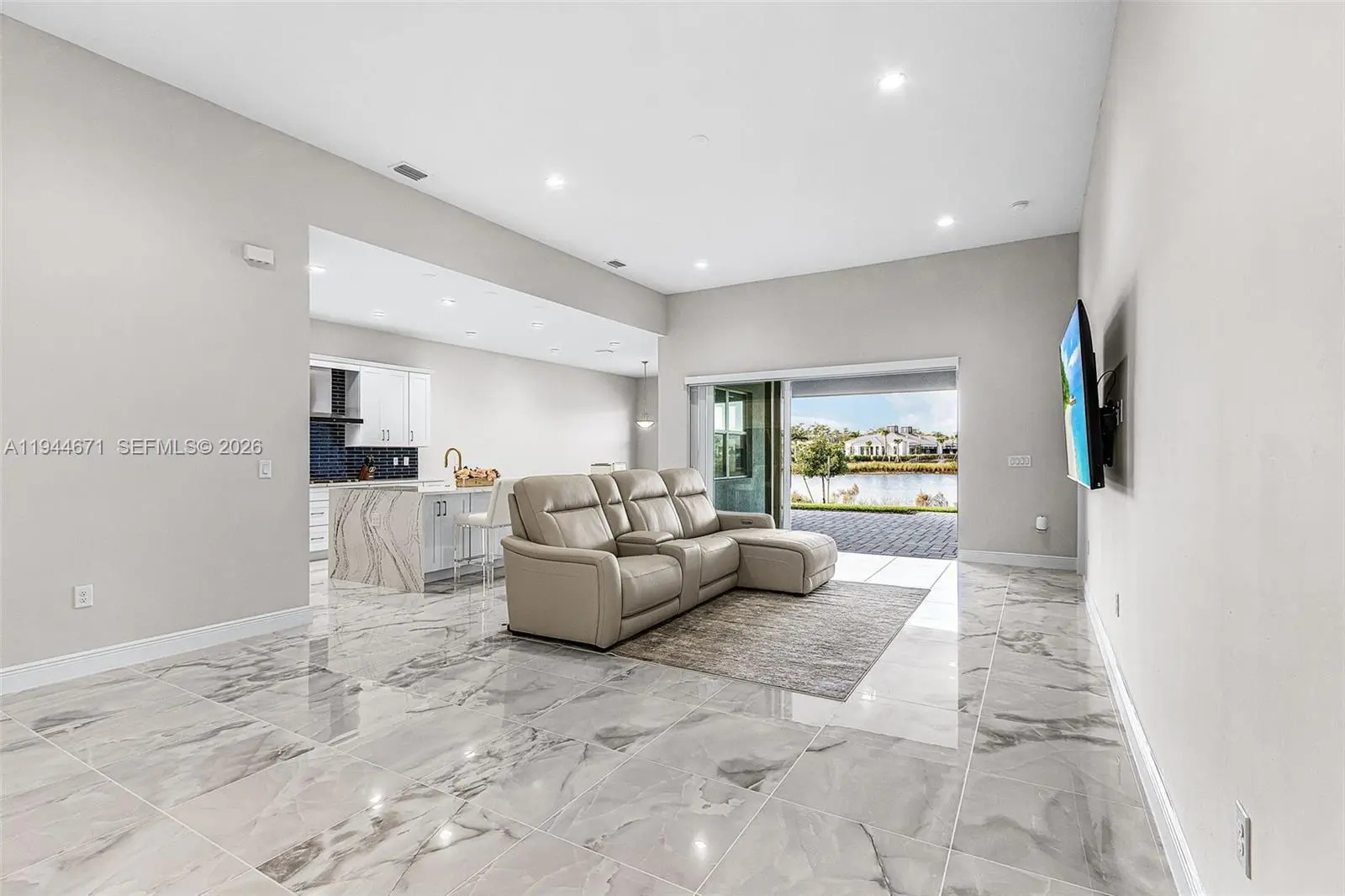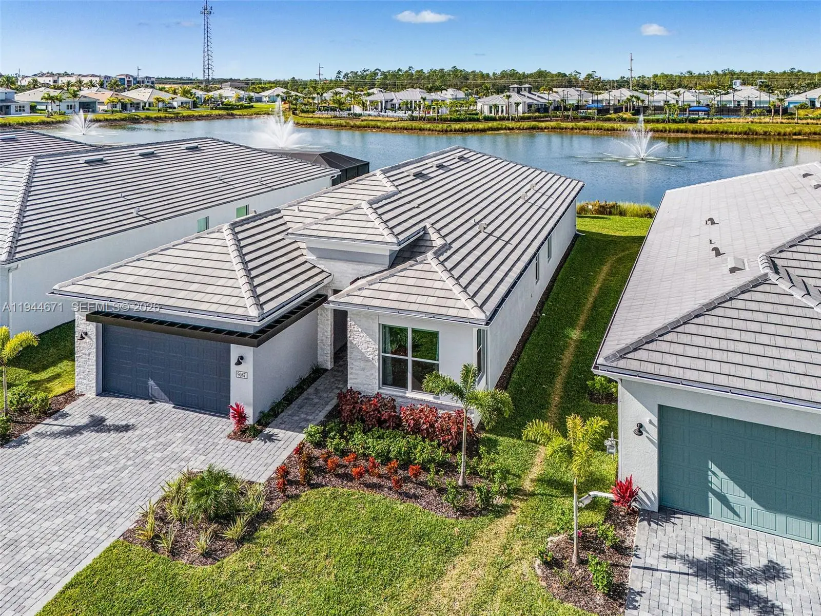 Welcome to this gorgeous Pinellas model waterfront home at Seven Shores in desirable Naples, FL. This brand new, never-lived-in, open-concept home offers 4 bedrooms, 3 baths, soaring 12-foot ceilings in the great room, and an amazing chef’s kitchen, all built to the highest standards with impact-resistant windows and doors. Featuring over $245,000 in upgrades, this showroom-quality home includes luxury finishes throughout, alternate island configuration and upgraded cabinetry in the kitchen, gold-sparkled quartz countertops and designer tile backsplashes and premium upgraded porcelain flooring throughout. The master bathroom includes a beautiful free standing tub, an oversized shower, and shower tiles extending to the full height of the walls. Enhanced lighting with multiple additional recessed fixtures, top-of-the-line Jenn Air appliances, high quality motorized window treatments, multi-slide doors in the living room leading to a spacious patio, an extended covered lanai with a full-height privacy wall, an outdoor kitchen prep package, epoxy-coated garage flooring, gutters throughout, and stunning west-facing water views with breathtaking sunsets. This home is located on a premium, elevated lake view lot, in a rare natural gas and no-flood-insurance community. Seven Shores offers resort-style amenities including an amazing clubhouse, resort style pool, fitness center, pickleball and tennis courts. This home is move-in ready and designed for the ultimate Naples lifestyle.