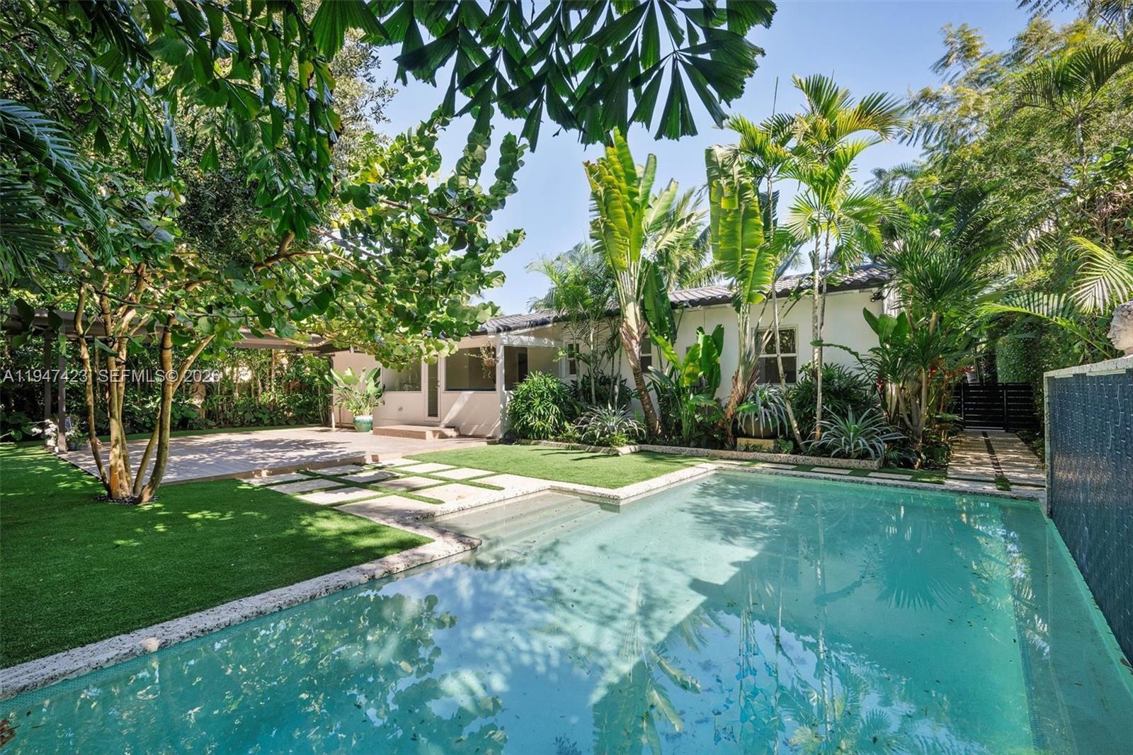 Enchanting villa-style home in Biscayne Park. This move-in ready 3BD/2BA residence features vaulted open-beam ceilings, wood floors, custom closets, Italian kitchen and washer/dryer. Enjoy a heated custom pool with waterfall, outdoor dining area and lush landscaped yard with automatic irrigation. Landlord includes pool and lawn maintenance. Fast approval. Move in ready. A rare and serene rental opportunity that won't last.