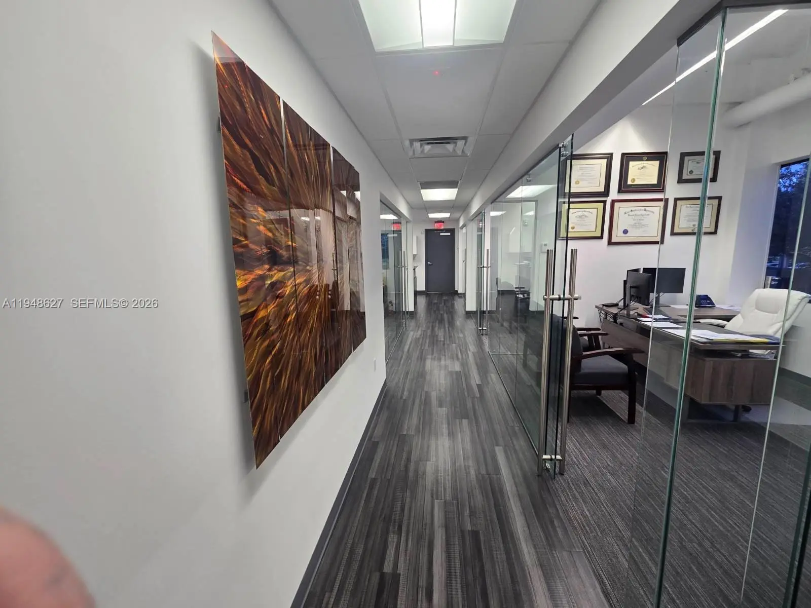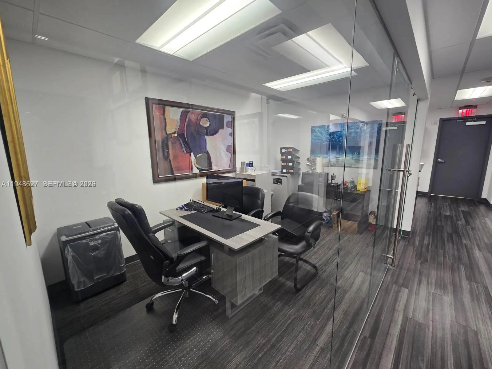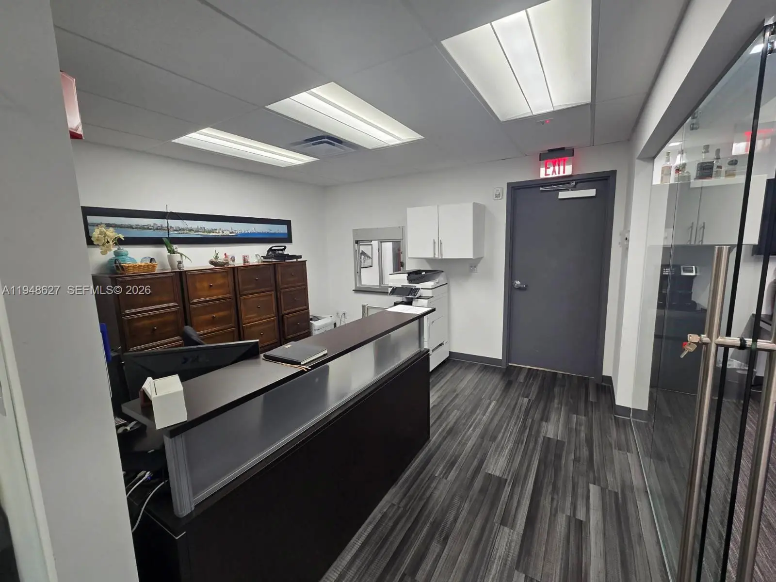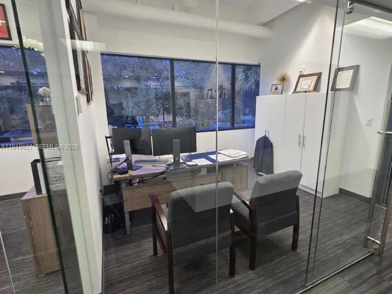 Modern professional office suite for lease at 14261 Commerce Way in Miami Lakes, FL. The space features beautiful, high-end finishes with glass walls throughout the private offices, lobby, and conference room, creating a bright and contemporary work environment. Located in a professionally managed office building that was renovated in 2019, the property offers a polished corporate image ideal for professional services such as legal, accounting, consulting, or financial firms. Conveniently situated near major roadways, business services, and amenities, this move-in-ready suite provides an excellent opportunity for companies seeking quality office space in a premier Miami Lakes location.