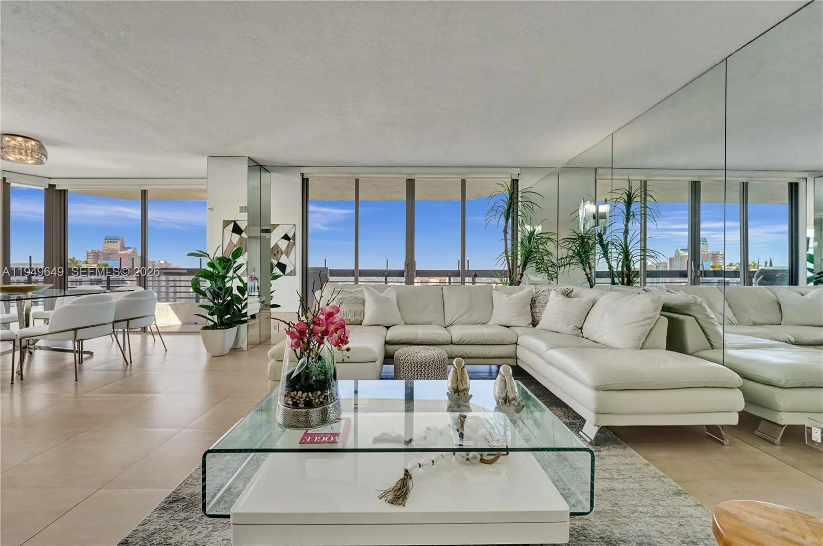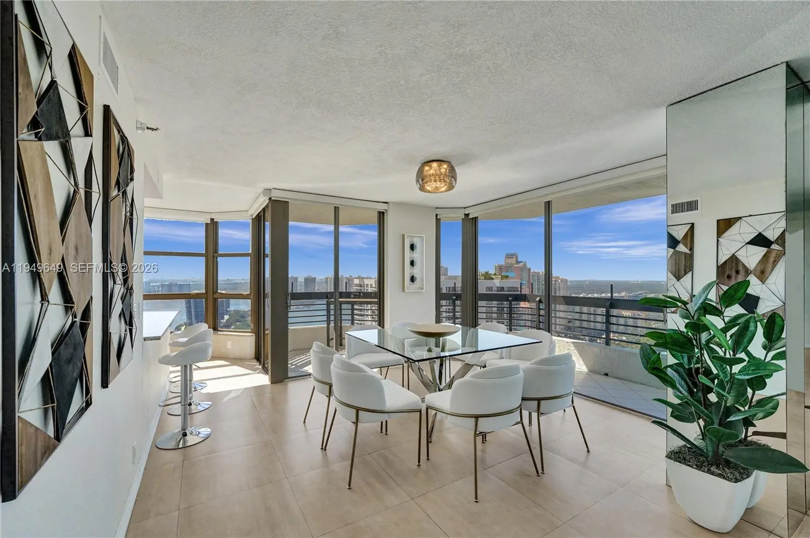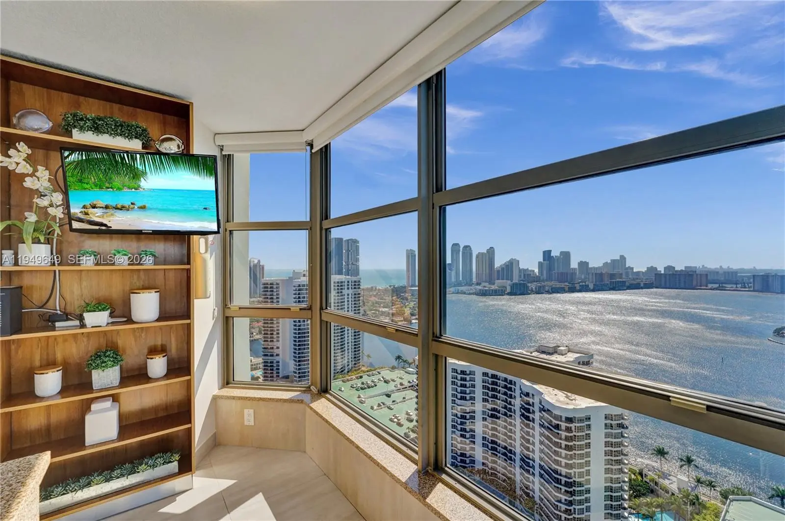 Enjoy spectacular and unobstructed east, south and west views of the ocean, Intracoastal, marina, golf course, cities of Aventura and Sunny Isles Beach from this beautifully remodeled and spacious three bedrooms, three baths corner unit with wraparound balcony and 1,714 Sq. Ft. of living area. This condo is beautifully decorated, only offered fully furnished and equipped ready to enjoy, just bring your cloths. Features tile floors throughout. Open kitchen with stainless steel appliances, wood cabinets, granite counters and backsplash. Separate-laundry room. Mystic Pointe, an all-inclusive, gated community providing an active lifestyle with eight lighted clay tennis courts, four lit Pickleball courts, paths along the bay, playground, mini market, restaurant, salon, dog-park and marina. It is located minutes from the Aventura Mall and beaches.