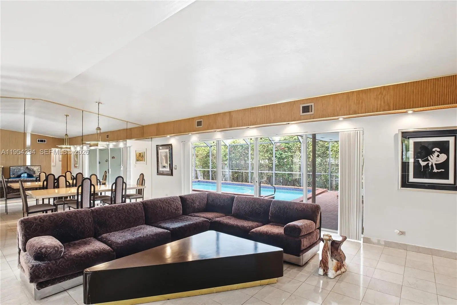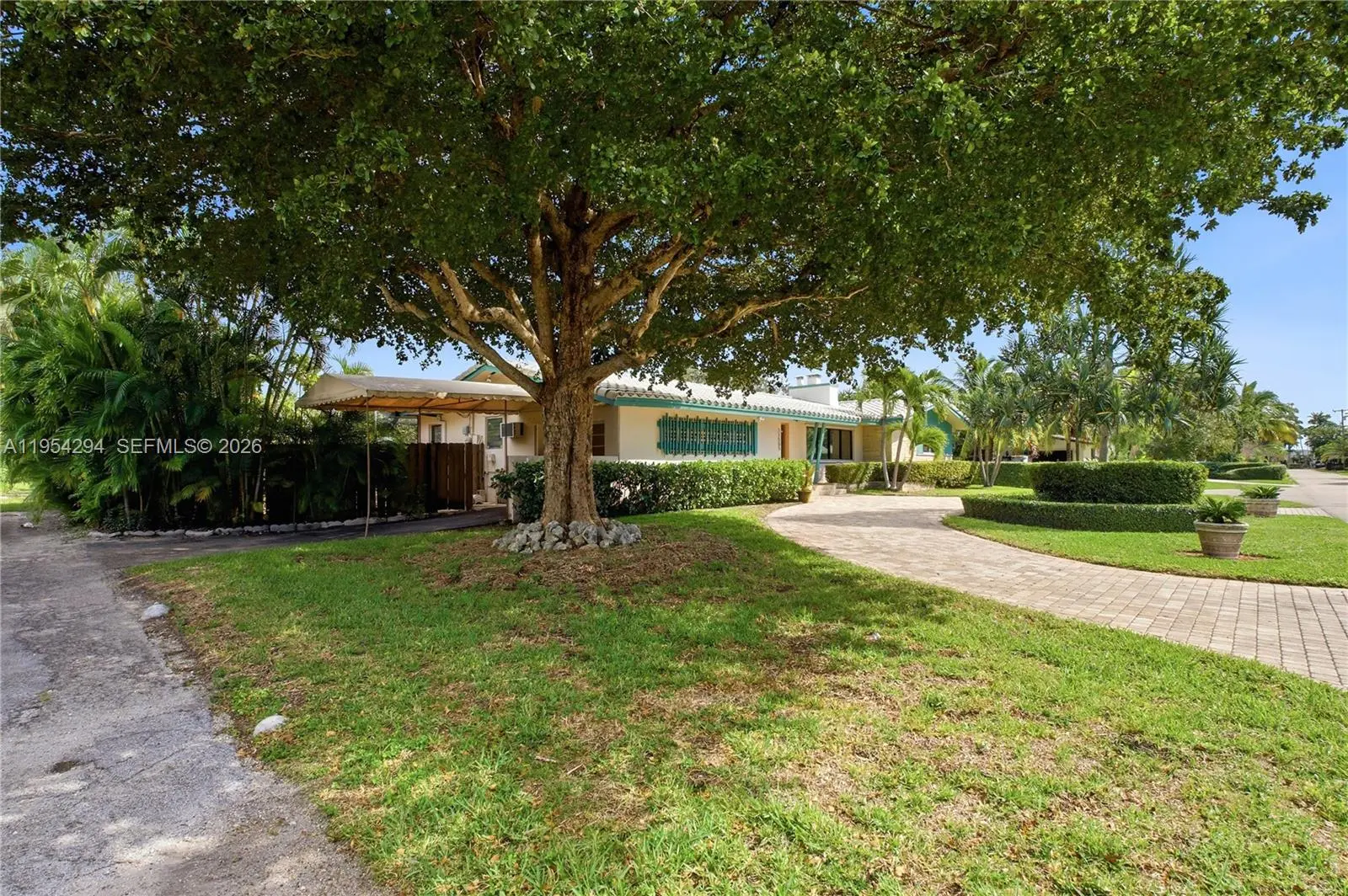 Welcome to this 3-bedroom, 2 1/2-bath corner-lot residence located in the prestigious 24-hour police guard-gated community of Sans Souci Estates—no HOA. Situated on an oversized 10,287 sq. ft. lot, this property offers exceptional space, flexibility, and potential. The light-filled living room features vaulted ceilings, and a decorative fireplace that adds warmth and character. Enjoy seamless indoor-outdoor living with a screened pool and patio, plus ample backyard space ideal for entertaining, grilling, or relaxing. Tile and flat roofs were replaced in 2017. Additional features include a side carport, indoor laundry, and 2,944 sq. ft. under roof. Due to its prime location and generous lot size, the property also presents an excellent opportunity to build a custom new construction home. Ideally located just minutes from the beach, Bal Harbour, Whole Foods, shopping, and major highways, this is a rare opportunity to renovate, reimagine, or build new while enjoying the security, prestige, and convenience of Sans Souci Estates.