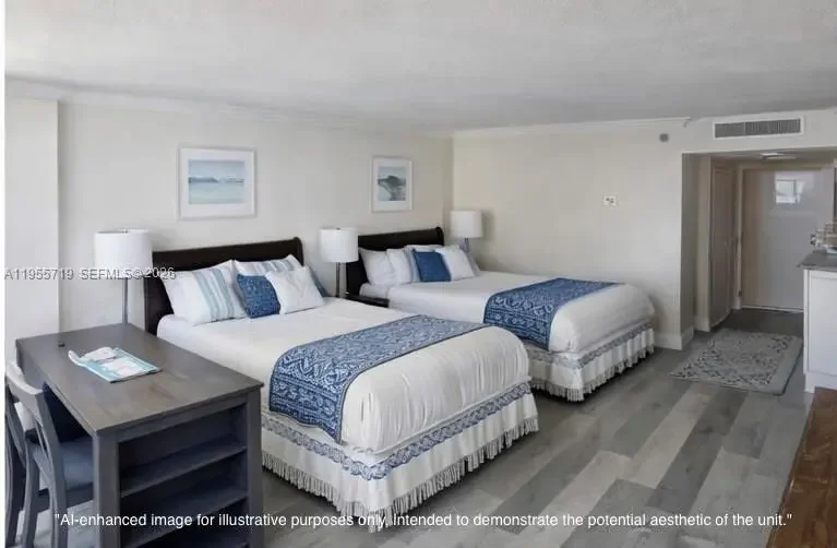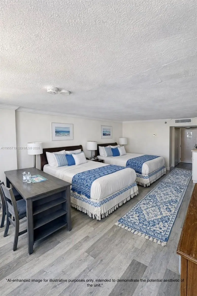 Own a Slice of Paradise in Sunny Isles Beach! This fully furnished condo offers direct beach access and the ultimate in flexibility—perfect for personal use or an investment property. The building offers onsite support to help secure guests when you're away. Inside, you'll find impact windows, laminate flooring, kitchenette, dining area & two queen size beds. HOA dues include water, electricity, basic cable, and Wi-Fi. Enjoy resort-style amenities such as a remodeled pool, pool bar, full beach service, café, laundry facilities and shops. Monthly Maintenance fee is $1798.51 (maintenance fee: $1,273.28, Reserves: $163.03, Special Assessment: $362.20). Total amount of Special Assessment is $43,464.26, to be paid over ten years, ending October 2034. ***AI-generated images show the unit’s aesthetic potential. If buyer offers full price, seller will provide a $3,000 credit at closing toward updates.***