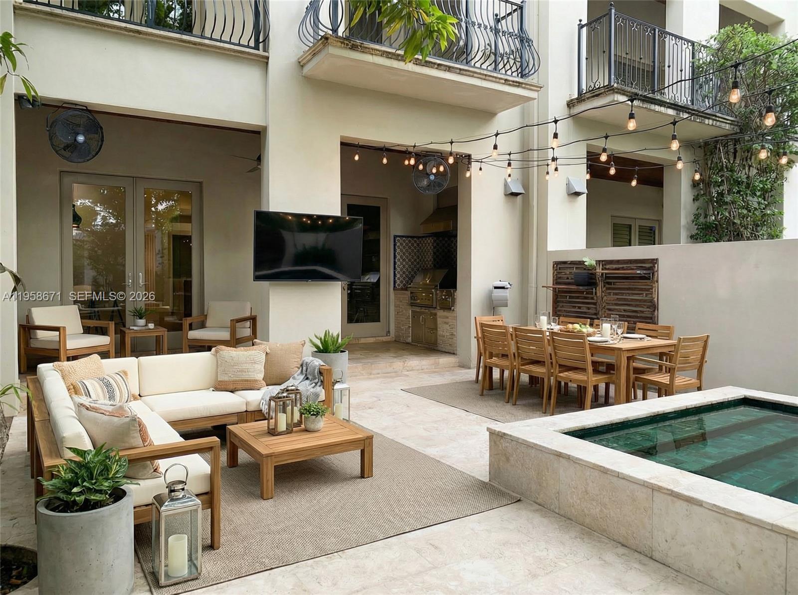 Elegant and desirable three-story residence at gated Townhomes at Oak Lane, ideally located in the heart of South Miami in High Pines. It combines luxury and convenience, featuring a private elevator, marble and wood floors, and impact windows. The open living area centers around a stylish wet bar, with ice maker, beer tap and wine cooler—perfect for entertaining—and a modern kitchen outfitted with gas stove, Wolf and Sub-Zero appliances. The family room opens to an inviting patio with an outdoor kitchen, cocktail pool with relaxing waterfall. Covered private and secure parking for four vehicles, abundant storage, laundry, and a full-house generator add everyday comfort. The large primary suite includes a sitting area, large closets, and an expansive private balcony retreat. Extra space with a full bath can be an office, gym or guest bedroom. Walk to South Miami’s favorite restaurants, shops, and the University of Miami; just minutes from Coral Gables, Coconut Grove, and Brickell. Refined urban living at its best near top public and private schools. Easy to show.