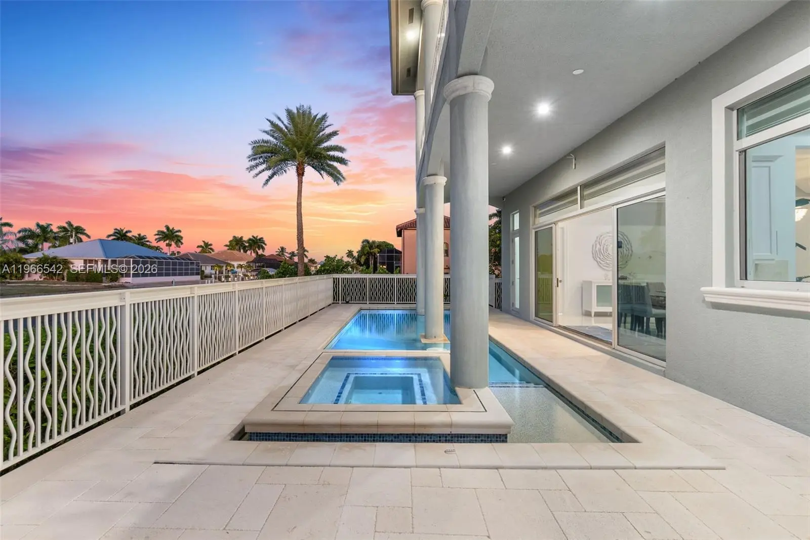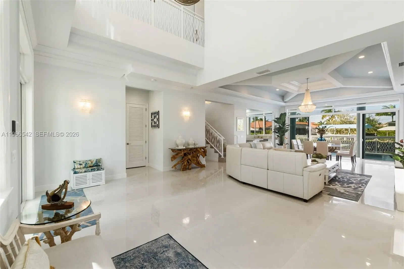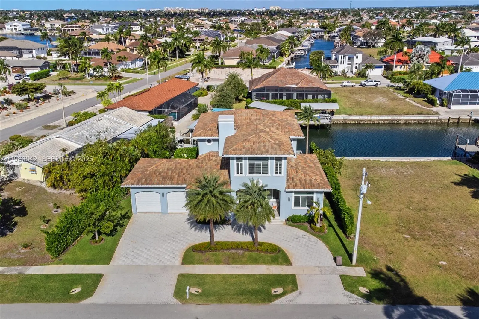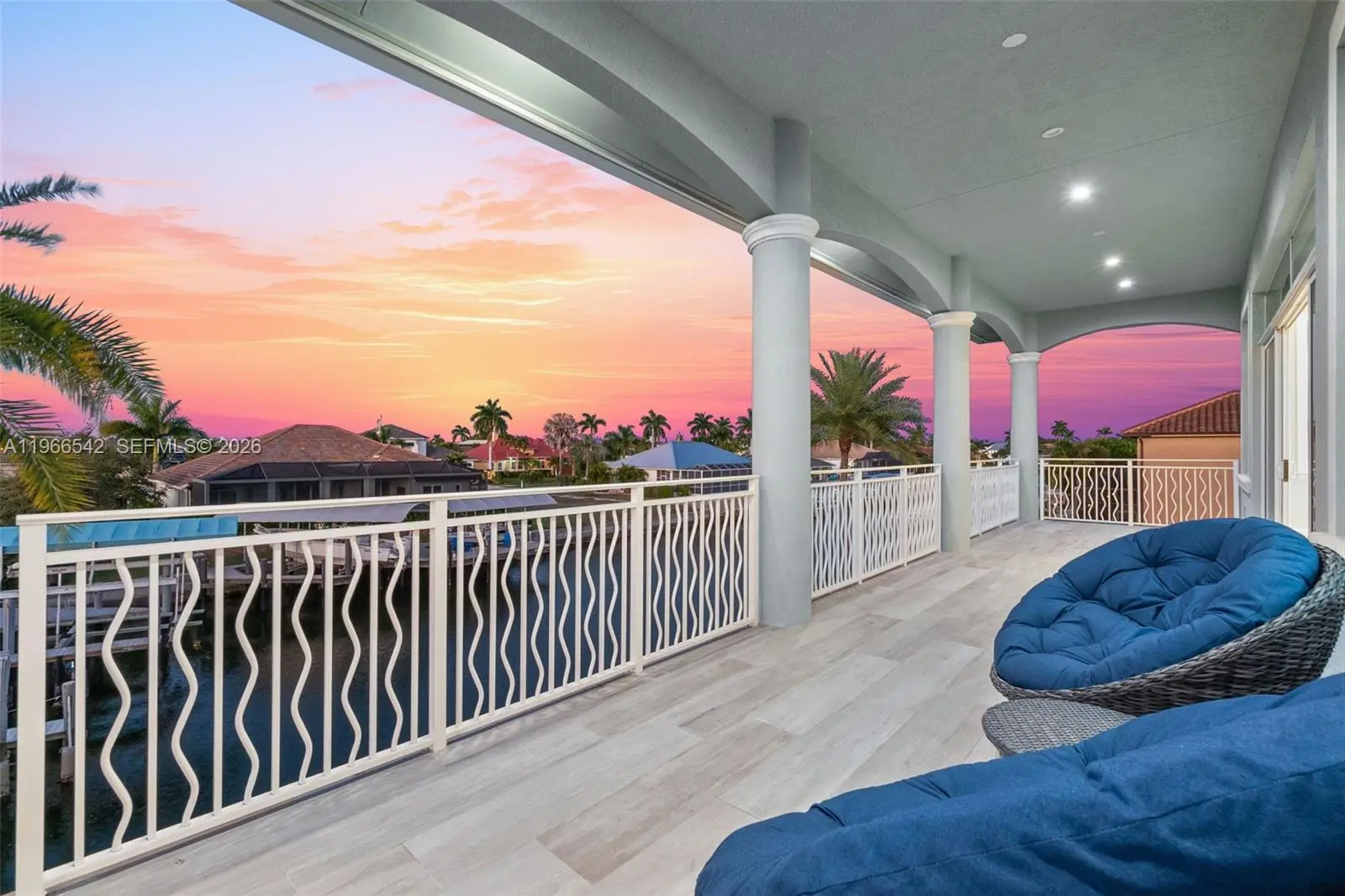Luxurious fully furnished Marco Island waterfront residence, professionally decorated and move-in ready. This 4-bedroom, 4-bath home blends refined design with effortless coastal living, showcasing tranquil channel views and water access with potential for dock addition. Soaring 24-foot ceilings, porcelain flooring throughout the home and balconies, wood crown moldings, and custom coffered ceilings create a grand yet inviting interior. The open-concept living and dining areas are filled with natural light and designed for entertaining. The chef’s kitchen features KitchenAid Architect Series appliances and Taj Mahal Brazilian stone countertops, while all bathrooms and the laundry room are finished in white quartz. Custom built-in closets, impact windows and doors, barrel tile roof, exterior camera system, elevator, and dual AC units add comfort and peace of mind. The entire second floor is dedicated to the private primary suite with sitting area, spa-style bath, and oversized closet, while a first-floor junior ensuite is ideal for guests or multigenerational living. Outdoors, enjoy a resort-style setting with a heated Pentair pool and spa on an expansive deck overlooking the water, plus convenient pool bath access. A paver driveway and two-car garage complete the property. Experience the Marco Island lifestyle with boating, sunsets, and year-round entertaining in a home designed for luxury and relaxation.