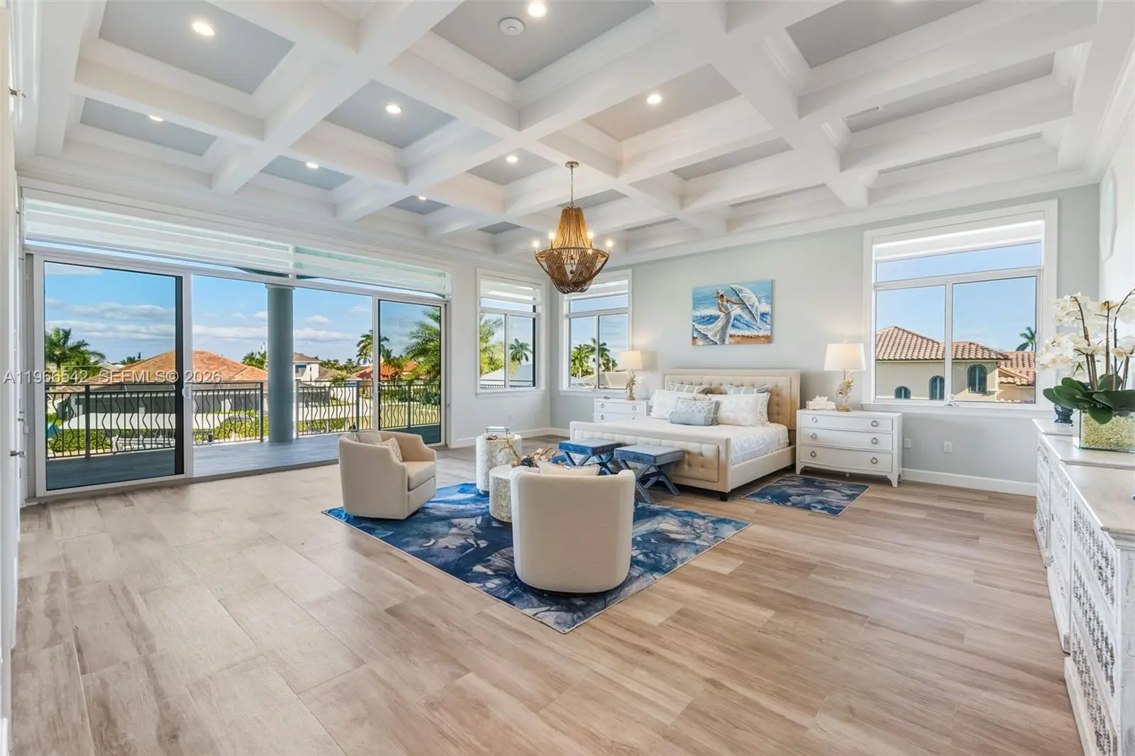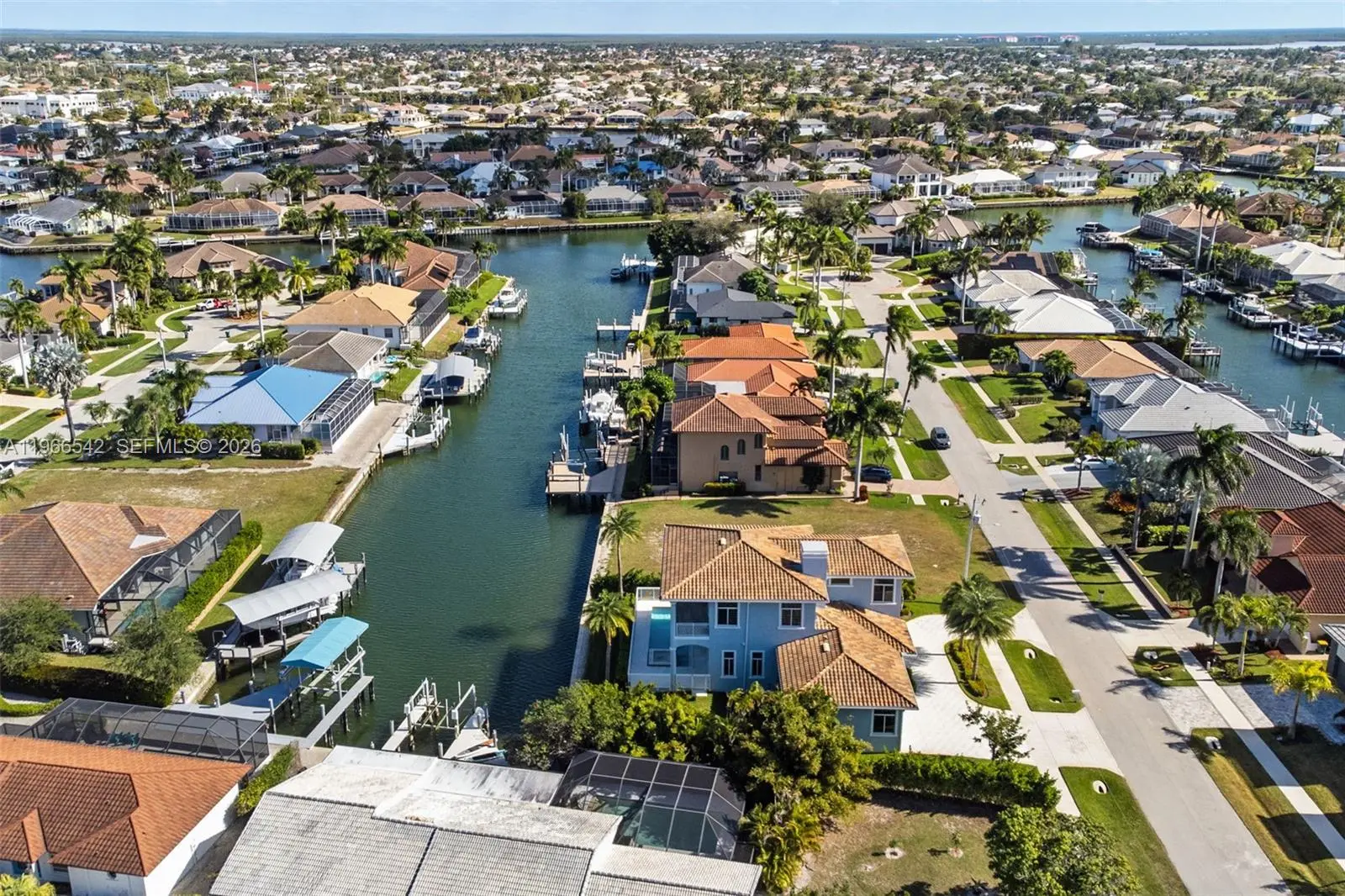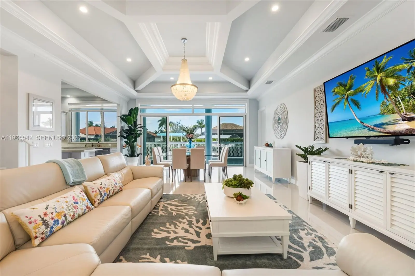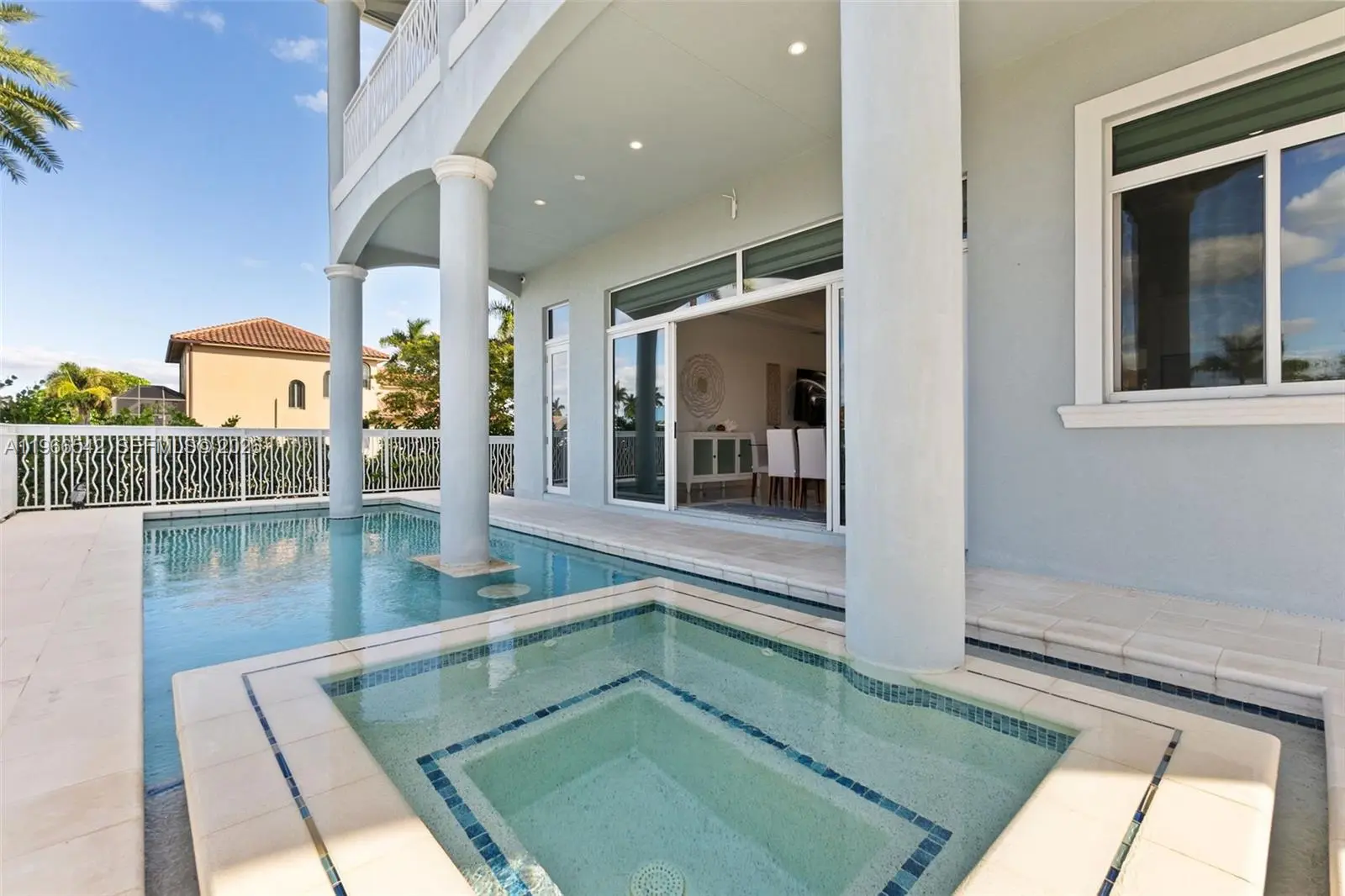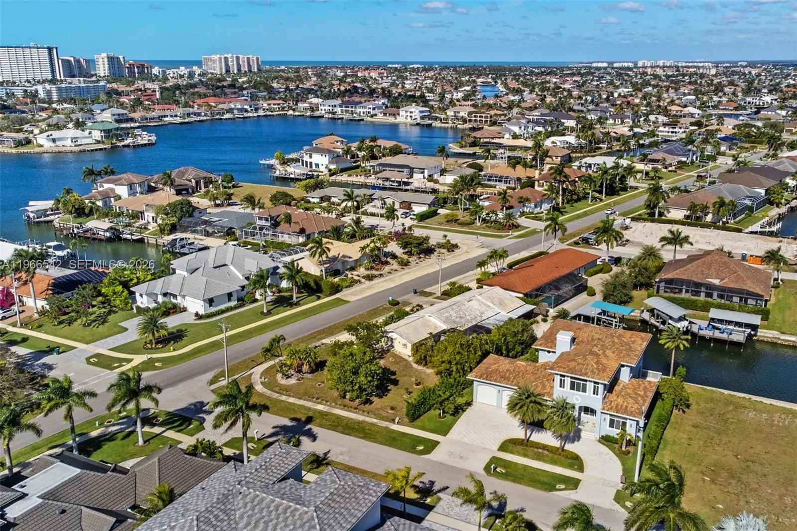 Luxurious fully furnished Marco Island waterfront residence, professionally decorated and move-in ready. This 4-bedroom, 4-bath home blends refined design with effortless coastal living, showcasing tranquil channel views and water access with potential for dock addition. Soaring 24-foot ceilings, porcelain flooring throughout the home and balconies, wood crown moldings, and custom coffered ceilings create a grand yet inviting interior. The open-concept living and dining areas are filled with natural light and designed for entertaining. The chef’s kitchen features KitchenAid Architect Series appliances and Taj Mahal Brazilian stone countertops, while all bathrooms and the laundry room are finished in white quartz. Custom built-in closets, impact windows and doors, barrel tile roof, exterior camera system, elevator, and dual AC units add comfort and peace of mind. The entire second floor is dedicated to the private primary suite with sitting area, spa-style bath, and oversized closet, while a first-floor junior ensuite is ideal for guests or multigenerational living. Outdoors, enjoy a resort-style setting with a heated Pentair pool and spa on an expansive deck overlooking the water, plus convenient pool bath access. A paver driveway and two-car garage complete the property. Experience the Marco Island lifestyle with boating, sunsets, and year-round entertaining in a home designed for luxury and relaxation.