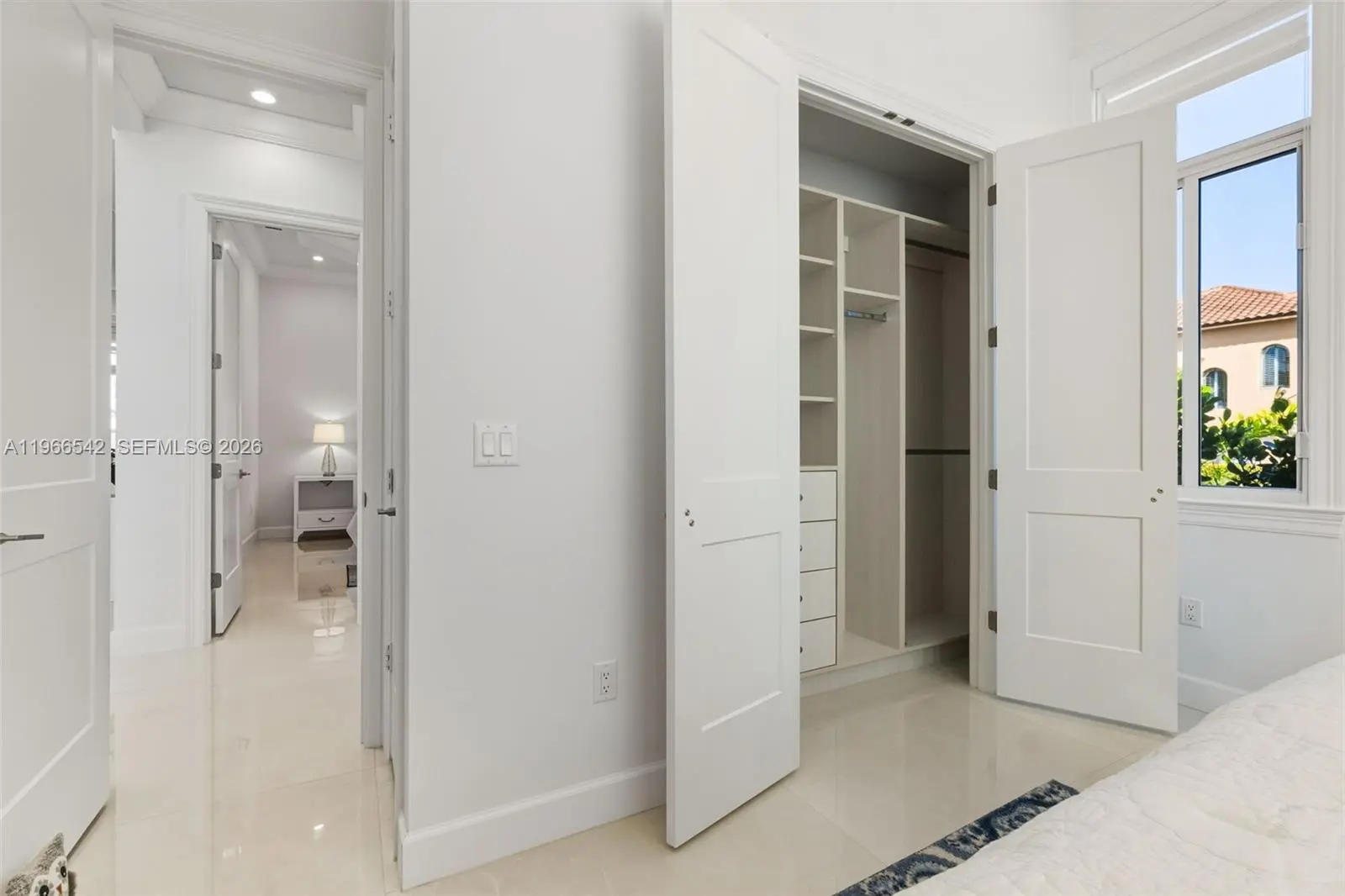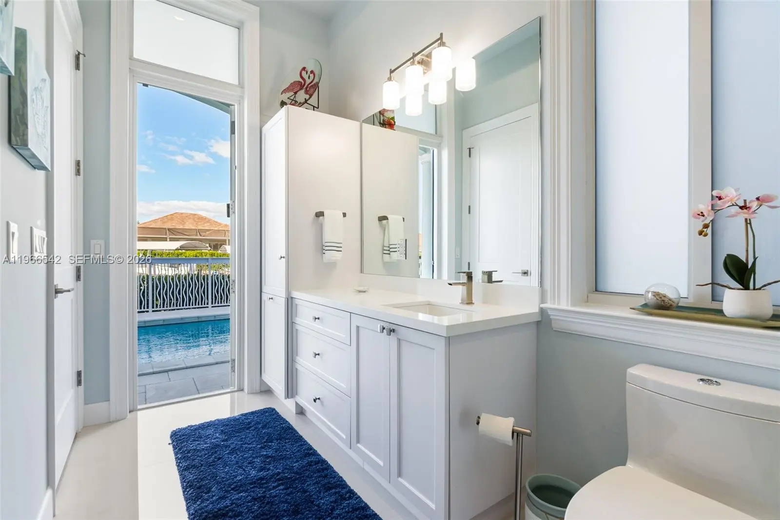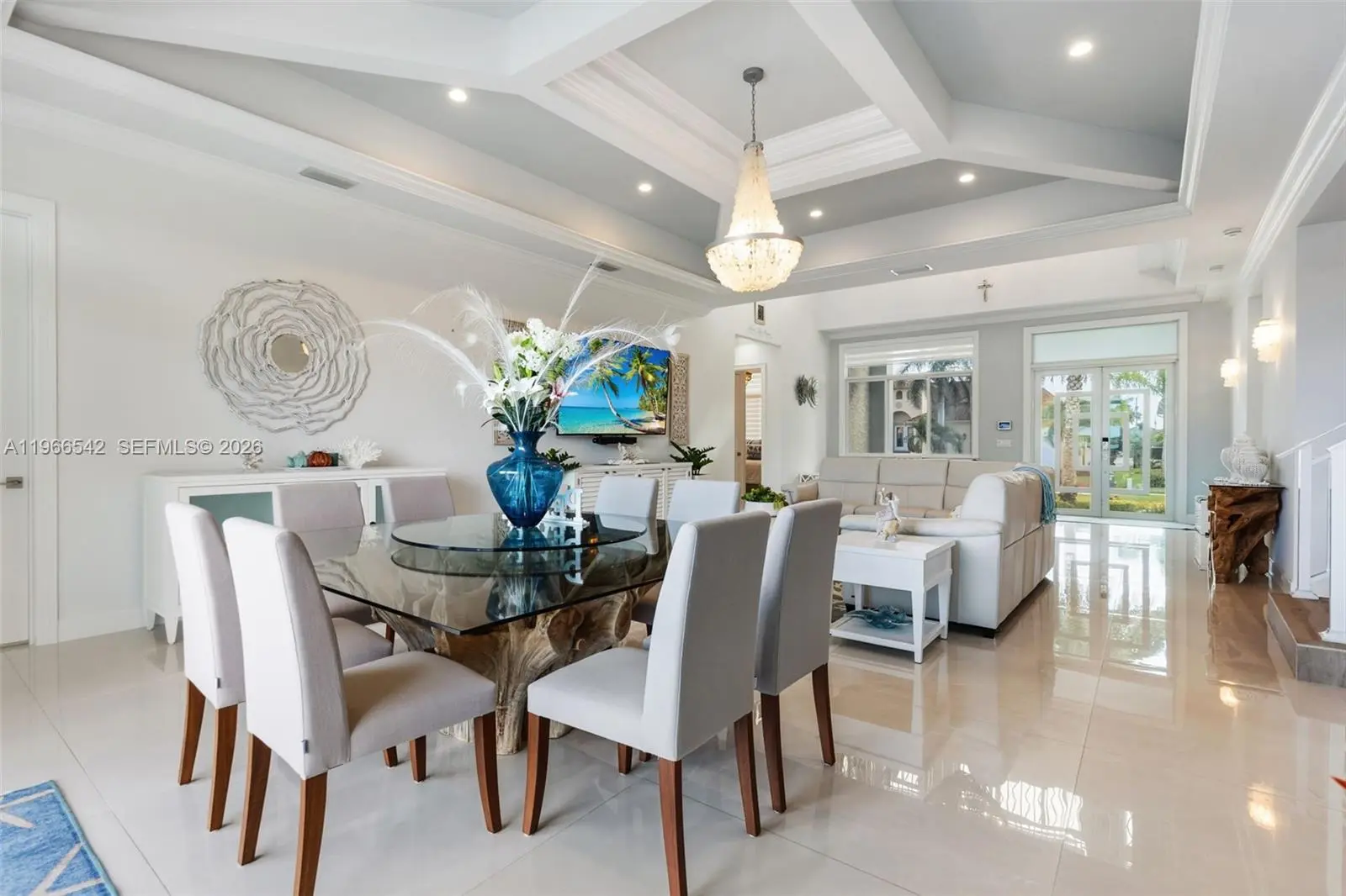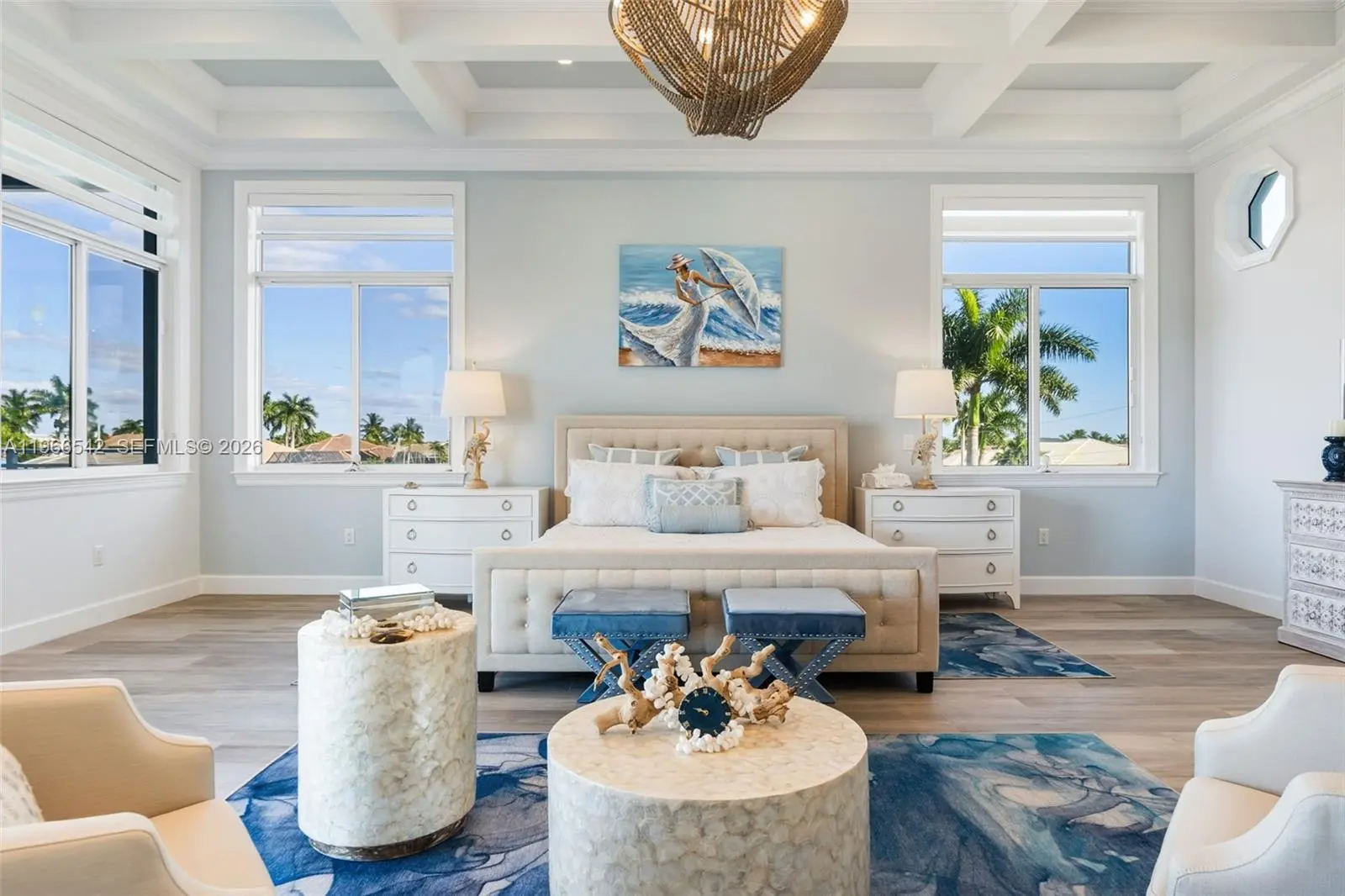 Luxurious fully furnished Marco Island waterfront residence, professionally decorated and move-in ready. This 4-bedroom, 4-bath home blends refined design with effortless coastal living, showcasing tranquil channel views and water access with potential for dock addition. Soaring 24-foot ceilings, porcelain flooring throughout the home and balconies, wood crown moldings, and custom coffered ceilings create a grand yet inviting interior. The open-concept living and dining areas are filled with natural light and designed for entertaining. The chef’s kitchen features KitchenAid Architect Series appliances and Taj Mahal Brazilian stone countertops, while all bathrooms and the laundry room are finished in white quartz. Custom built-in closets, impact windows and doors, barrel tile roof, exterior camera system, elevator, and dual AC units add comfort and peace of mind. The entire second floor is dedicated to the private primary suite with sitting area, spa-style bath, and oversized closet, while a first-floor junior ensuite is ideal for guests or multigenerational living. Outdoors, enjoy a resort-style setting with a heated Pentair pool and spa on an expansive deck overlooking the water, plus convenient pool bath access. A paver driveway and two-car garage complete the property. Experience the Marco Island lifestyle with boating, sunsets, and year-round entertaining in a home designed for luxury and relaxation.
