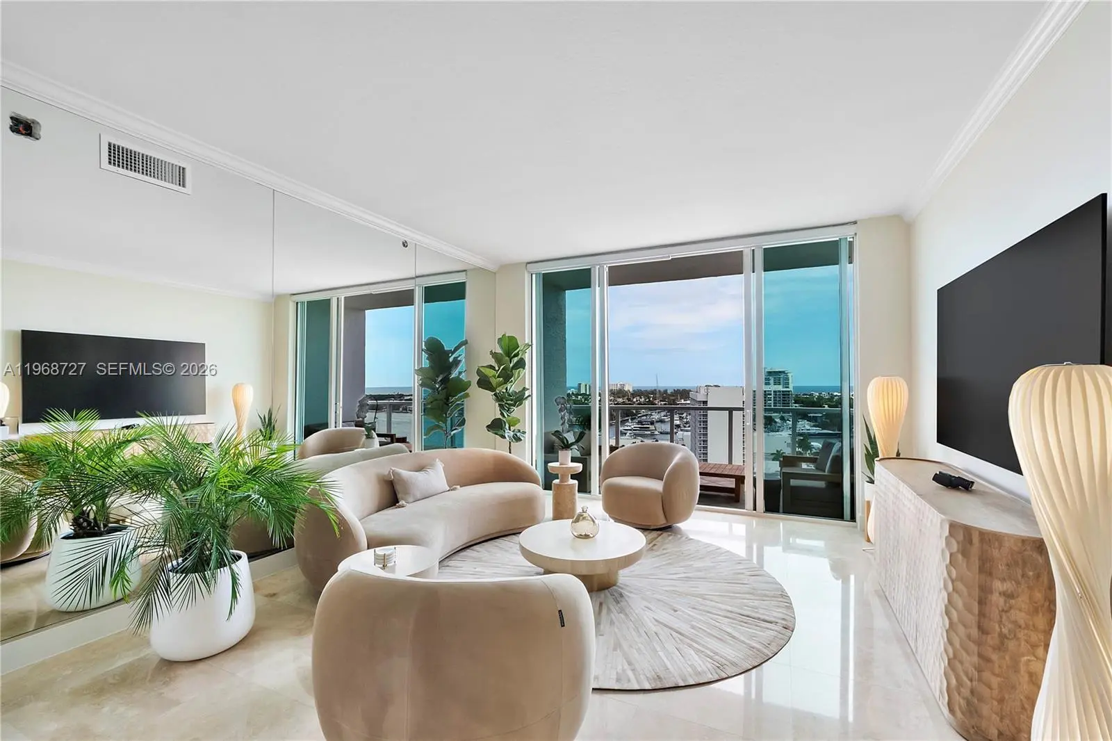Experience elevated luxury in this spacious two-bedroom penthouse residence with breathtaking ocean, intracoastal, port and cruise ship views available for lease 5/1/2026 - 11/30/2026. The 11-foot ceilings with floor to ceiling glass create an open voluminous living space featuring upgraded flooring, Italian cabinetry, KitchenAid and Bosch appliances. Enjoy ample custom closets in each bedroom, built-in safe, full-size laundry and two secure garage spaces. Dockage available for purchase or lease at the adjacent full-service drydock Port Marina with quick access to the ocean. Resort style amenities include a heated pool, spa, saunas, well equipped fitness center, bicycle storage, resident club room and business center. This Harbor Beach area location is convenient to the beach, airport, Las Olas, Port Everglades, Pier 66 Resort, new Omni Convention Center Hotel, new bypass road, highways, restaurants, shops and services.