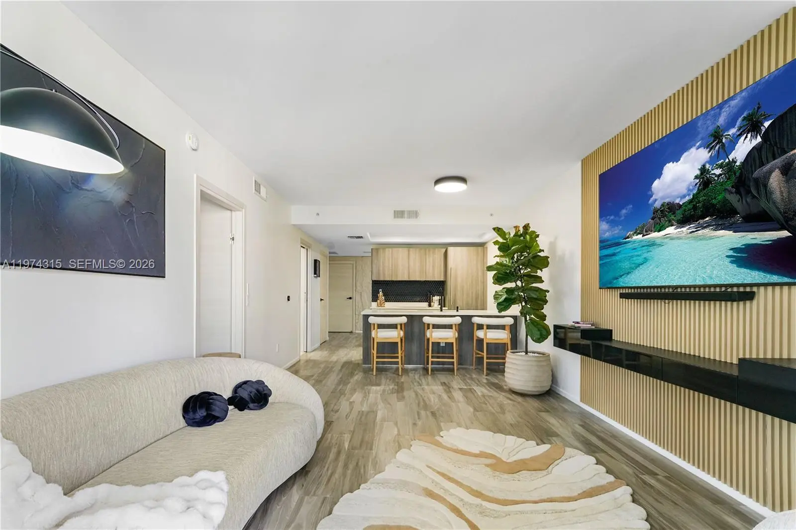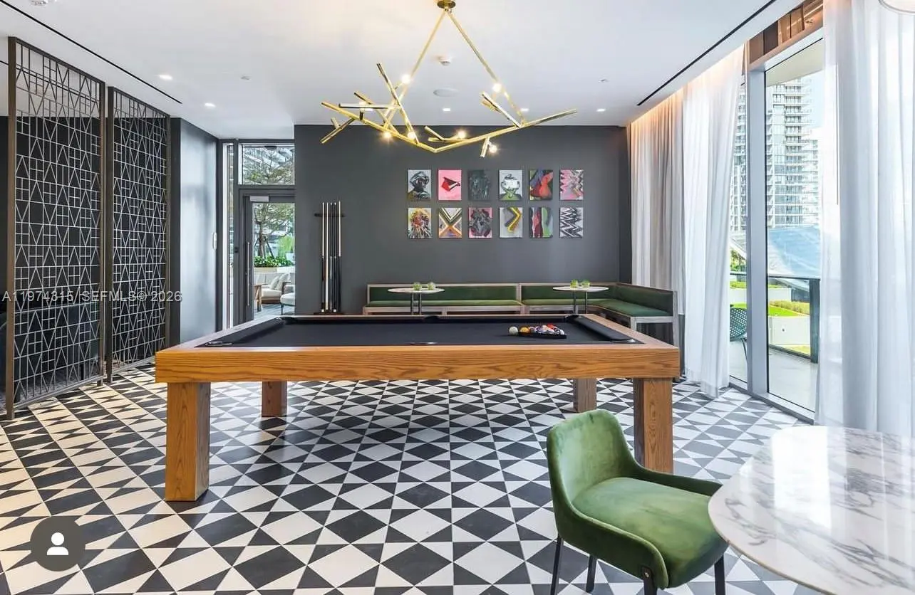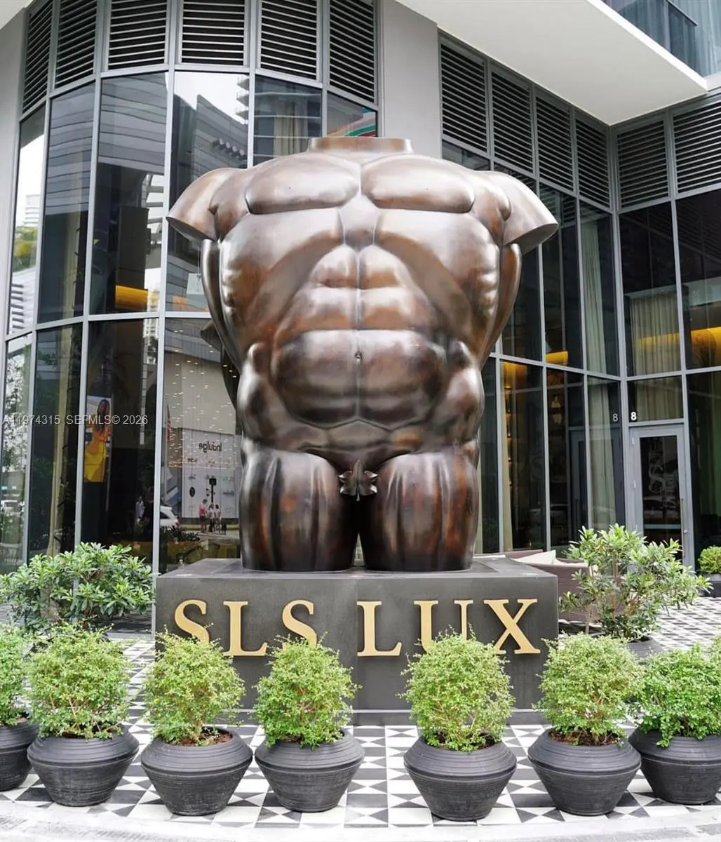 Experience elevated modern luxury in this beautifully redesigned 1 Bedroom + Den, 2 Full Bathroom residence at SLS Lux in the heart of Brickell. Fully upgraded with a sophisticated contemporary aesthetic, this move-in-ready unit features wood-look flooring throughout, custom architectural wall paneling, designer recessed lighting, and an open-concept layout that blends elegance and functionality. The statement kitchen showcases premium appliances, sleek cabinetry, a spacious island ideal for entertaining, and a striking black hexagon backsplash. The residence is equipped with motorized blackout shade for added comfort and privacy. The primary suite offers direct balcony access, a spa-inspired bathroom, and a fully customized walk-in closet, while the den provides flexible space for a home office or guest area. Enjoy a private terrace with impressive Brickell skyline and city views. SLS Lux delivers world-class amenities including rooftop pool, 45th-floor sky lounge, fitness center, tennis court, concierge, valet, hotel-style pool deck, and on-site dining. Designer finished. Prime Brickell location.