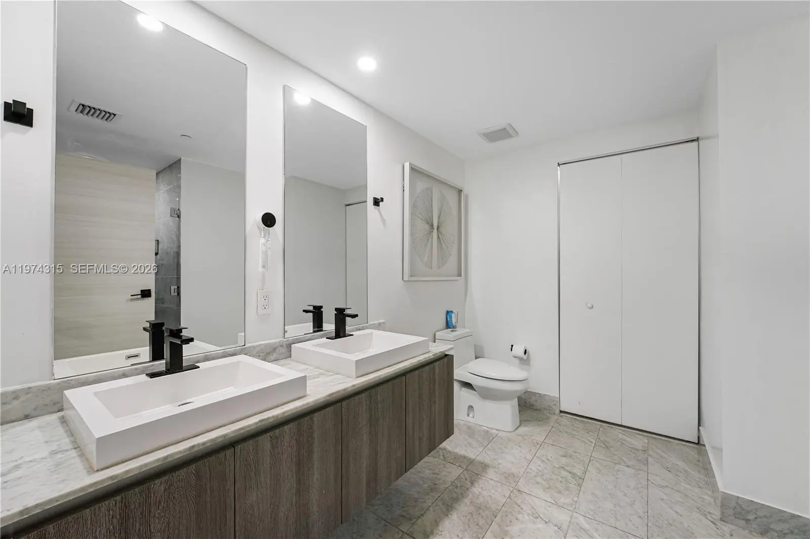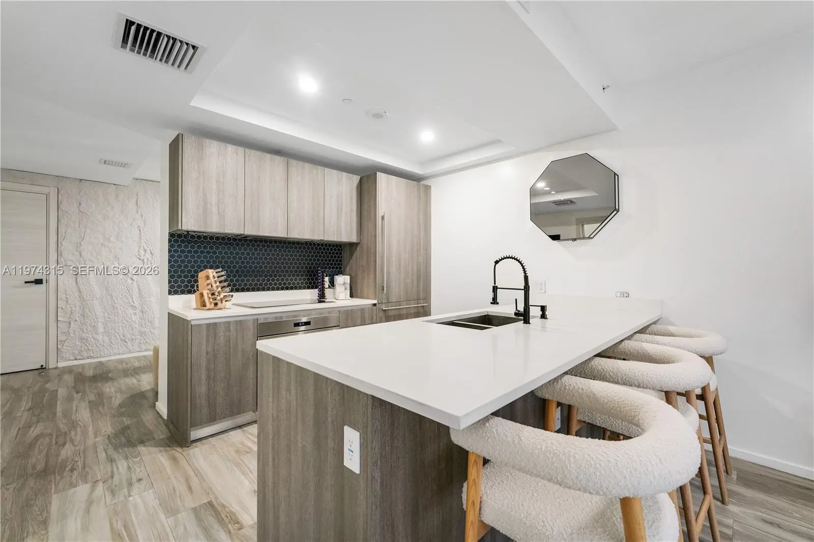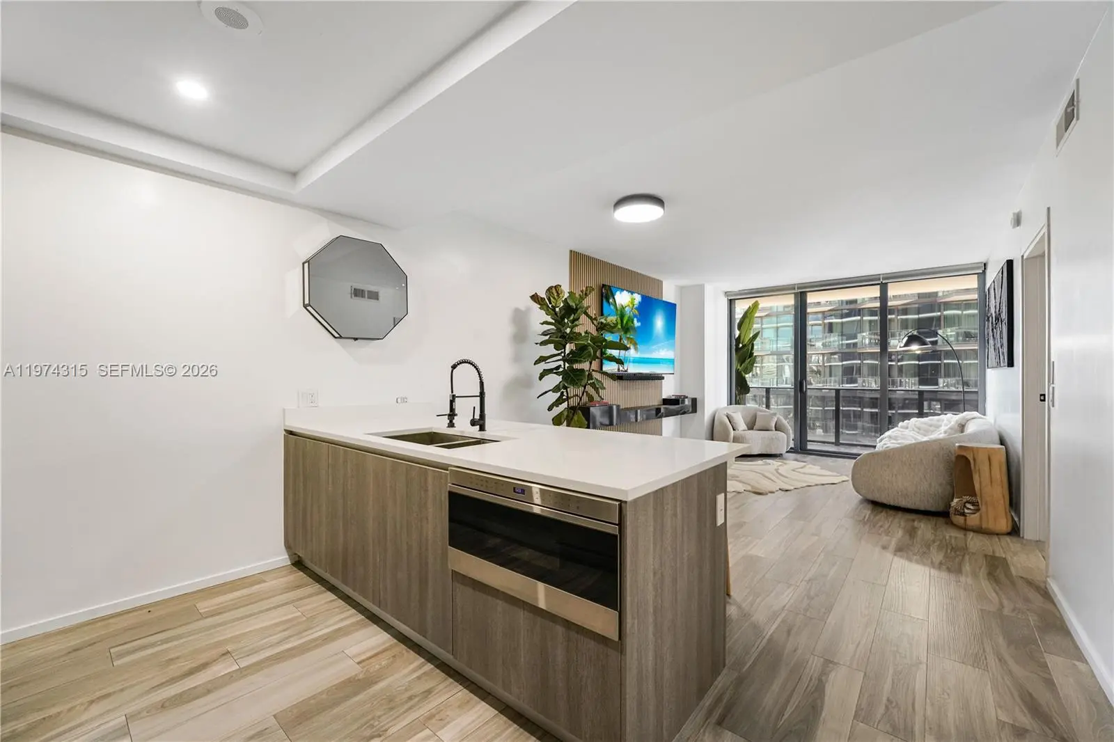 Experience elevated modern luxury in this beautifully redesigned 1 Bedroom + Den, 2 Full Bathroom residence at SLS Lux in the heart of Brickell. Fully upgraded with a sophisticated contemporary aesthetic, this move-in-ready unit features wood-look flooring throughout, custom architectural wall paneling, designer recessed lighting, and an open-concept layout that blends elegance and functionality. The statement kitchen showcases premium appliances, sleek cabinetry, a spacious island ideal for entertaining, and a striking black hexagon backsplash. The residence is equipped with motorized blackout shade for added comfort and privacy. The primary suite offers direct balcony access, a spa-inspired bathroom, and a fully customized walk-in closet, while the den provides flexible space for a home office or guest area. Enjoy a private terrace with impressive Brickell skyline and city views. SLS Lux delivers world-class amenities including rooftop pool, 45th-floor sky lounge, fitness center, tennis court, concierge, valet, hotel-style pool deck, and on-site dining. Designer finished. Prime Brickell location.