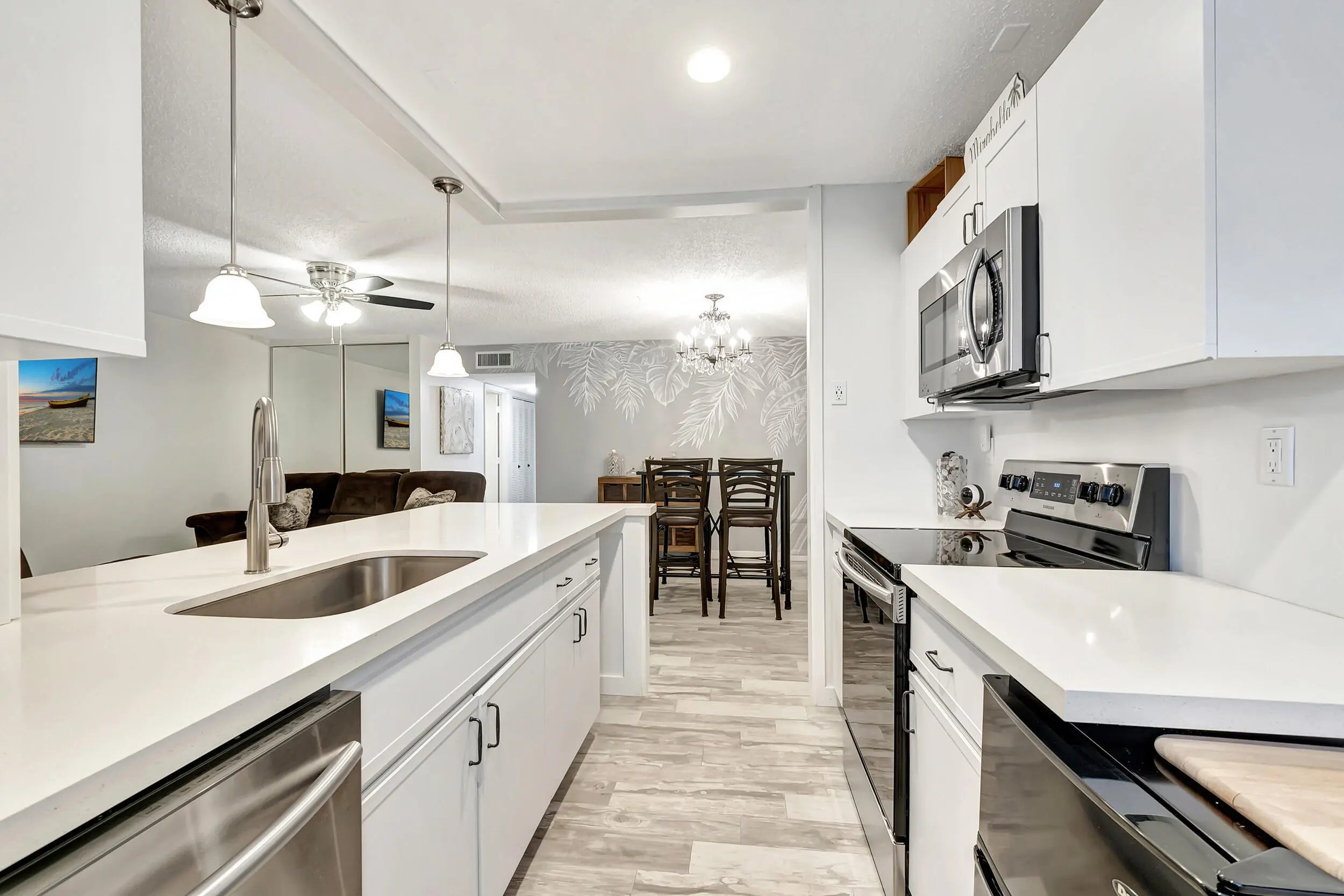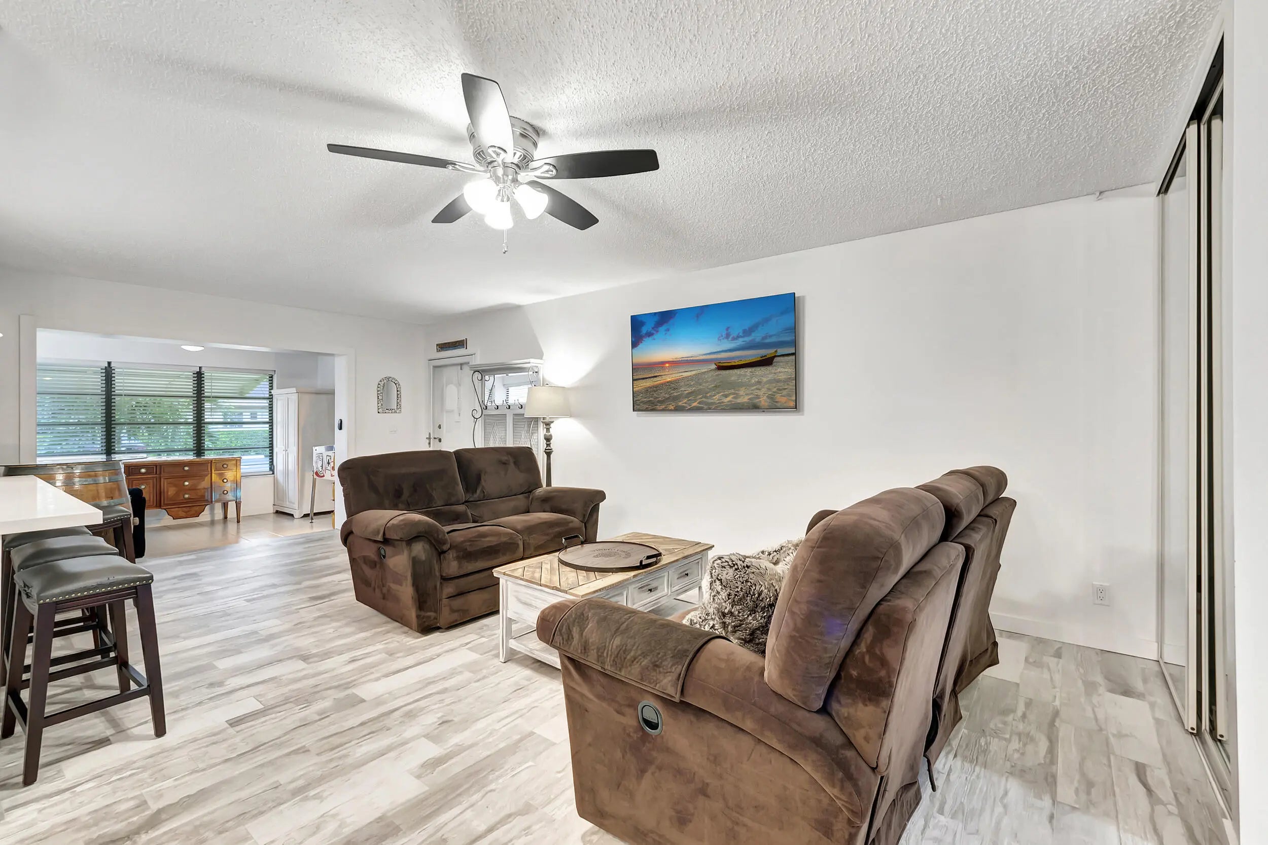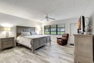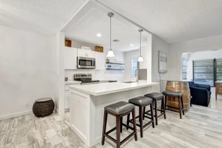 Beautiful updated, fully furnished, turnkey villa featuring 1 bedroom, 2 full bathrooms, plus an open den. The open living floor plan includes a bright, updated kitchen with quartz countertops, stainless steel appliances, and bar seating for four. Both bathrooms have been renovated with new tile, vanities, and countertops. The primary suite offers 2 walk-in closets and an exterior door to the garden patio with outdoor seating. Located in a 55+ community with amenities including pool, clubhouse, shuffleboard, and tennis courts. Convenient to the famous Atlantic Avenue restaurants and shopping, and just 5 miles to the beach.