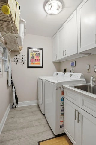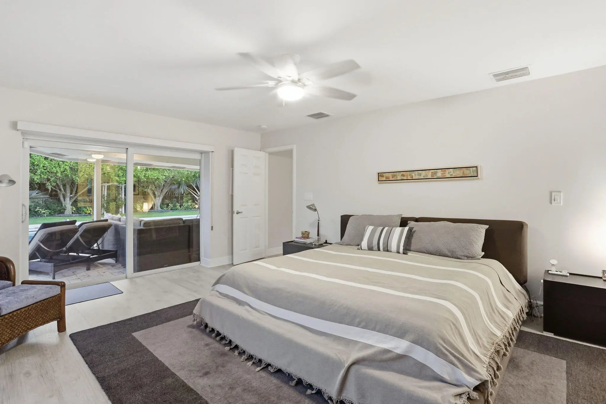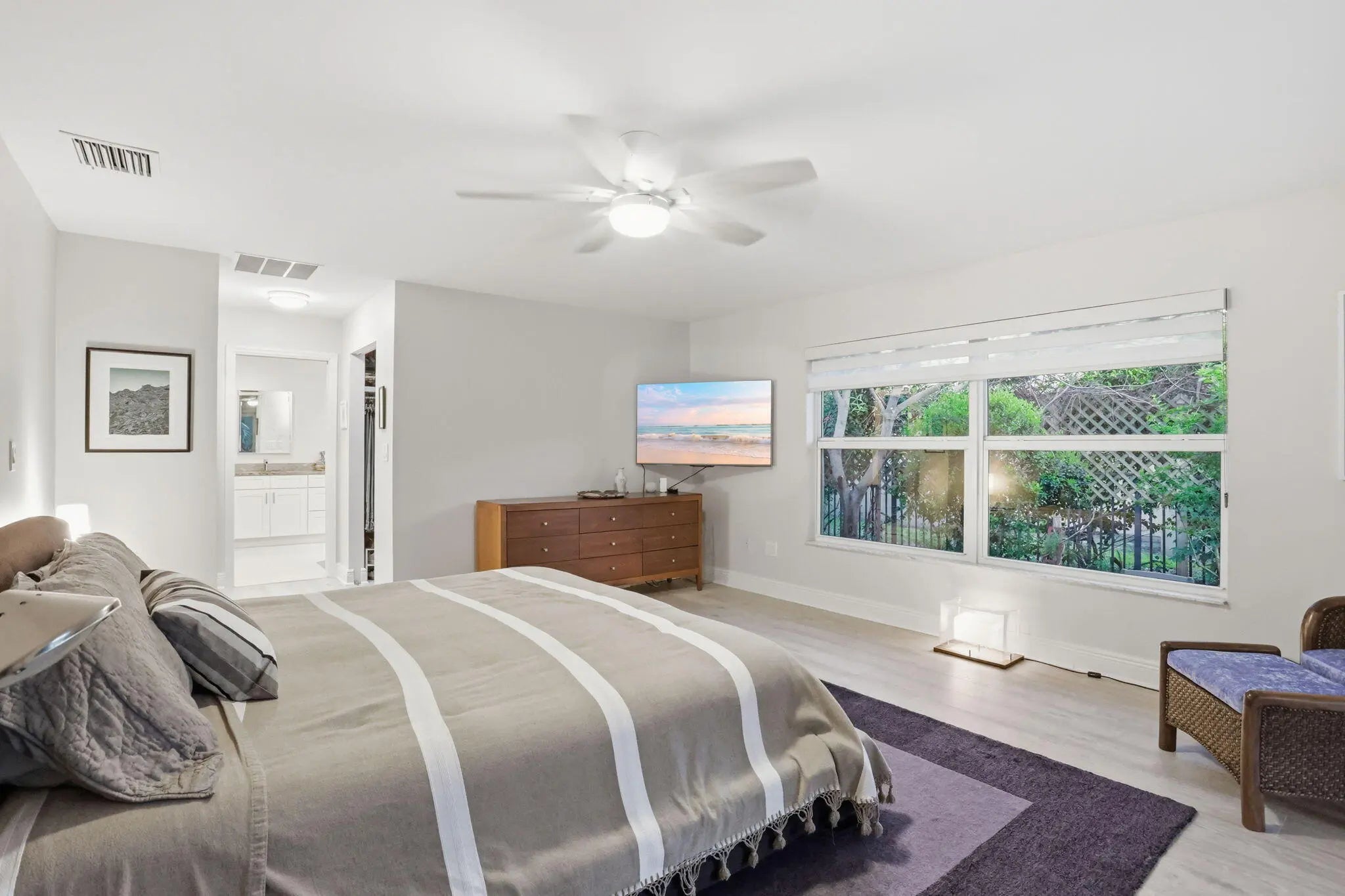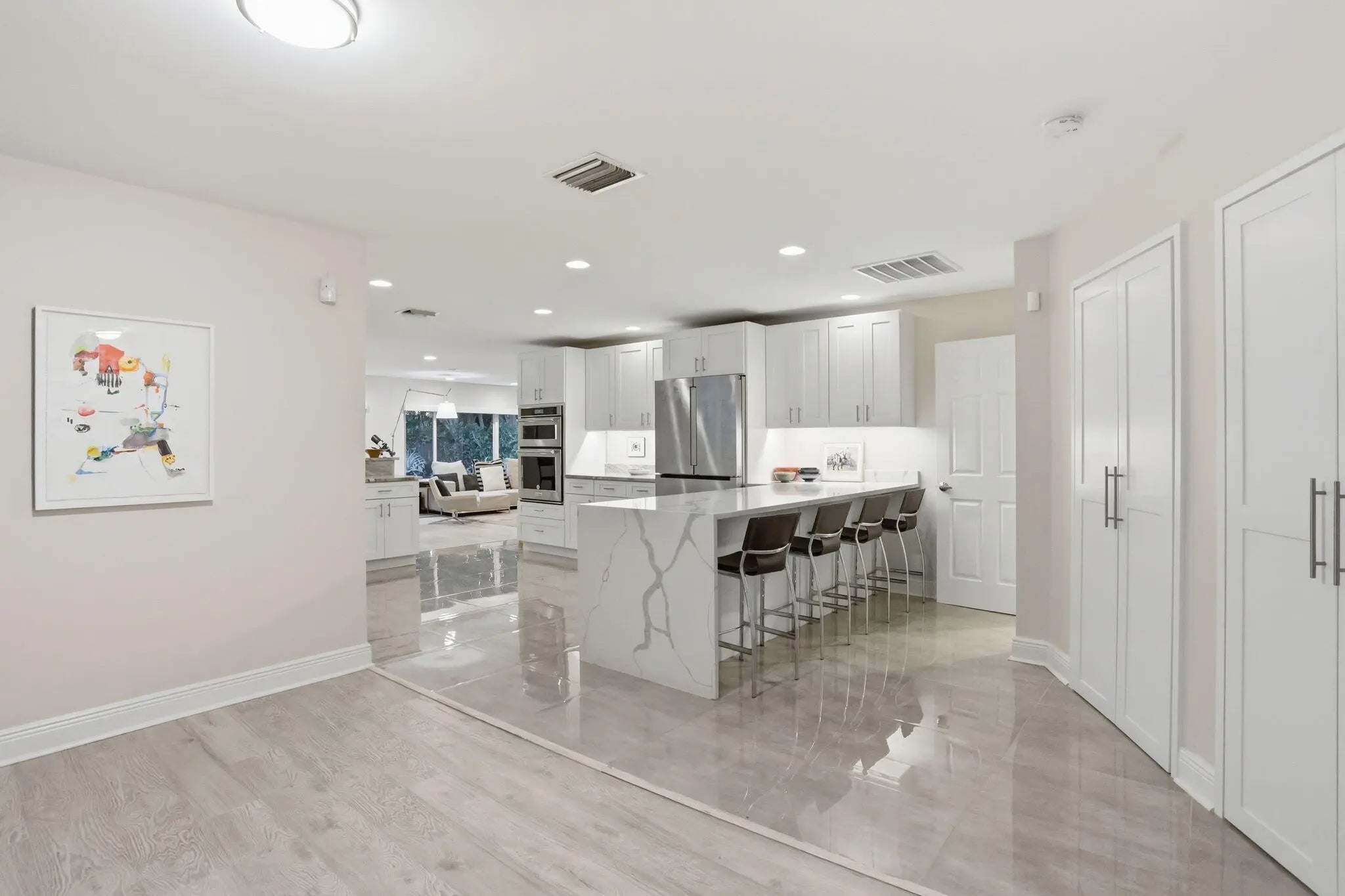 Welcome to an exceptional residence tucked within one of East West Palm Beach's most exclusive gated communities, ideally positioned east of I-95 along a mature, tree-lined street. This refined home offers the perfect balance of privacy, sophistication, and convenience—just minutes from premier shopping, dining, Tanger Outlets, and Palm Beach International Airport for effortless travel. Ideally located, the home offers easy access to downtown West Palm Beach, Rosemary Square, and Palm Beach Island—placing world-class dining, luxury boutiques, waterfront promenades, and vibrant cultural venues just moments away. Enjoy an elevated lifestyle with nearby fine dining, rooftop lounges, art galleries, and some of South Florida's most sought-after restaurants and social destinations. Set along the renowned Jack Nicklaus golf course, the home is recorded as a 4-bedroom per the property appraiser, currently configured as 3 bedrooms plus an expansive great room that showcases volume and versatility. The existing layout allows for a seamless conversion to a fourth bedroom, office, or private retreat, depending on your needs. Designed with both elegance and comfort in mind, the split-bedroom floor plan creates a natural flow for elevated living and entertaining. Laminate flooring runs throughout the main living areas, complemented by porcelain tile in the wet spaces. The recently updated kitchen and primary bathroom feature refined, modern finishes, with the primary suite offering a spa-inspired experience highlighted by a stunning freestanding soaking tub. Major system upgrades—including a new A/C (2022) and water heater (2024)—provide peace of mind. Natural light pours in through large picture windows and impact-rated sliding glass doors, framing the home's most captivating feature—its private outdoor sanctuary. The backyard is a true oasis, complete with a gas-heated pool, lush landscaping, and thoughtfully designed exterior lighting that creates a resort-like ambiance day and night. The indoor-outdoor connection allows for effortless entertaining, whether hosting intimate gatherings or larger events. The garage is equally impressive, featuring a private sauna for relaxation and an electric vehicle charging space to support a modern lifestyle. This is a rare opportunity to own a thoughtfully upgraded home in a discreet, high-demand enclave—where luxury meets livability in the heart of West Palm Beach.