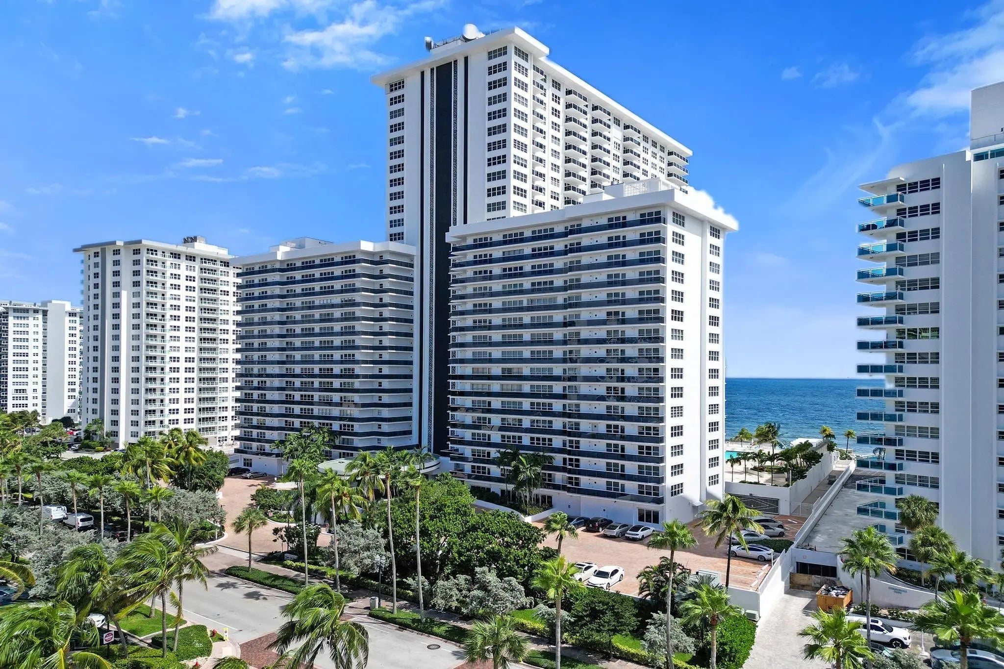 Direct oceanfront living at Playa Del Sol. This highly sought-after corner residence in the south wing features a semi-private elevator and offers panoramic views of the ocean, Intracoastal, and city, overlooking the heated pool. The two-bedroom, two-bath condo includes an updated kitchen with breakfast bar and ocean views, impact windows, a washer and dryer, and new glass balconies. The recently remodeled building provides resort-style amenities including a heated pool, fitness centers, community room, and library—all located directly on the sand and within walking distance to shops, restaurants, and more.