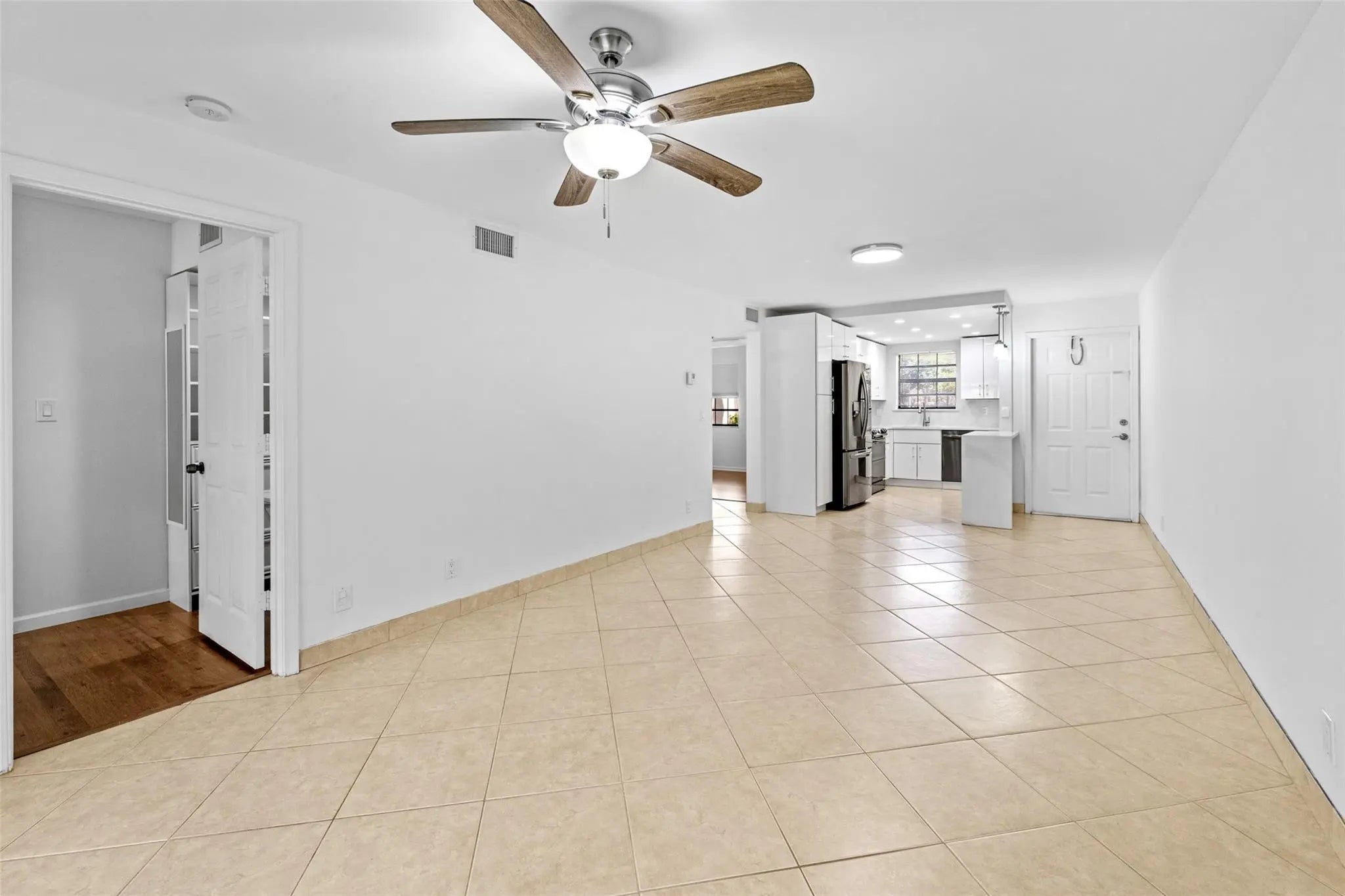 Fully renovated, modern, first-floor, one-level two-bedroom, two-bathroom residence featuring an in-unit stackable washer and dryer, stainless steel appliances, tile flooring throughout the main living areas, and wood-look laminate in the bedrooms. Includes one assigned parking and guest space. Enjoy a screened patio with peaceful views of open green space and wildlife. The adjacent lake offers fishing opportunities. Lake Windwood community amenities include 24-hour man-gated security, a path around the lake, two pools, tennis courts, basketball courts, and a dog park. Centrally located near FAU, shopping, I-95, and the beach. Move-in ready