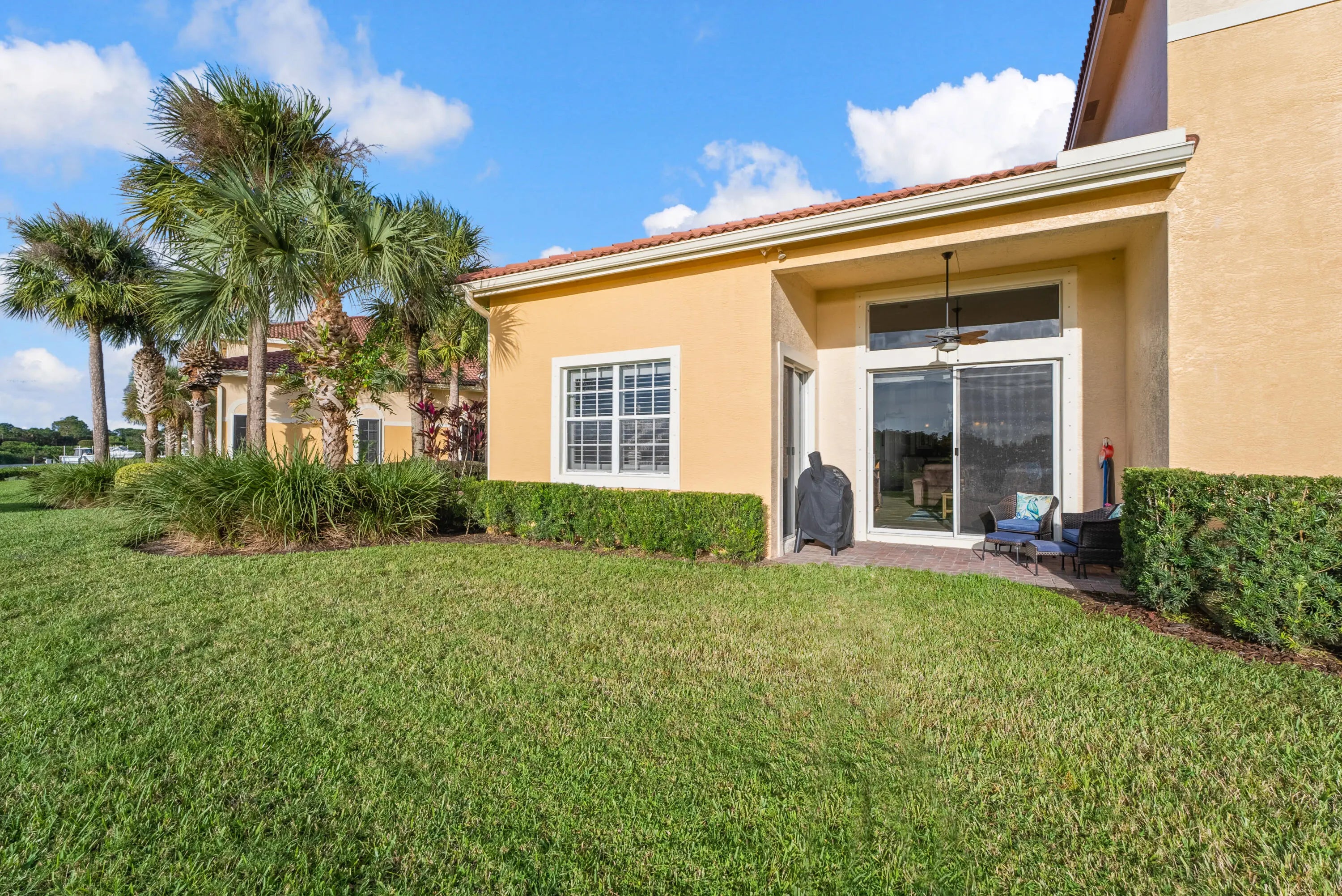 Luxurious Waterfront End-Unit Townhouse in ''Harbour Island'' at Palm Cove Golf & Yacht Club. Nestled within the exclusive gated community this elegant 2 bed + den, 2 bath offers a blend of modern comforts & coastal luxury+ BRAND NEW ROOF. The bright, open layout includes a spacious living area with stunning water views, a sleek kitchen with granite countertops & a full laundry room for convenience. Step outside to your private patio, perfect for entertaining or quiet relaxation with spectacular sunsets. The 2-car garage provides ample storage. Palm Cove residents can enjoy memberships to top-tier amenities, including golf course, tennis & pickleball courts, & a marina with boat slips available for purchase. The clubhouse offers endless activities, pool, playground & more