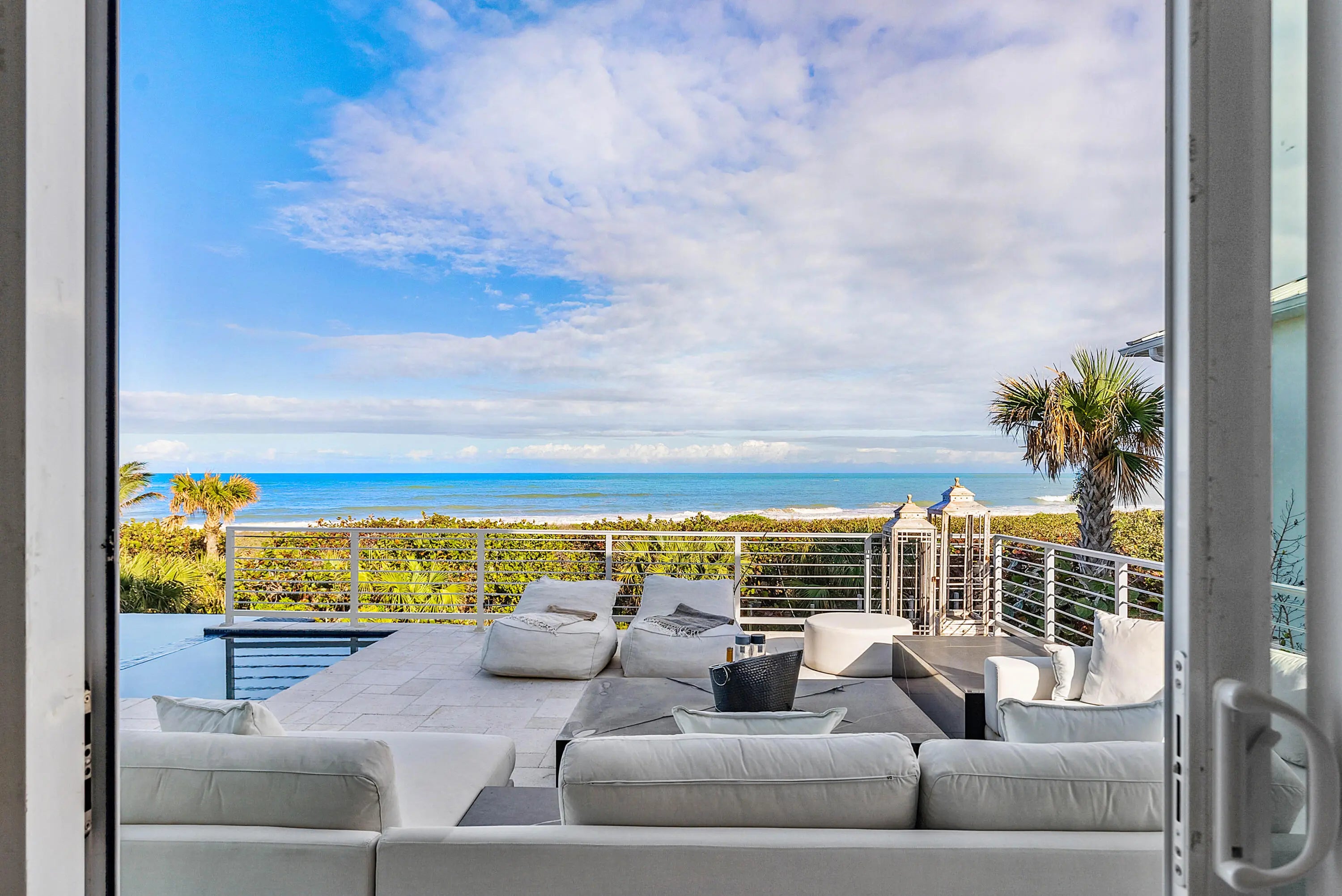 Indulge in coastal luxury with this newly built in 2022, over 10,250 tot sq', oceanfront retreat in the Aquavista community of North Hutchinson Island. Enjoy unparalleled privacy on a centrally located private road, shielded from neighboring condos and community entrance traffic. Revel in panoramic views from multiple terraces and patios offering both sunrise and sunset vistas. The residence features 48'' porcelain tile, white oak stair treads, and glass stair rails throughout. Take a dip in the infinity-edge private saltwater pool/spa—all while embracing the tranquil charm of the Atlantic Ocean. This 5-bedroom, 7-bathroom haven boasts garage parking for 6+ vehicles & all your toys. Experience culinary excellence in the gourmet kitchen featuring top-of-the-line Thermador and Bosch appliances. This Oceanfront oasis elevates every moment with 10-foot window heights in all formal areas, providing breathtaking views, complemented by 10-foot sliding glass doors that seamlessly blend indoor and outdoor living. Completely finished expansive 700+ sq ft guest retreat, a sanctuary within itself. This private space features a private entrance, full bathroom for convenience and two spacious walk-in closets, providing ample storage. Your guests will relish in comfort and luxury, ensuring a memorable stay in this oceanfront residence. This oceanfront abode goes beyond expectations, offering a dedicated office space with a full bathroom for utmost convenience. The property also features an open loft on the 3rd floor, perfect for a workout area or versatile use. Adding to the ease of living, an elevator ensures seamless access to all levels, combining functionality with the utmost sophistication. This coastal haven, designed by Randall Stofft, offers a perfect fusion of luxury, functionality, and panoramic beauty!!