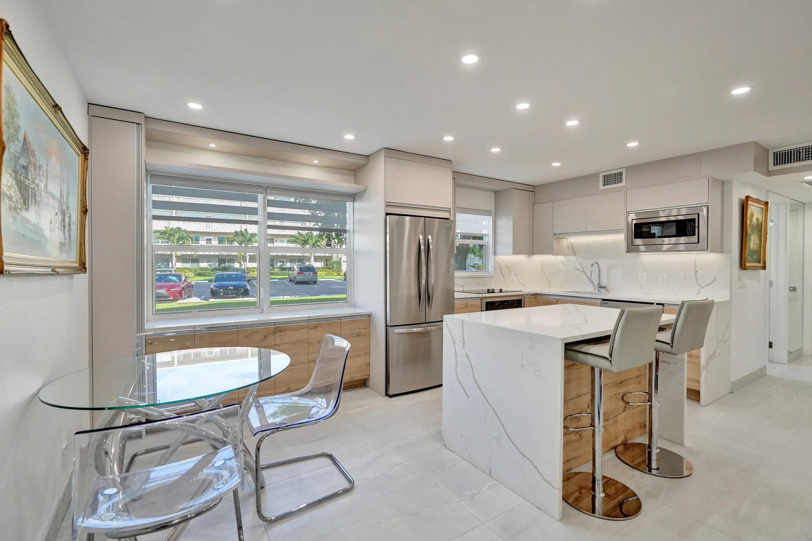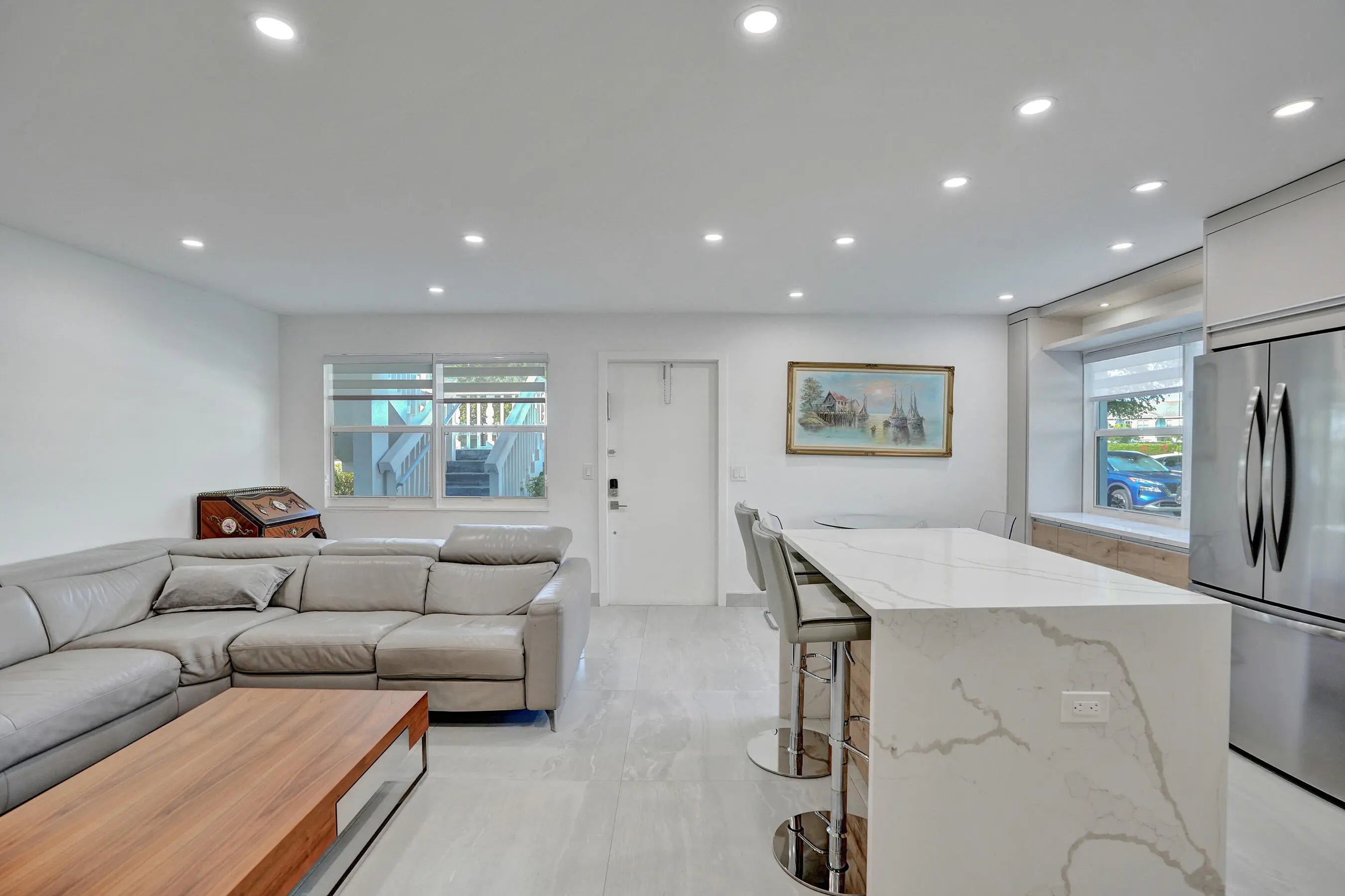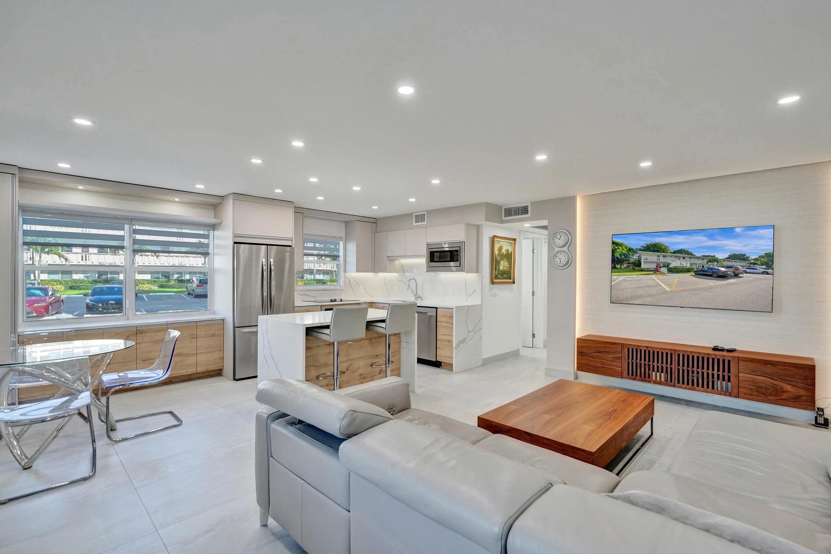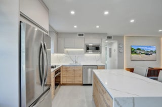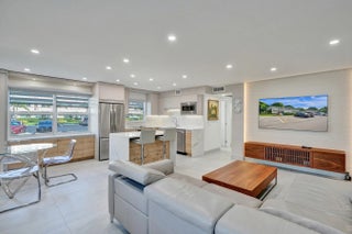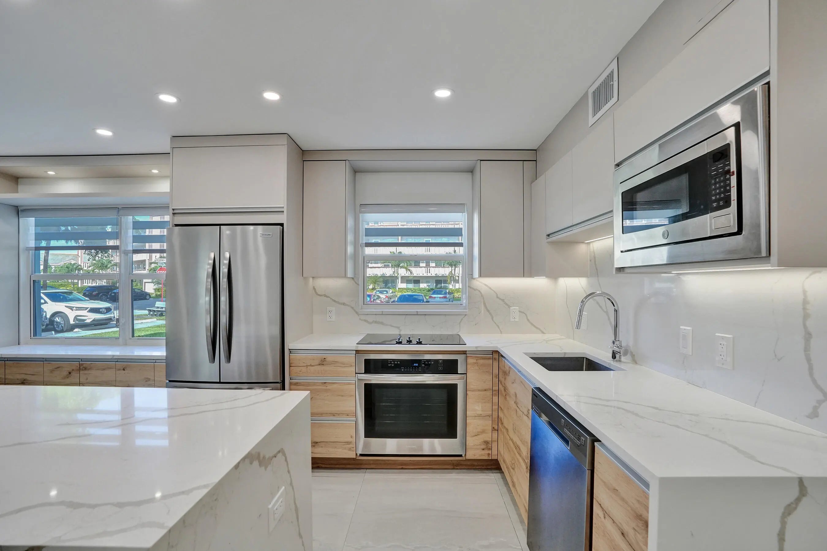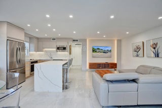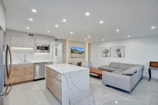 Beautifully renovated and filled with natural light, this first-floor corner unit showcases high-end finishes and thoughtful upgrades throughout. The custom kitchen features quartz countertops, a full backsplash, under-cabinet lighting, and all-new appliances. Additional highlights include all impact windows, a new electric water heater, updated electrical panel, recessed lighting in every room, and 36x36 porcelain tile flooring throughout. Both bathrooms have been completely redone, and the unit is enhanced by custom built-in closets and a sleek built-in TV unit. Located in one of the few two-story condo buildings, this corner unit benefits from wraparound windows and a spacious, airy feel. The assigned parking space is just steps from the front door, offering exceptional convenience.