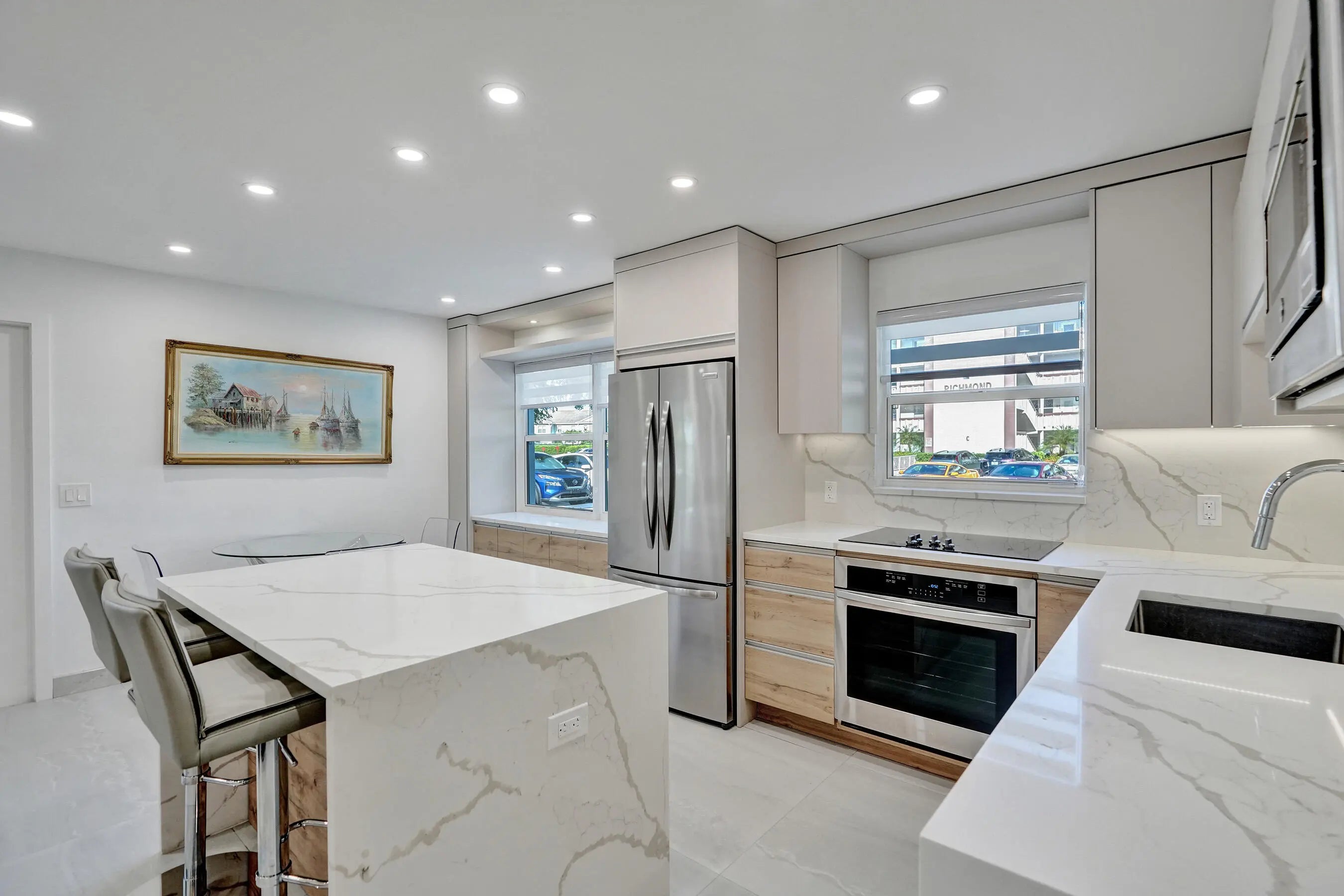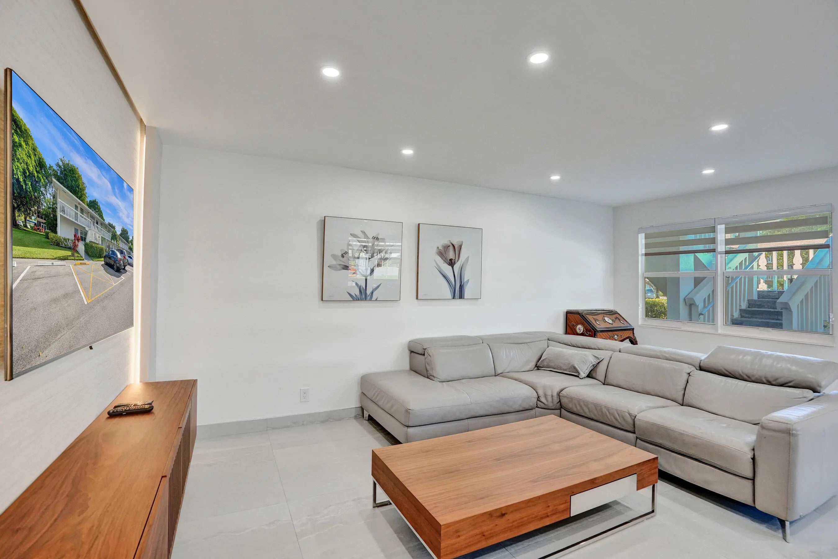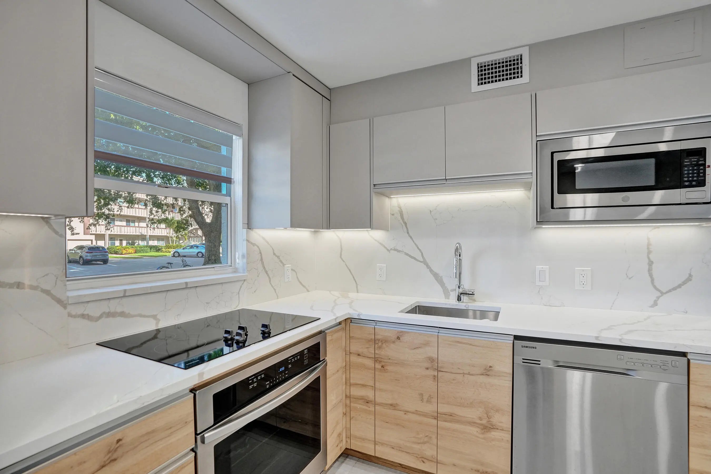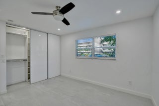 Beautifully renovated and filled with natural light, this first-floor corner unit showcases high-end finishes and thoughtful upgrades throughout. The custom kitchen features quartz countertops, a full backsplash, under-cabinet lighting, and all-new appliances. Additional highlights include all impact windows, a new electric water heater, updated electrical panel, recessed lighting in every room, and 36x36 porcelain tile flooring throughout. Both bathrooms have been completely redone, and the unit is enhanced by custom built-in closets and a sleek built-in TV unit. Located in one of the few two-story condo buildings, this corner unit benefits from wraparound windows and a spacious, airy feel. The assigned parking space is just steps from the front door, offering exceptional convenience.