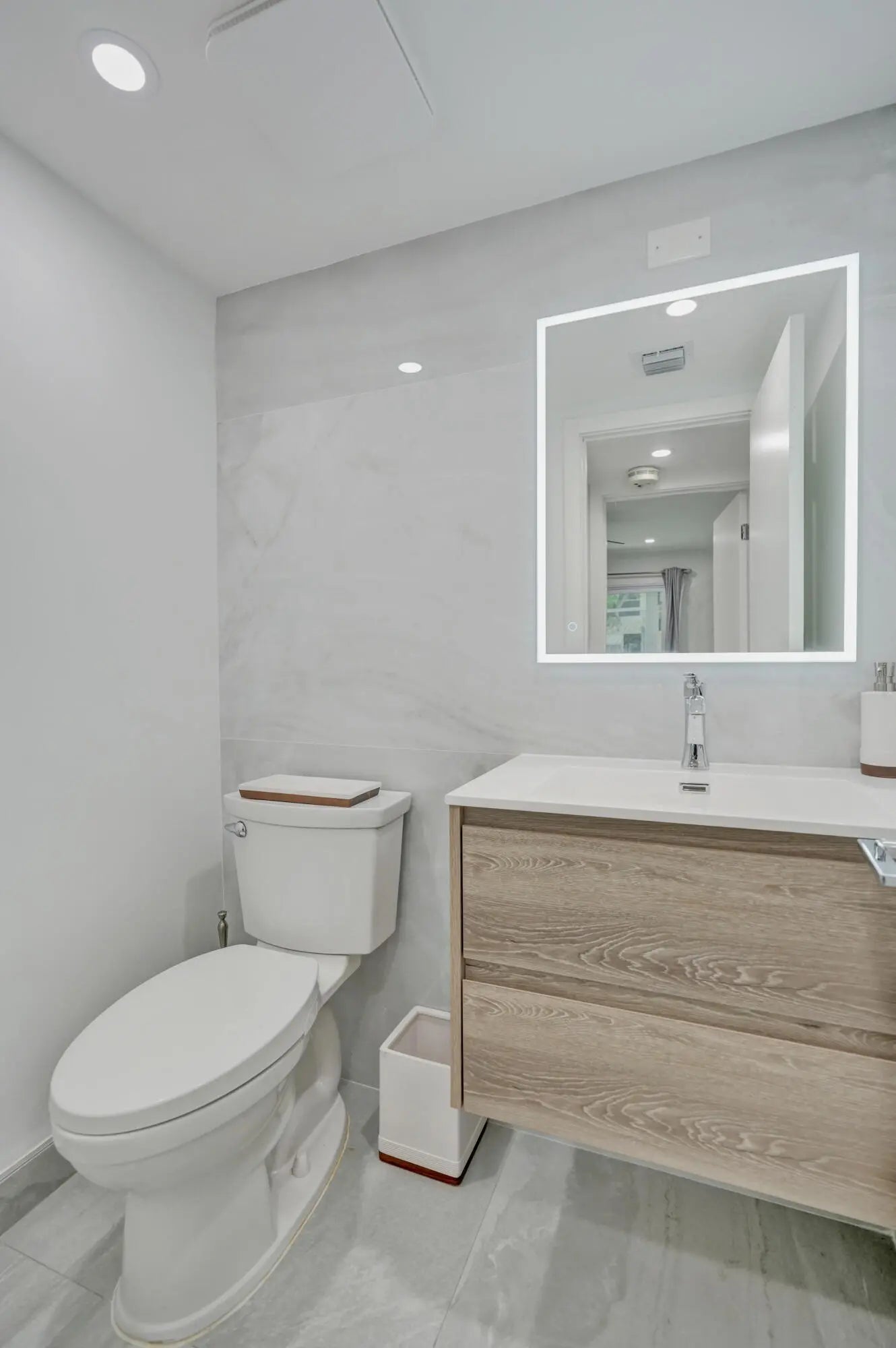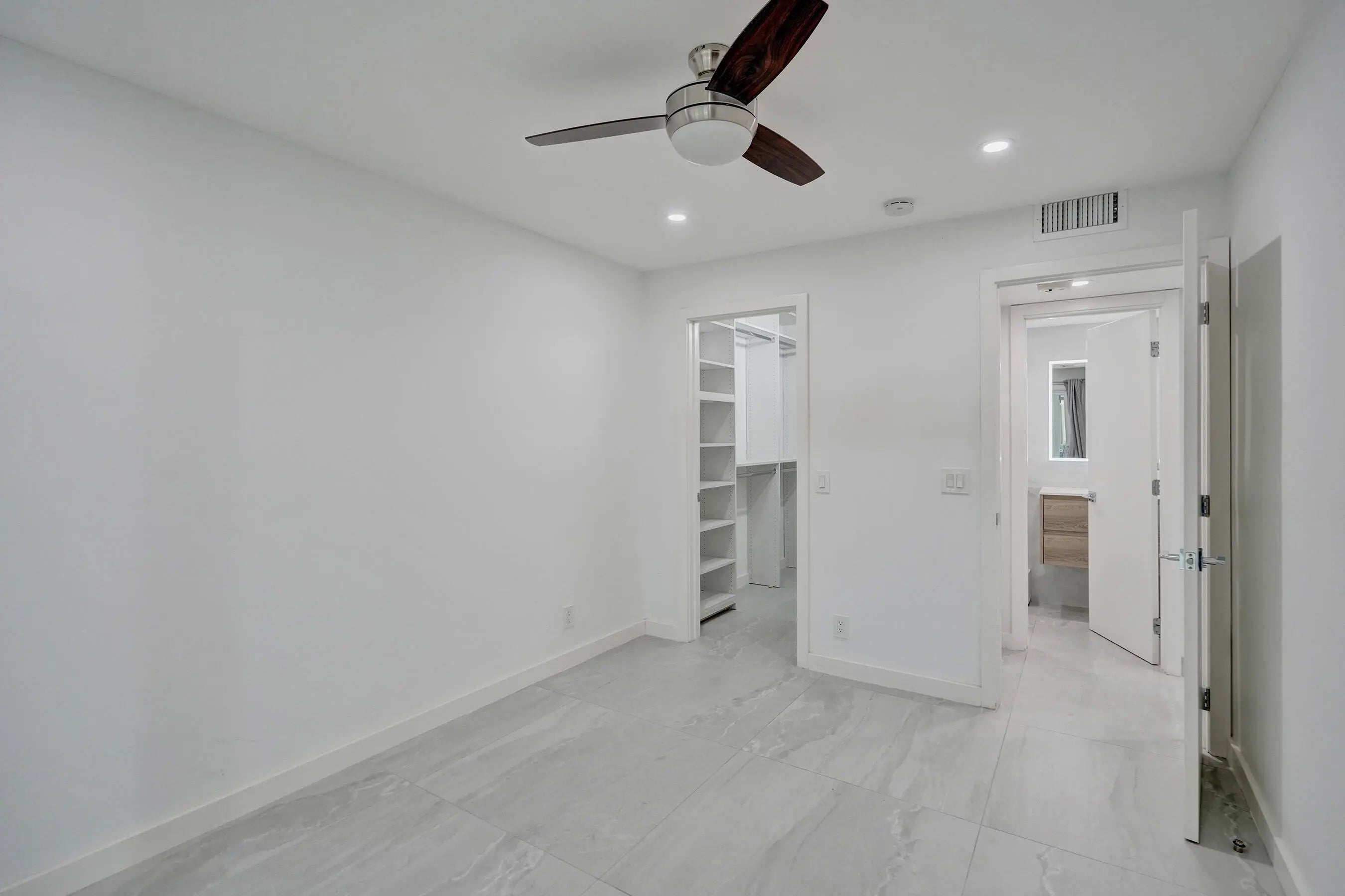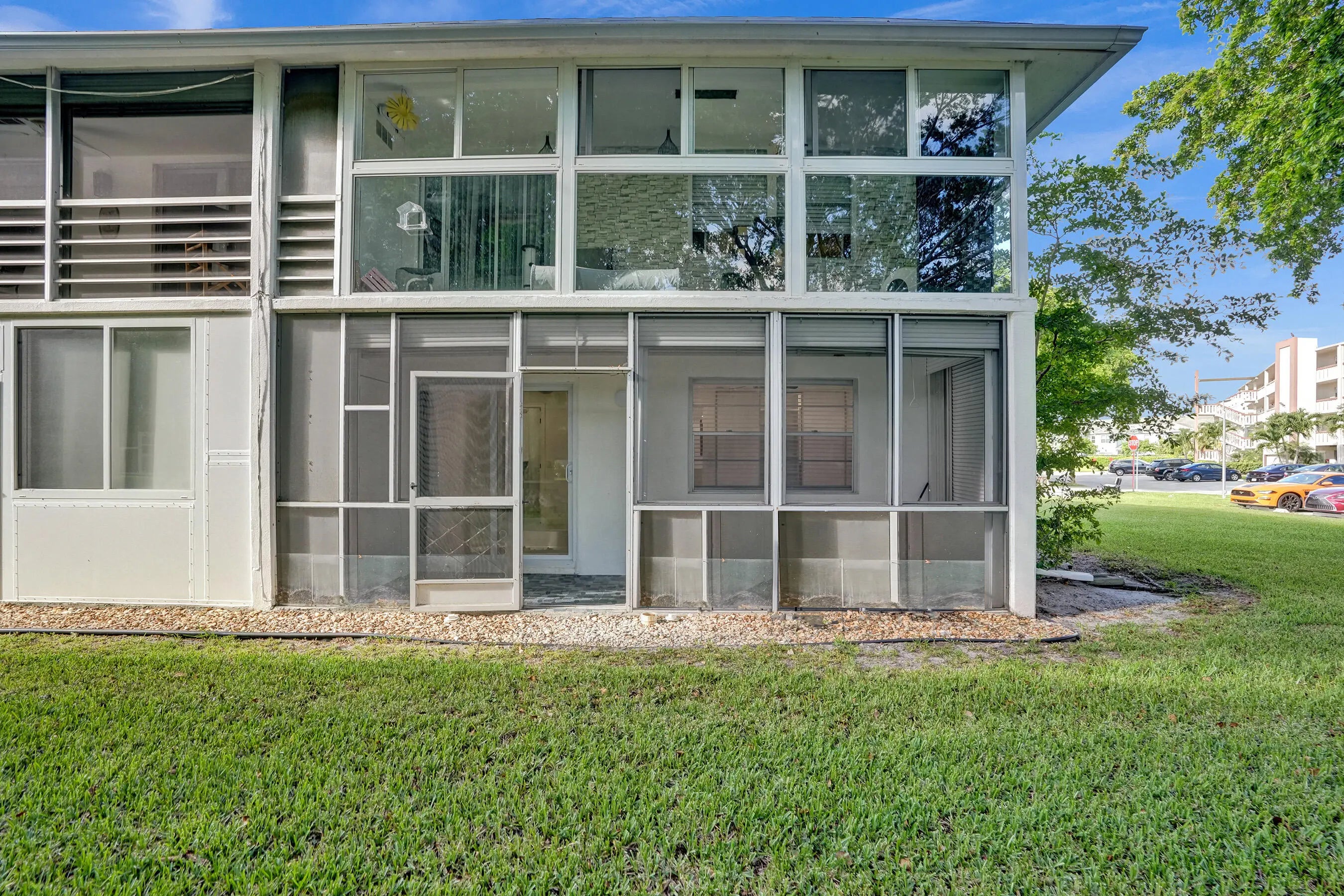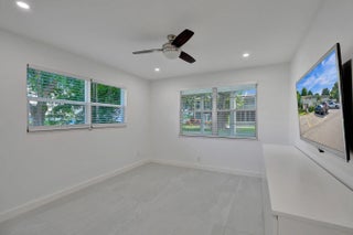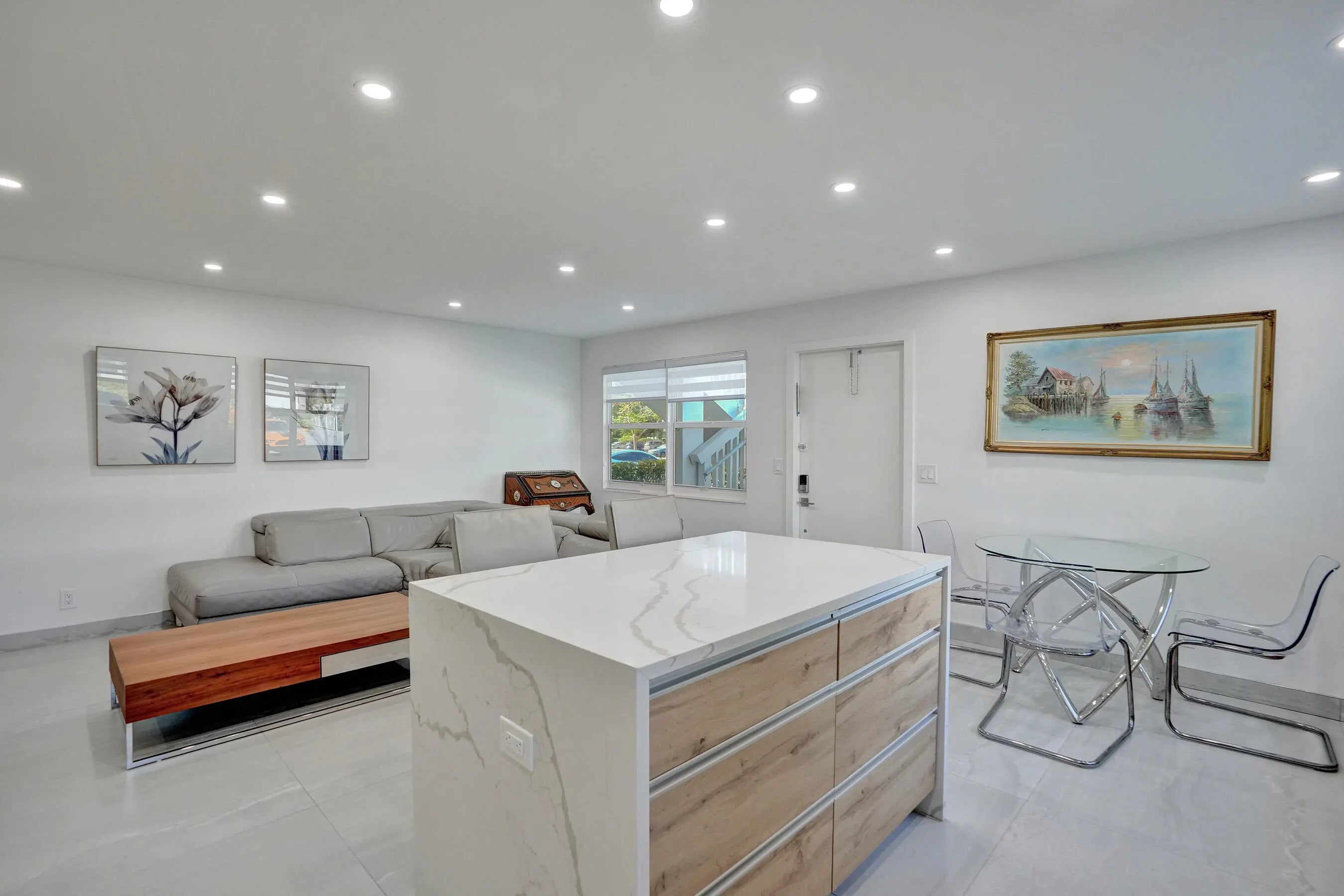Beautifully renovated and filled with natural light, this first-floor corner unit showcases high-end finishes and thoughtful upgrades throughout. The custom kitchen features quartz countertops, a full backsplash, under-cabinet lighting, and all-new appliances. Additional highlights include all impact windows, a new electric water heater, updated electrical panel, recessed lighting in every room, and 36x36 porcelain tile flooring throughout. Both bathrooms have been completely redone, and the unit is enhanced by custom built-in closets and a sleek built-in TV unit. Located in one of the few two-story condo buildings, this corner unit benefits from wraparound windows and a spacious, airy feel. The assigned parking space is just steps from the front door, offering exceptional convenience.