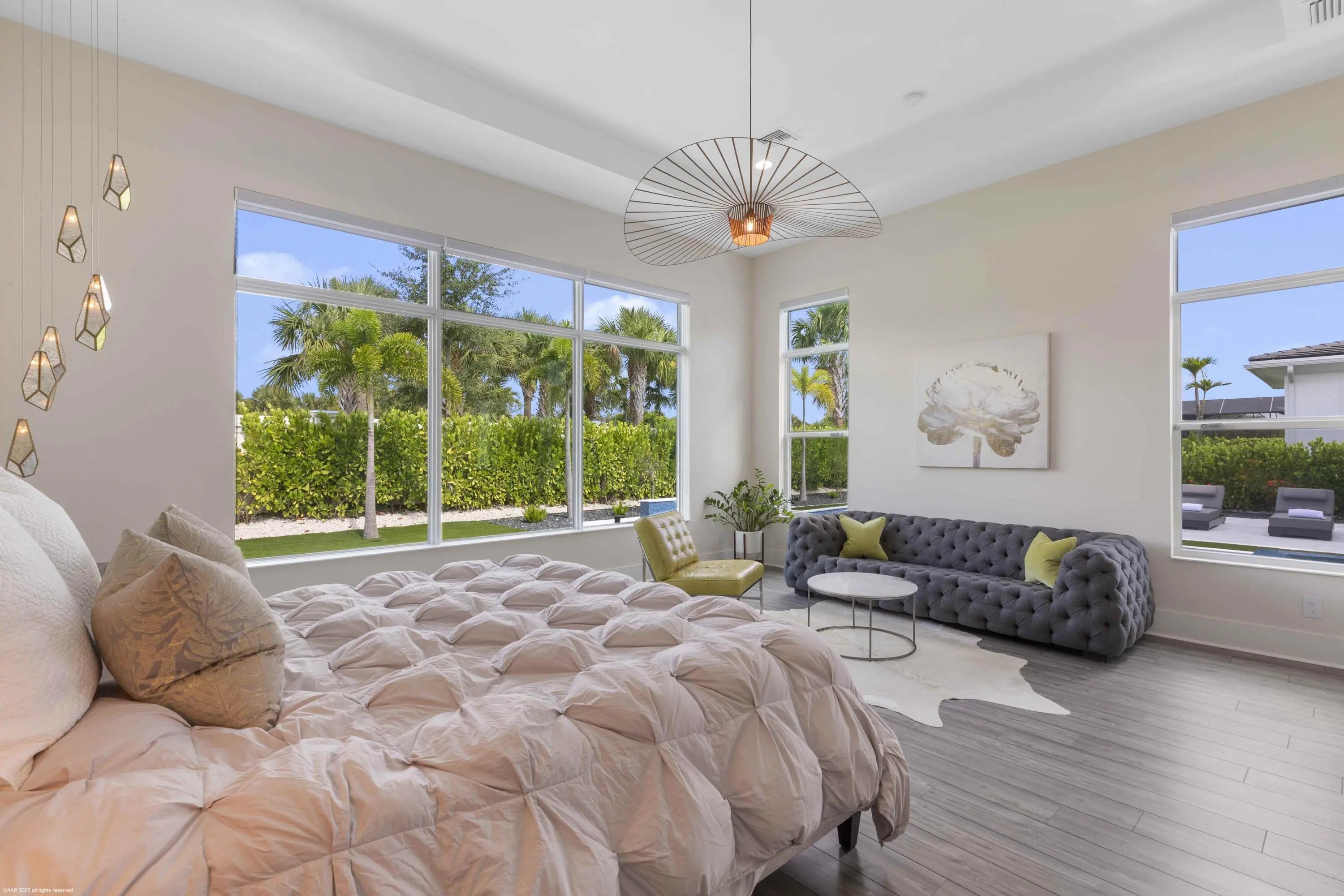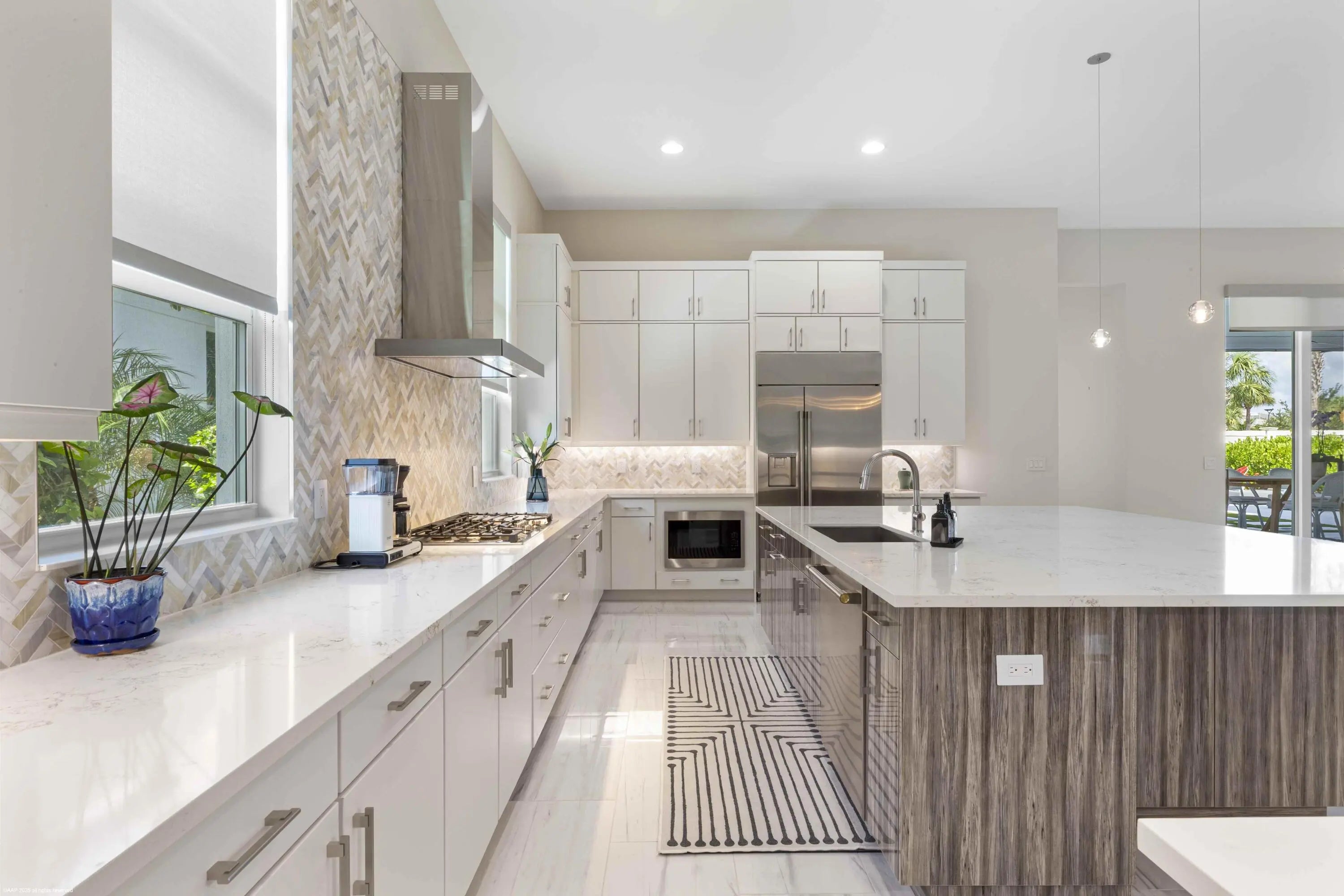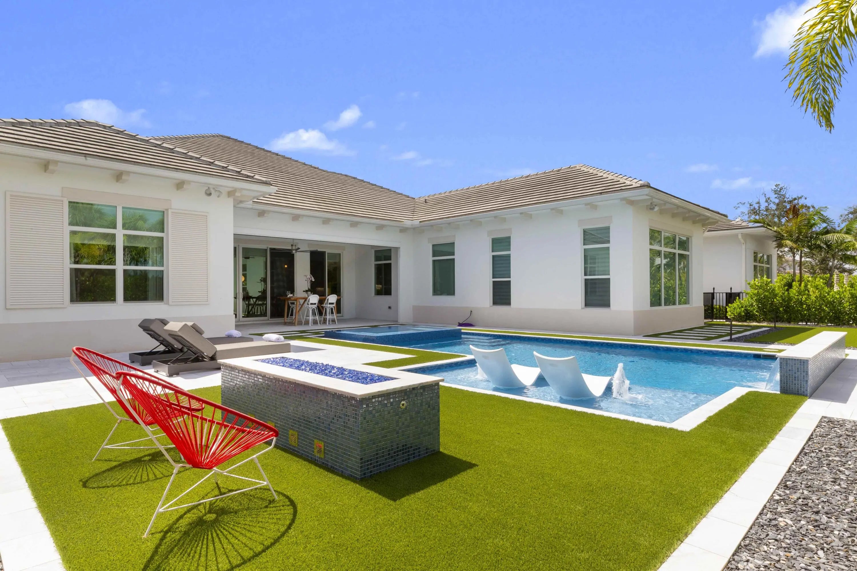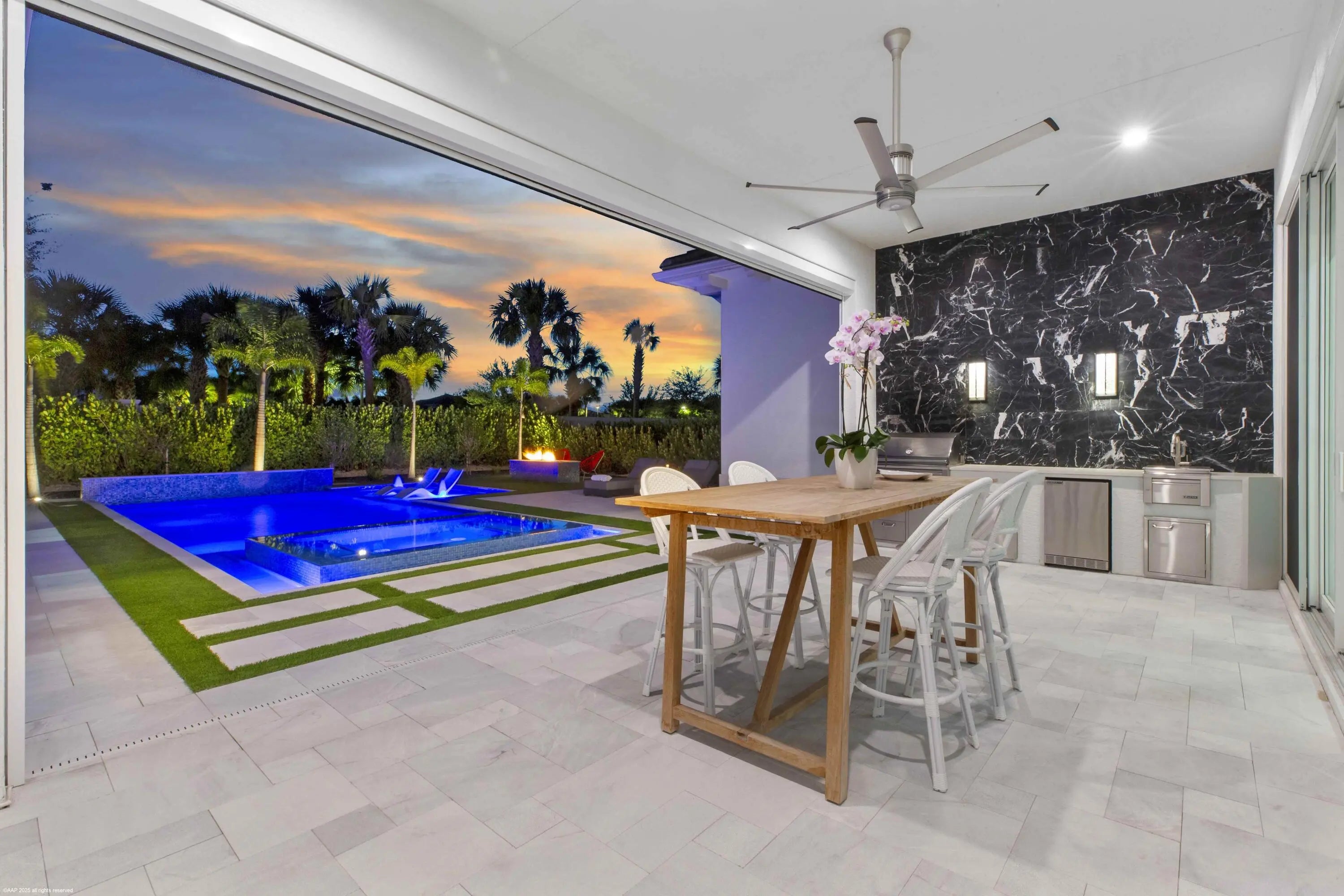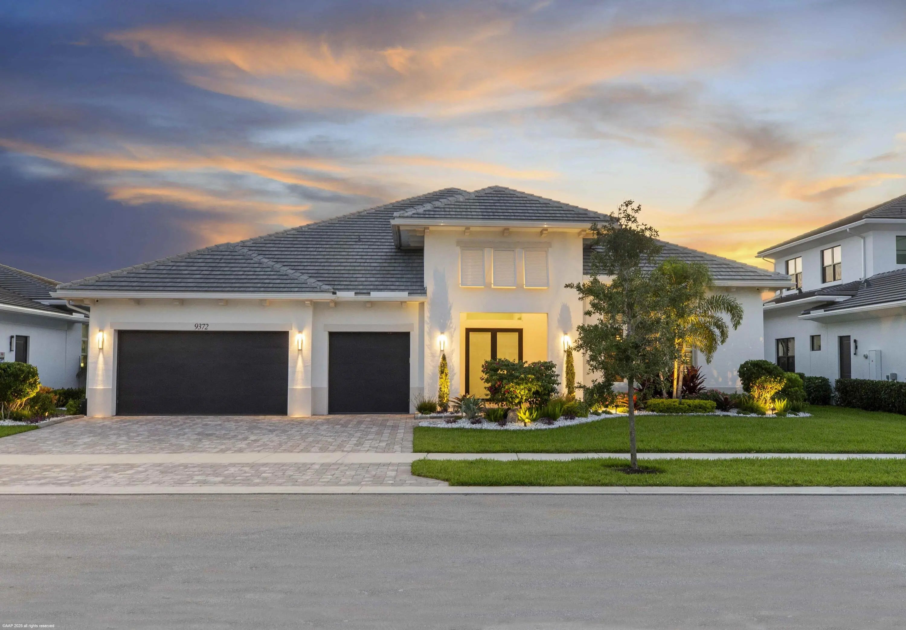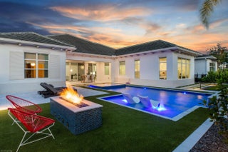 Experience refined Florida living in this exquisite 5-bedroom, 4.5-bathroom Barbados V estate home by Kenco, perfectly positioned in one of Palm Beach Gardens' newest gated communities- Coral Isles at Avenir. Designed for both elegance and comfort, this single-story home offers exceptional craftsmanship, a thoughtful open-concept layout, and an outdoor oasis that rivals any resort. From the moment you arrive, the home's striking curb appeal sets the tone. A paver driveway leads to the spacious 3-car garage, while lush tropical landscaping, enhanced by professional landscape lighting, welcomes you to the front entry with brand new impact rated, double front doors. Inside, soaring ceilings, expansive windows with electronic shades, Lutron lighting, & designer finishes create an inviting atmosphere. Open Concept Living at Its Finest The heart of the home is an expansive great room seamlessly connecting the living, dining, and kitchen spaces; perfect for entertaining or relaxing with family. Walls of glass frame views of the custom pool and outdoor living area, blurring the line between indoor and outdoor spaces. The gourmet chef's kitchen features top-of-the-line appliances, a large center island with seating, custom cabinetry, and sleek quartz countertops. The adjacent dining area and living room, with elegant lighting and designer details, ensure every gathering feels special. Private Bedroom Retreats With five spacious bedrooms, 4 of them with their own en-suite bathroom, this home provides privacy and comfort for every member of the household. The primary suite is a true sanctuary, complete with a spa-like bathroom featuring a soaking tub, oversized walk-in shower, and dual vanities. Large walk-in, custom designed closets offer abundant storage. Enjoy panoramic views of paradise (in your own backyard). Resort-Style Outdoor Living Step outside to a backyard designed for year-round enjoyment. The custom pool, complete with a heated spa, invites relaxation, while the custom-built summer kitchen with Lynx appliances, motorized screens, and beautifully crafted fire pit, makes hosting unforgettable gatherings a breeze. Expansive covered and open patio spaces provide plenty of room for lounging and dining al fresco. Professionally installed landscape lighting ensures the beauty of the outdoor space shines both day and night. Community & Lifestyle This prestigious gated community offers a wealth of amenities for residents to enjoy; think tennis courts, pickleball, clubhouse, fitness center, resort-style pools, walking trails, and more. All of this is set within a meticulously maintained environment that provides security, privacy, and a strong sense of community. Prime Palm Beach Gardens Location Located just minutes from world-class golf courses, pristine beaches, upscale shopping, and fine dining, this home combines tranquility with convenience. Enjoy quick access to major highways, top-rated schools, and Palm Beach International Airport, making travel and daily commutes effortless. Whether hosting large gatherings or enjoying quiet evenings by the pool, this home was designed for those who appreciate the finest in Florida living. Move-in ready and brimming with upgrades. Welcome home to 9372 Coral Isles!