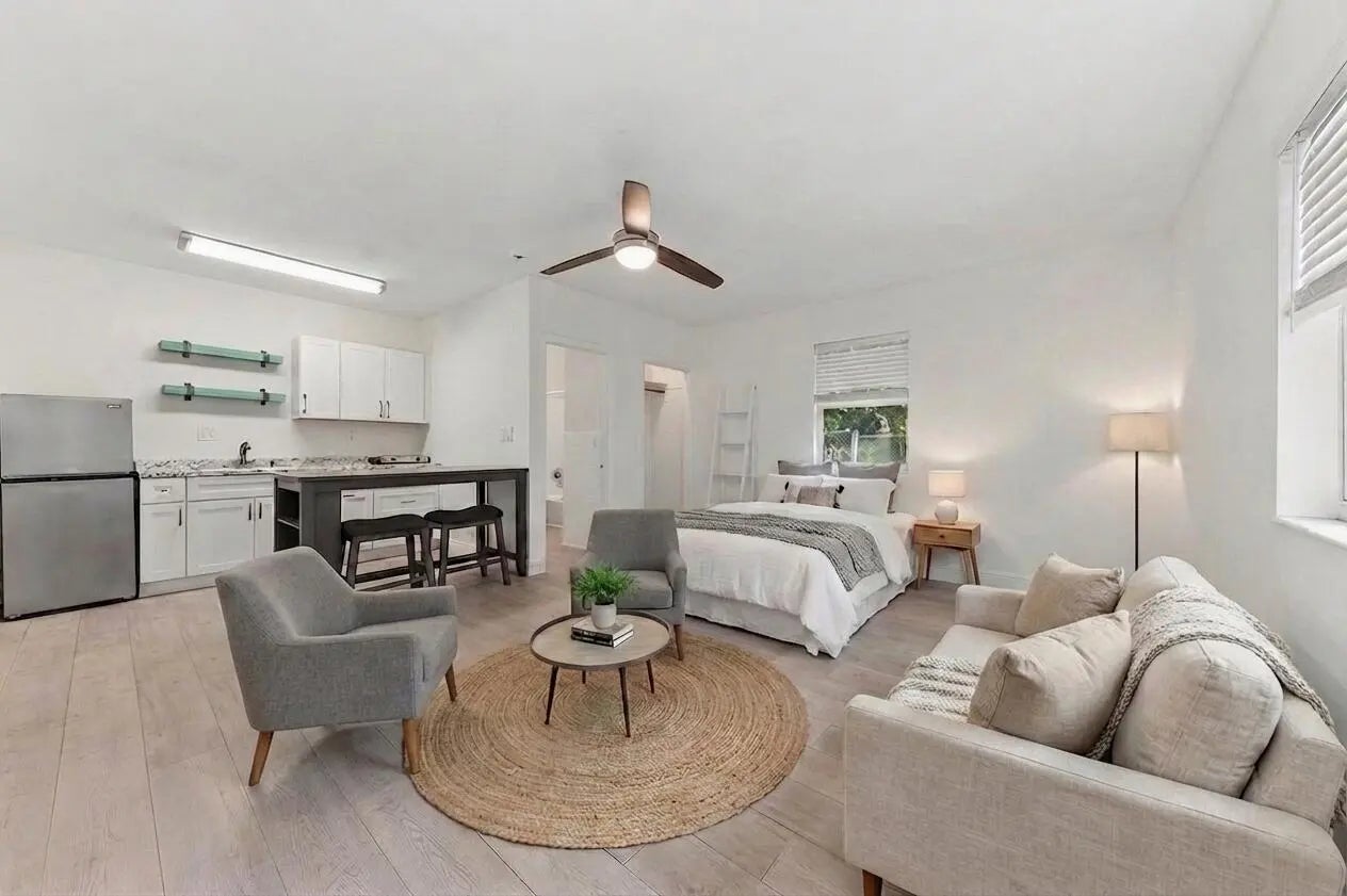 Nestled in the heart downtown Delray Beach, just three blocks from Sundy Village and vibrant Atlantic Avenue offering fine dining, boutique shopping, entertainment, along with pristine beaches, this property exudes timeless 1940s charm with modern upgrades for today's lifestyle. Built of solid CBS construction, the main residence showcases beautiful wood flooring throughout, a cozy fireplace, and impact windows for peace of mind and energy efficiency. The layout includes two bedrooms and a modern kitchen with top-of-the-line appliances, blending character with comfort. A separate guest studio cottage along the back alleyway offers flexible living—perfect for guests, a home office, or additional rental income. The fenced yard provides privacy and room for outdoor entertaining, with space for a pool to create your own tropical retreat. Whether you choose to live in one and rent the other, or enjoy both as a private compound, this property offers exceptional versatility and investment potential. Currently tenant-occupied through March 2026, it's a rare opportunity to own a turnkey investment in one of Delray Beach's most sought-after neighborhoods.