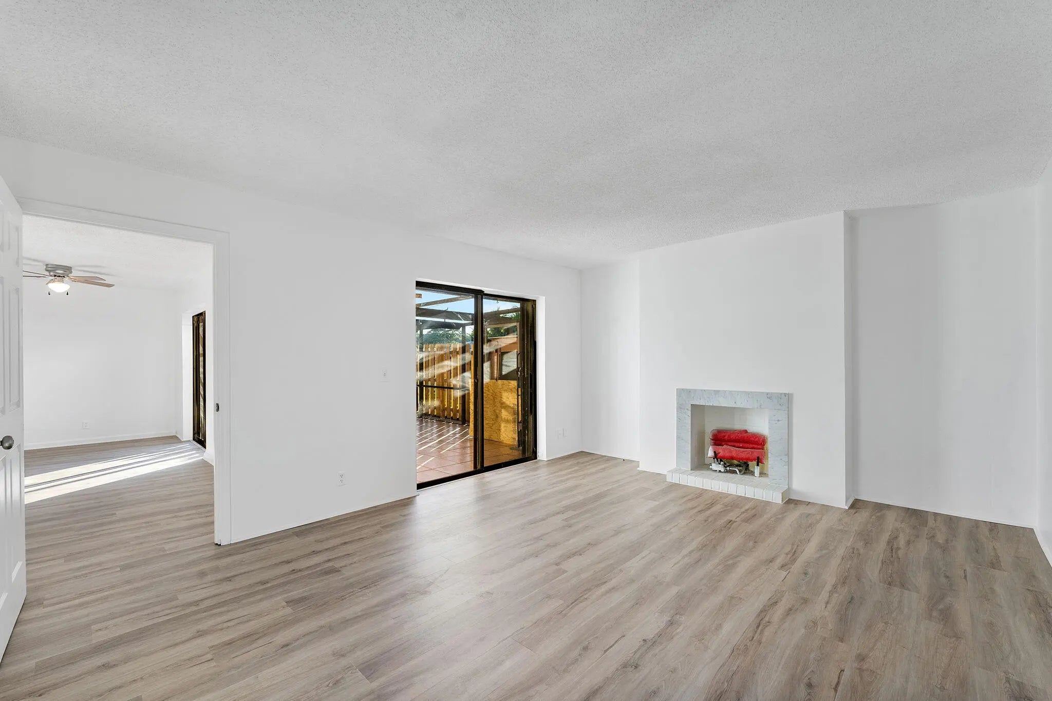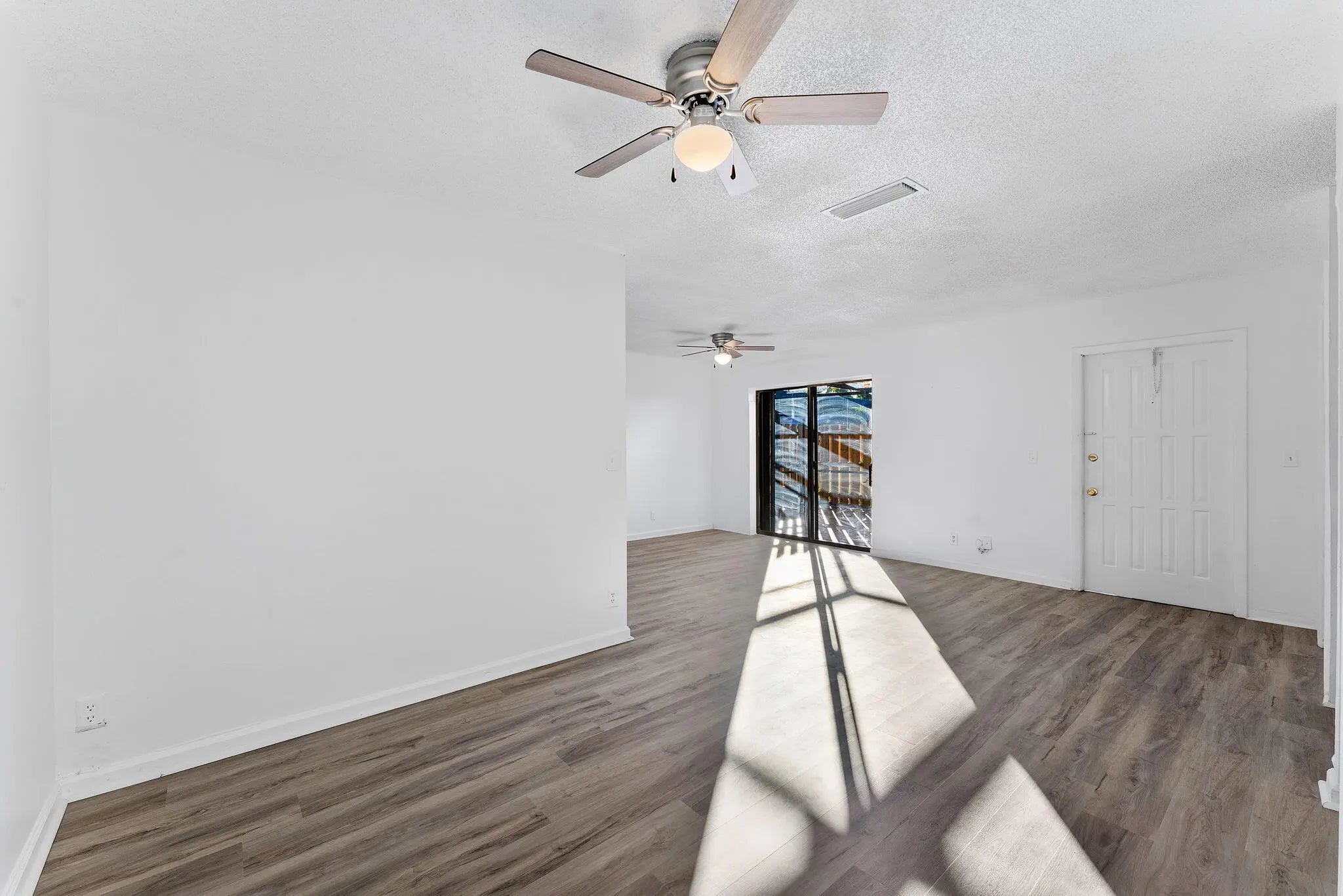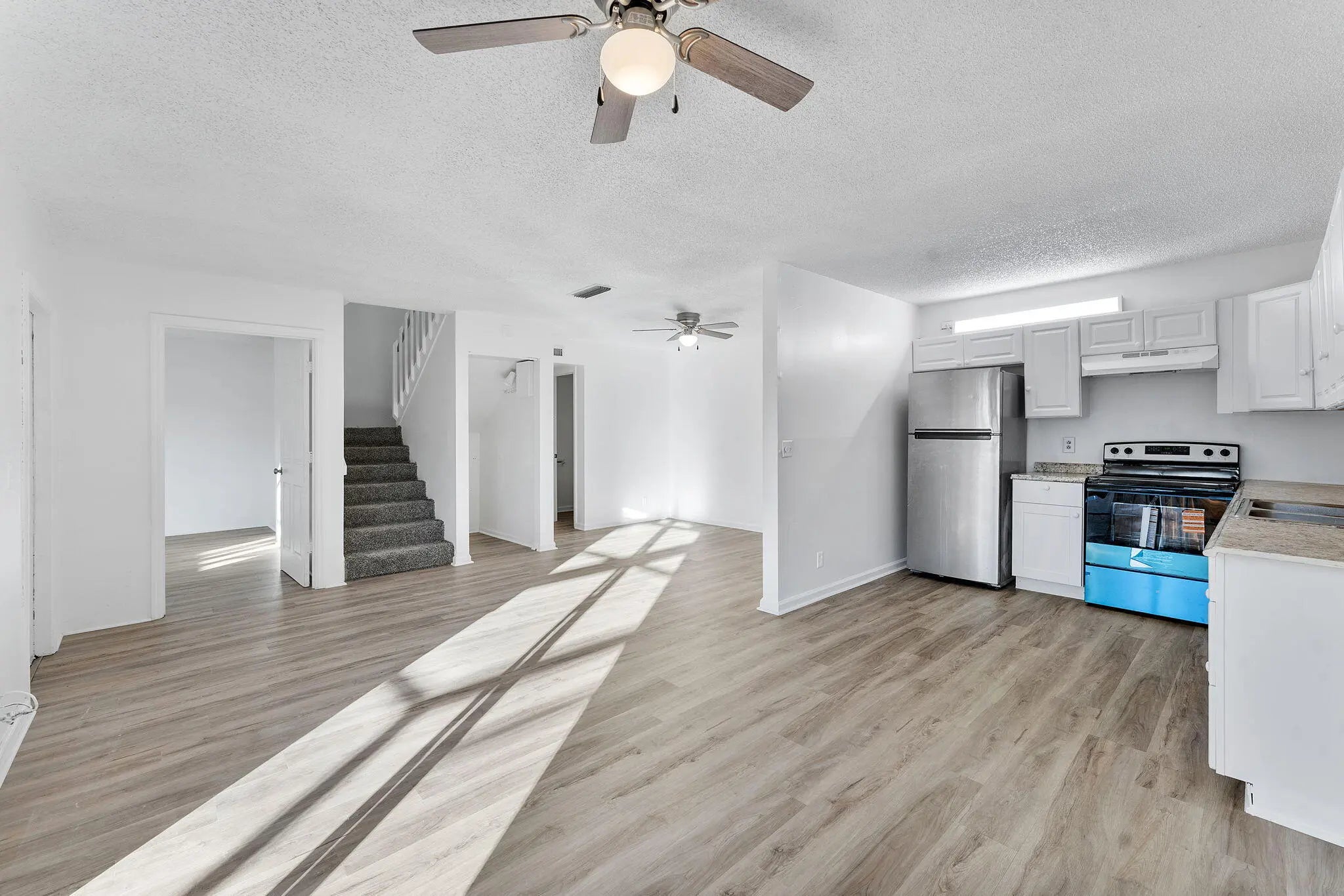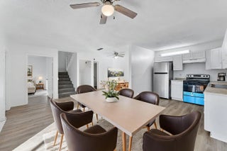 Welcome to this townhouse featuring new vinyl plank flooring and fresh neutral paint throughout, creating a bright and modern canvas. The open-concept layout seamlessly connects the living and dining areas to a stylish kitchen equipped with crisp white cabinetry, granite-look countertops, and stainless steel appliances. Enjoy effortless indoor-outdoor living with large sliding glass doors that open to a private, tiled screened-in patio—perfect for relaxing or entertaining. The two-story design offers privacy with bedrooms tucked away upstairs, while the main level remains open and airy for daily life. Whether for a primary residence or investment, this home offers a clean, contemporary aesthetic waiti