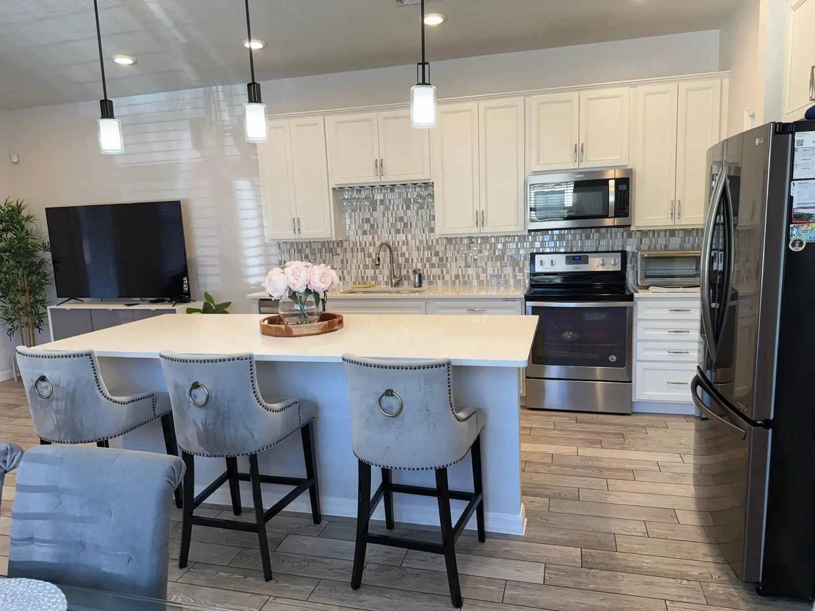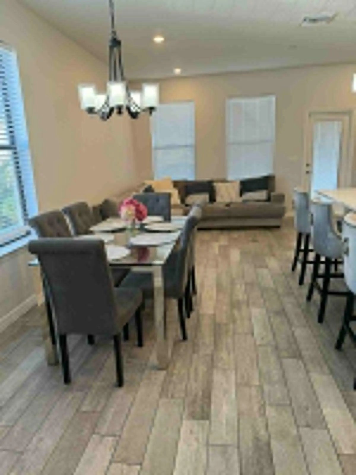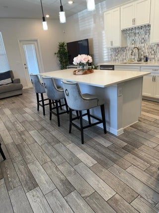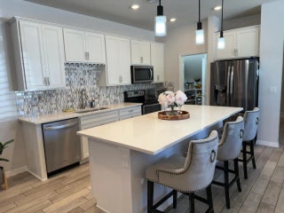 Available for rent! Well maintained, beautifully decorated and featuring a 2-car garage and volume ceilings. The home offers stainless steel Whirlpool appliances, quartz countertops, wine rack, tile backsplash, and wood-look tile flooring on the first floor with carpet upstairs. Recessed lighting enhances the open layout. All bedrooms include walk-in closets, with granite and subway tile finishes in the bathrooms. Second-floor laundry adds convenience, and the third bedroom features surround sound. Additional upgrades include a paver driveway, Nest thermostat, Ring doorbell with security camera, painted garage floor, and panel storm shutters with easy second-floor installation. The primary bath includes an impact glass transom window. Enjoy a gated community, outdoor gym, heated pool.