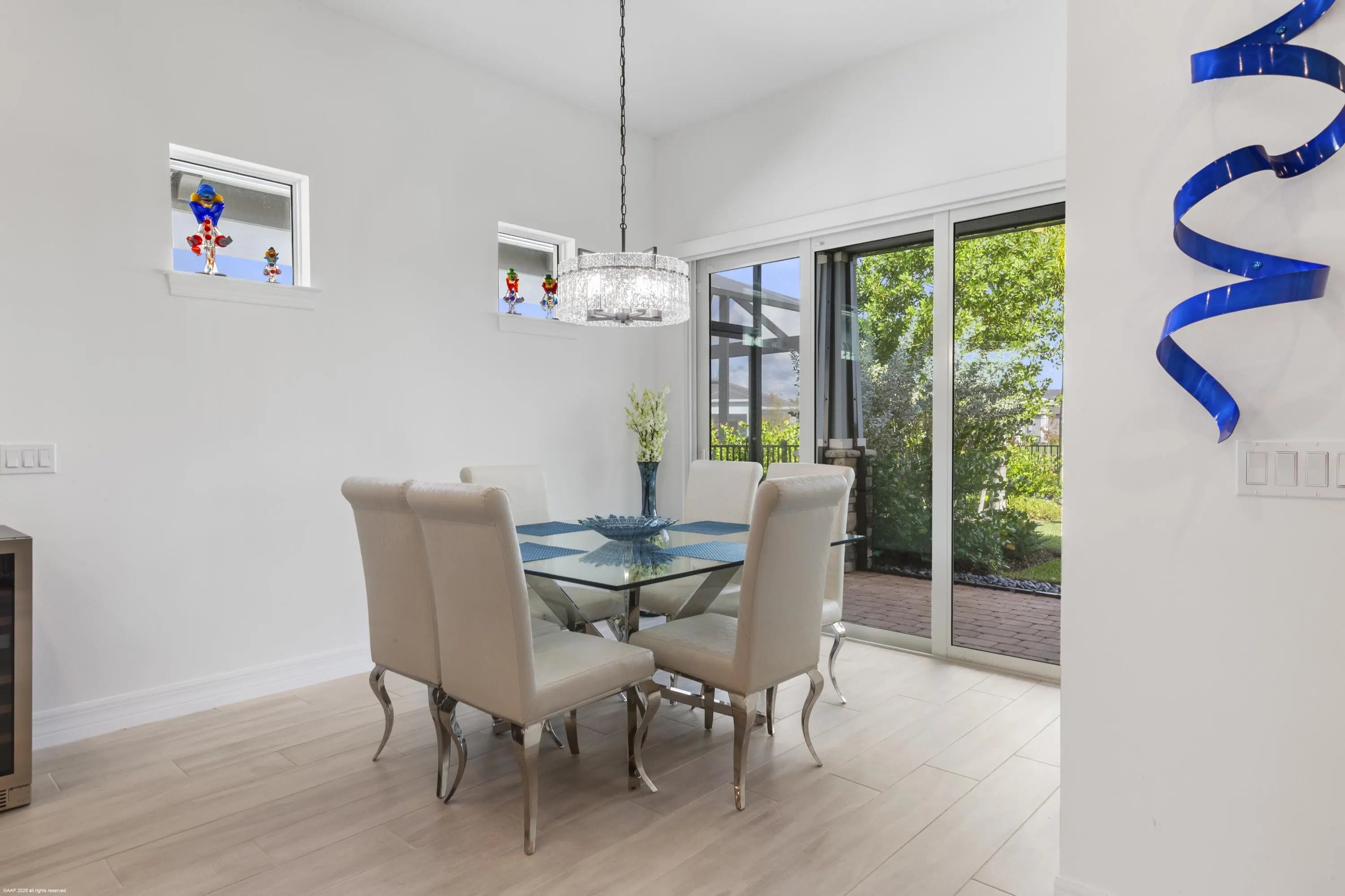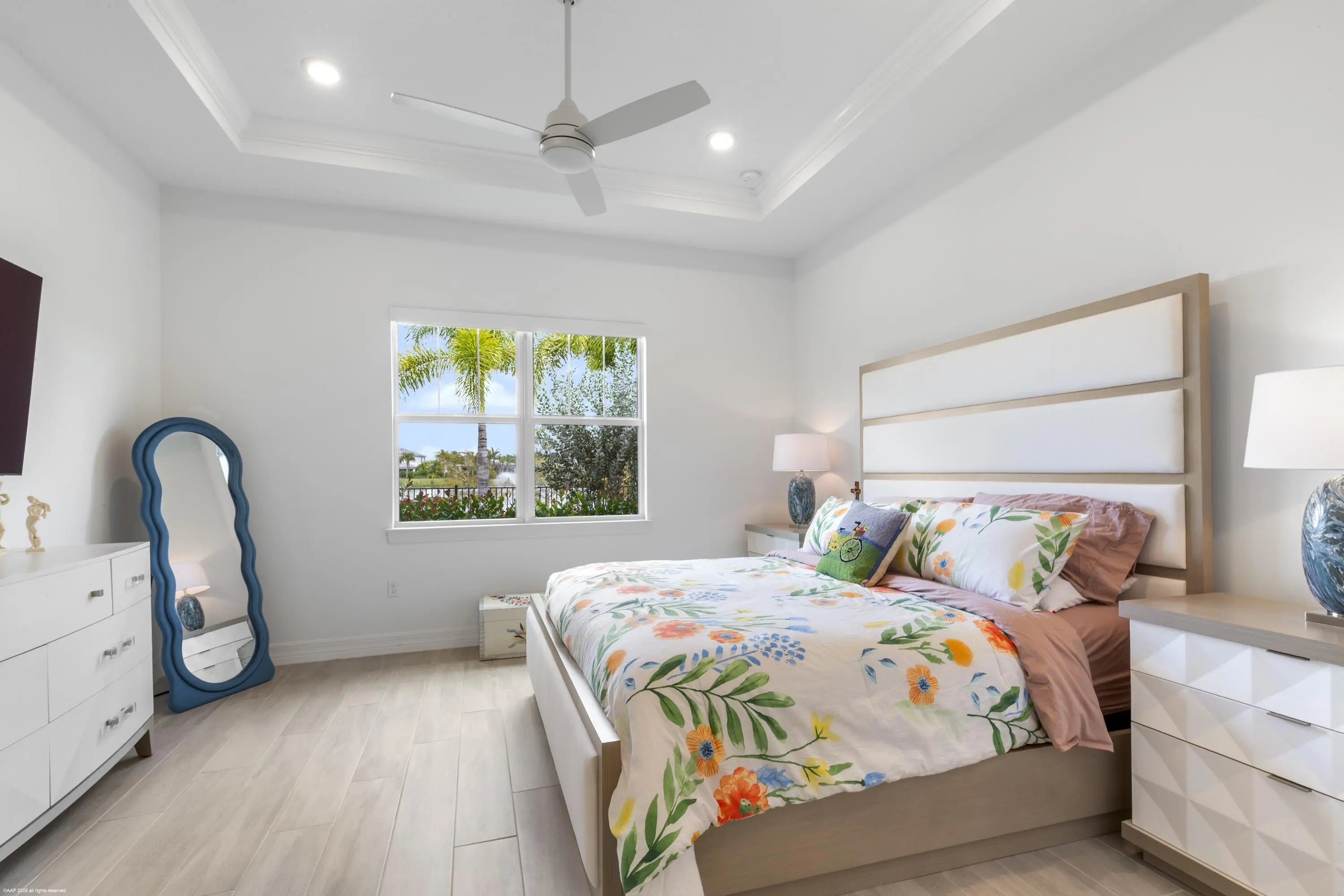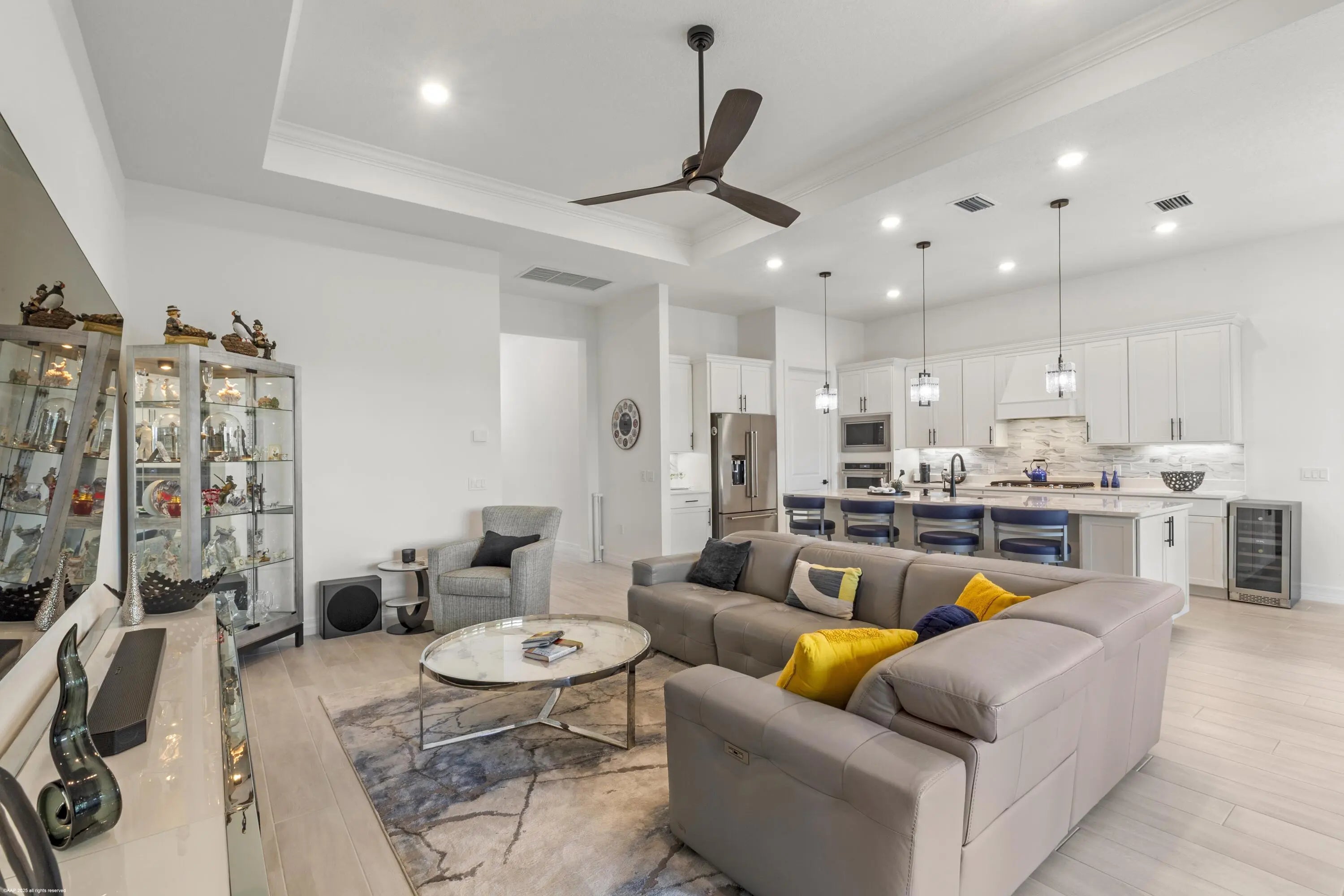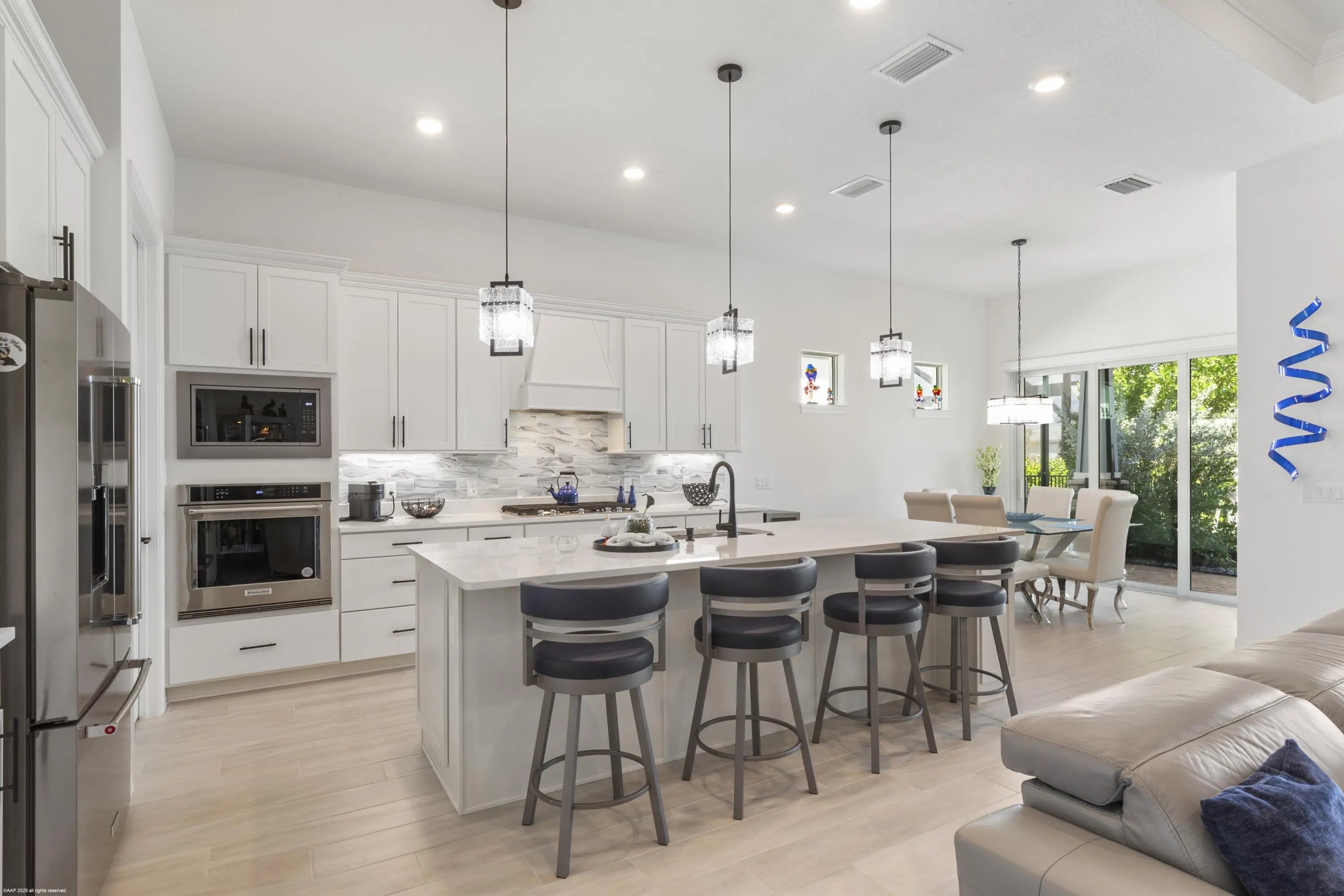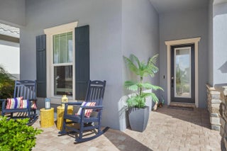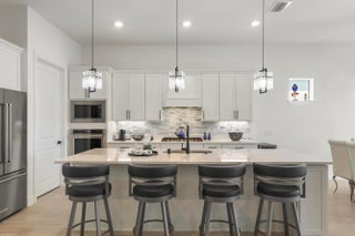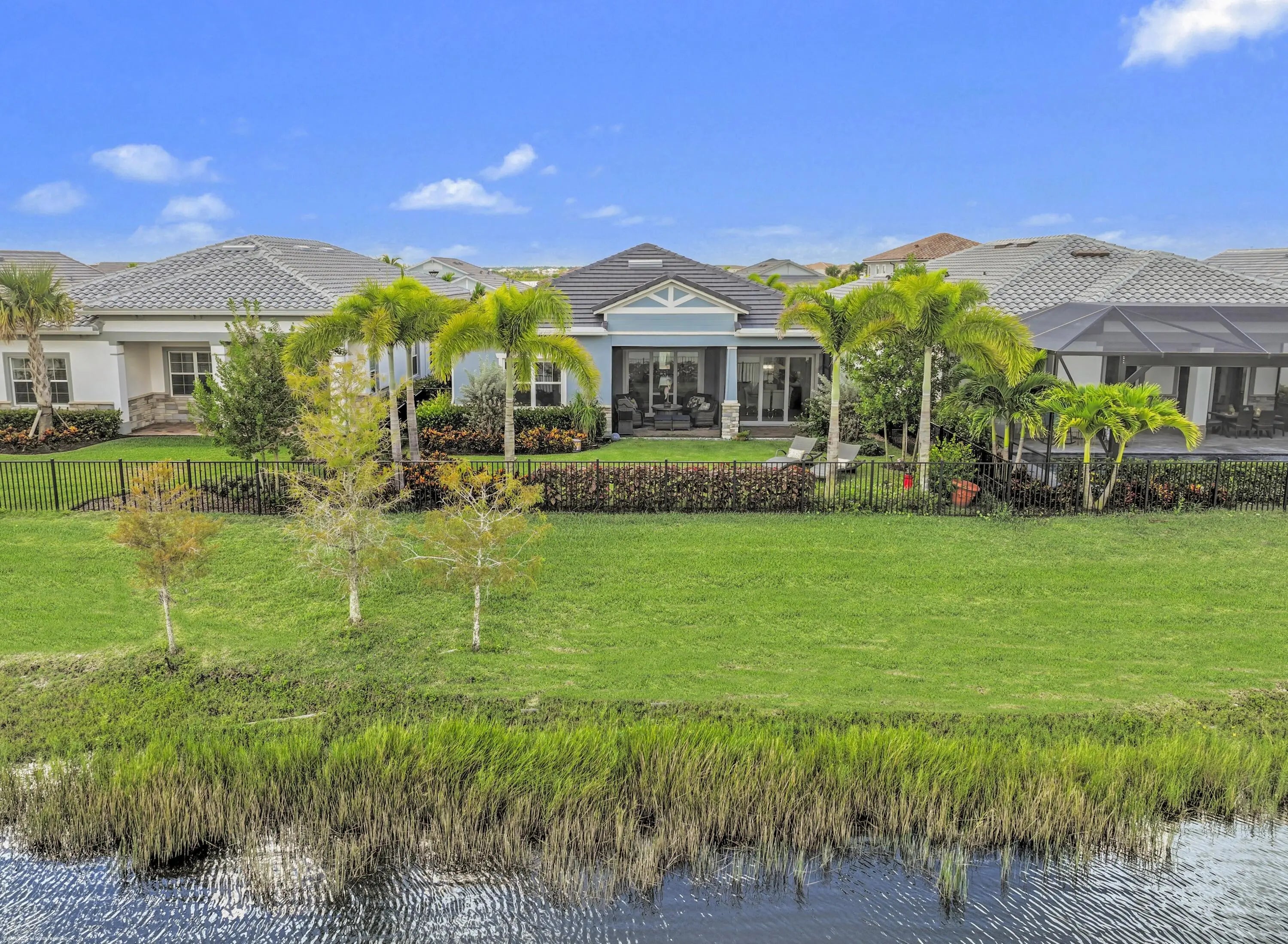 Don't miss the opportunity to see this exquisite waterfront home. From the moment you enter through the beautiful custom front door, your eyes are immediately drawn to the shimmering lake and fountain views visible through two sets of sliding glass doors. These doors open to a large panoramic, oversized screened patio - perfect for relaxing or entertaining. Whether you're cooking in the upgraded kitchen with a large built-in pantry,enjoying dinner, or relaxing in the gathering room, the tranquil water views create a stunning backdrop. The private, fenced backyard overlooks the lake and fountain, offering both beauty and privacy. This 3 bedroom, 2.5 bath home offers everything you've been wishing for. The kitchen features natural gas cooking with a cooktop, built-in microwave and oven along with an upgraded French-door refrigerator. The owner has installed high-end fixtures throughout the home, along with ceiling fans in every room. The main living areas and primary suite include electric window treatments. The master bedroom suite has an upgraded bathroom with two closets, the larger one has all built-ins.