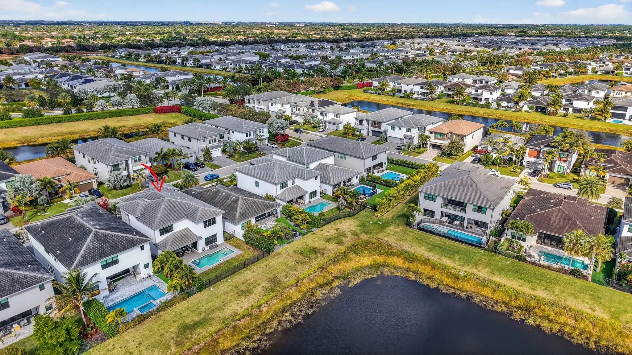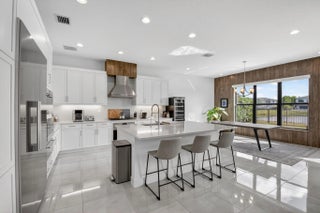 This exceptional Honolulu model offers 5 bedrooms plus a loft, 5 bathrooms, and a 3-car oversized garage, perfectly positioned on a lakefront lot with southern exposure and a custom pool. A grand entry with soaring ceilings opens to an expansive great room featuring a custom built-in wall unit with fireplace and wet bar—ideal for entertaining. The gourmet kitchen is thoughtfully designed with upgraded cabinetry, quartz countertops, a large center island, and a spacious dining area accented by a custom wood feature wall. Premium stainless steel Wolf appliances and a Miele refrigerator complete the space. Just off the kitchen, a large walk-in pantry and custom built-in mudroom provide abundant storage. The first floor is rounded out by a bedroom and a full bathroom. (currently used as an office). Upstairs, hardwood floors lead to a spacious loft highlighted by a unique built-in desk and wall unit. The primary suite is a true retreat, offering oversized his-and-hers walk-in closets and a spa-inspired bathroom with a freestanding soaking tub. Three additional bedrooms are located upstairs, two with en-suite bathrooms. A conveniently located laundry room features built-in cabinetry and classic subway tile. Additional highlights include impact-resistant windows and doors, gas appliances, and refined finishes throughout. Located in the sought-after, resort-style community of Lotus, residents enjoy a restaurant and bar, heated pool and whirlpool, tennis and pickleball courts, fitness center, playground, and more. Ideally situated near Delray Beach, this home offers quick access to dining, shopping, beaches, and is zoned for A-rated schools