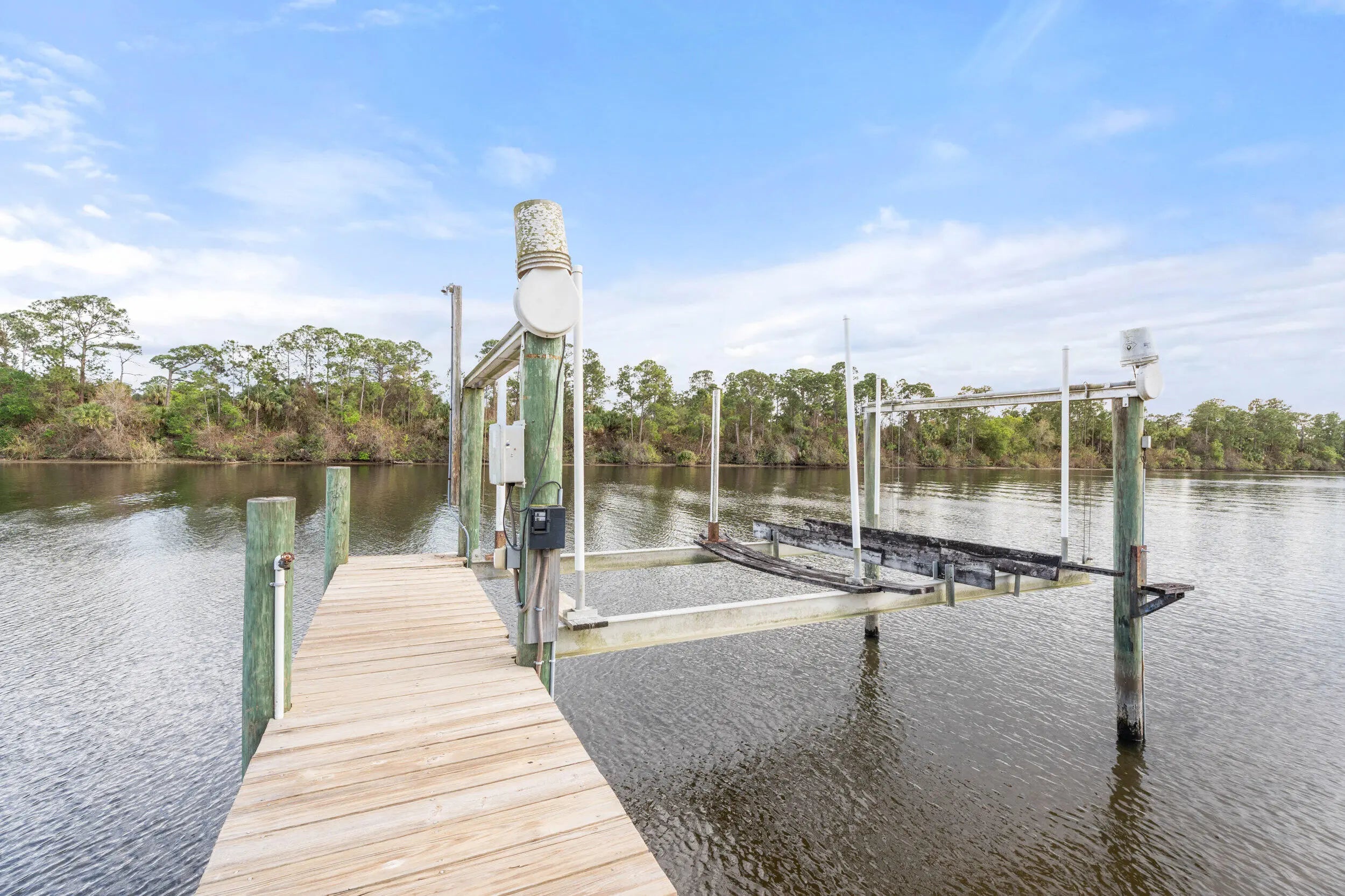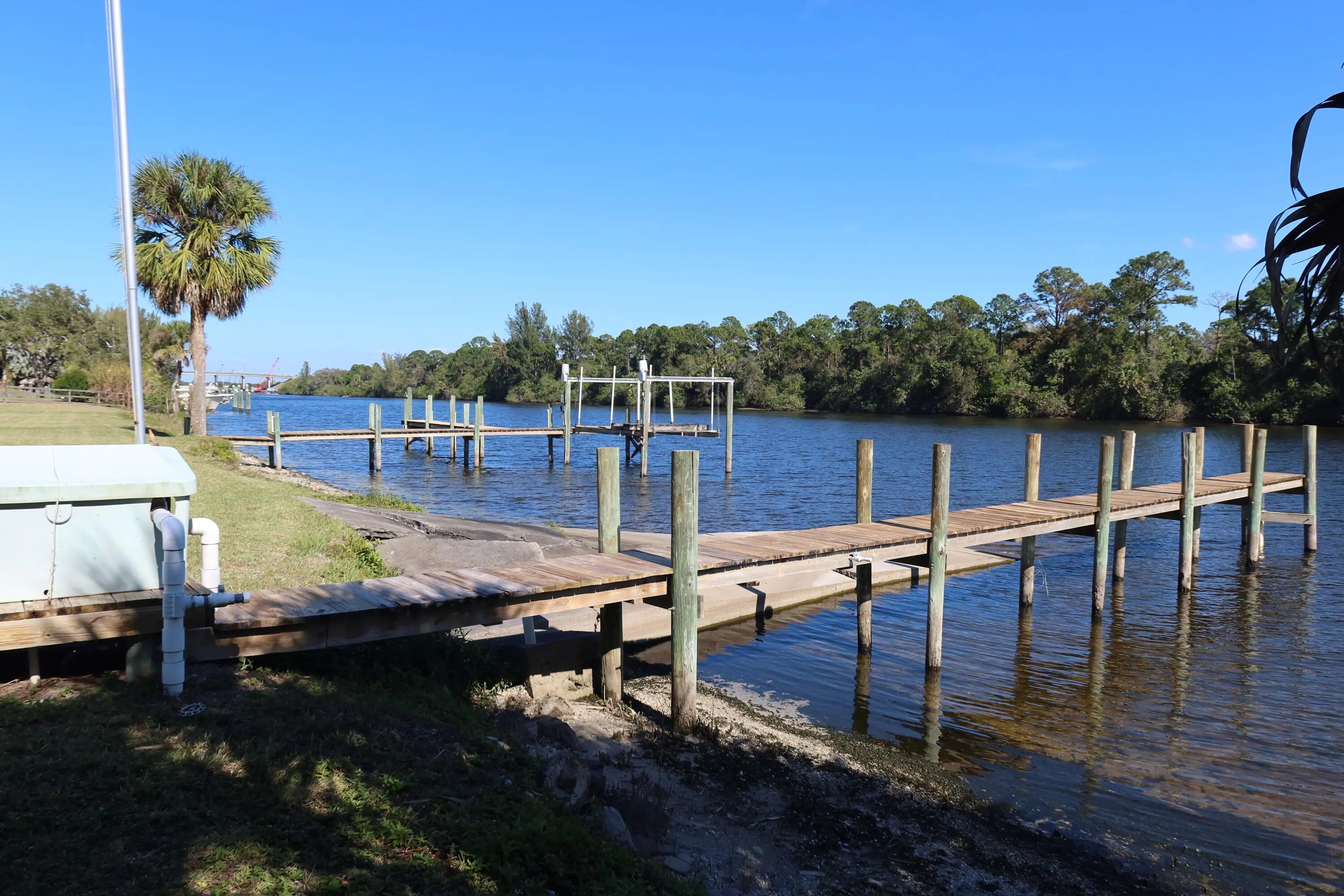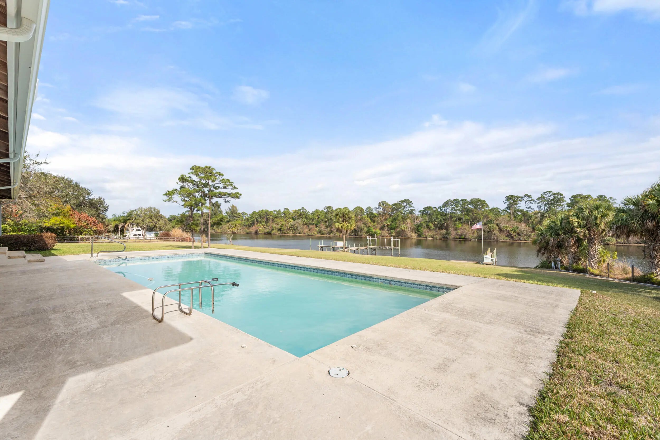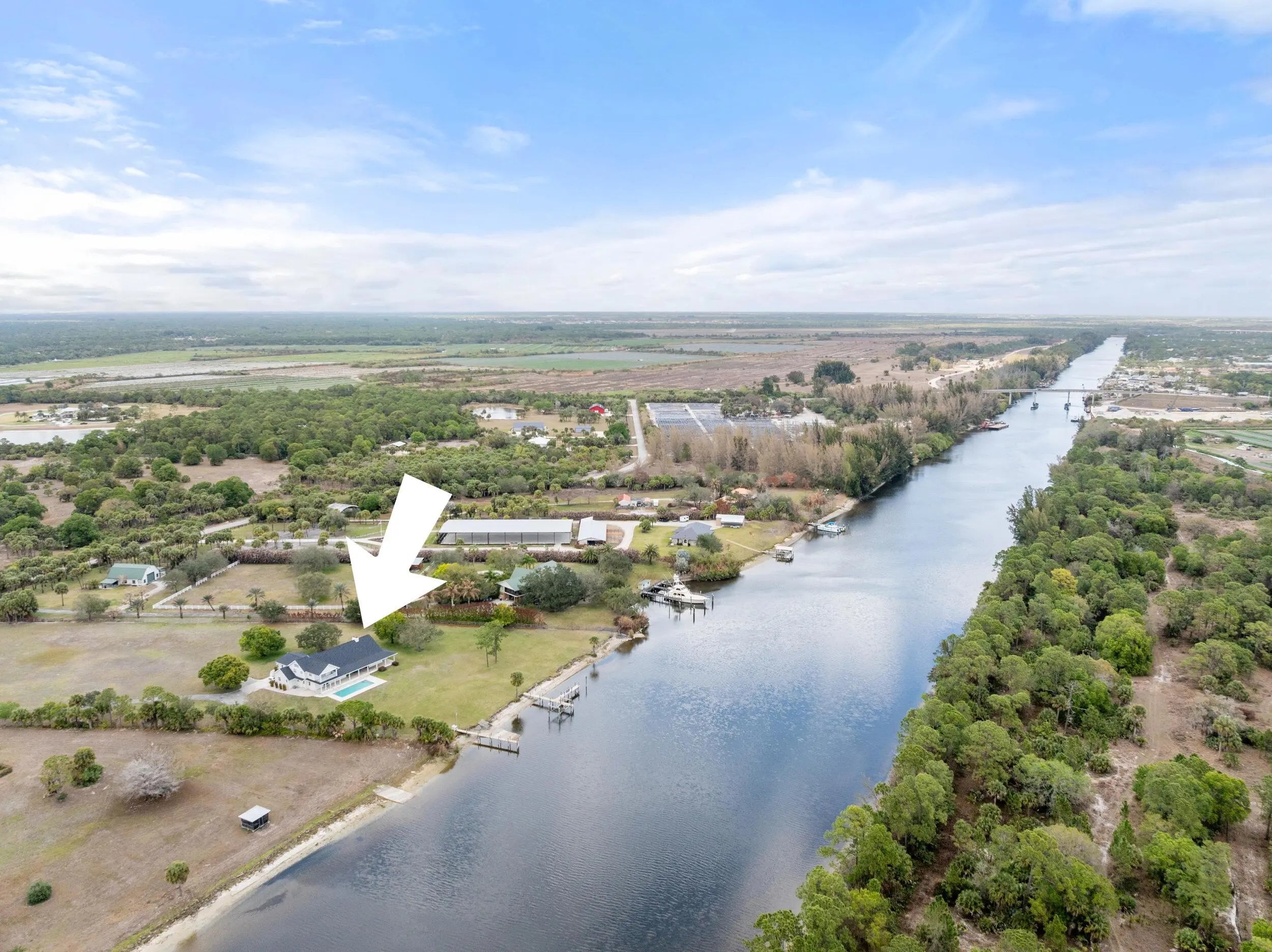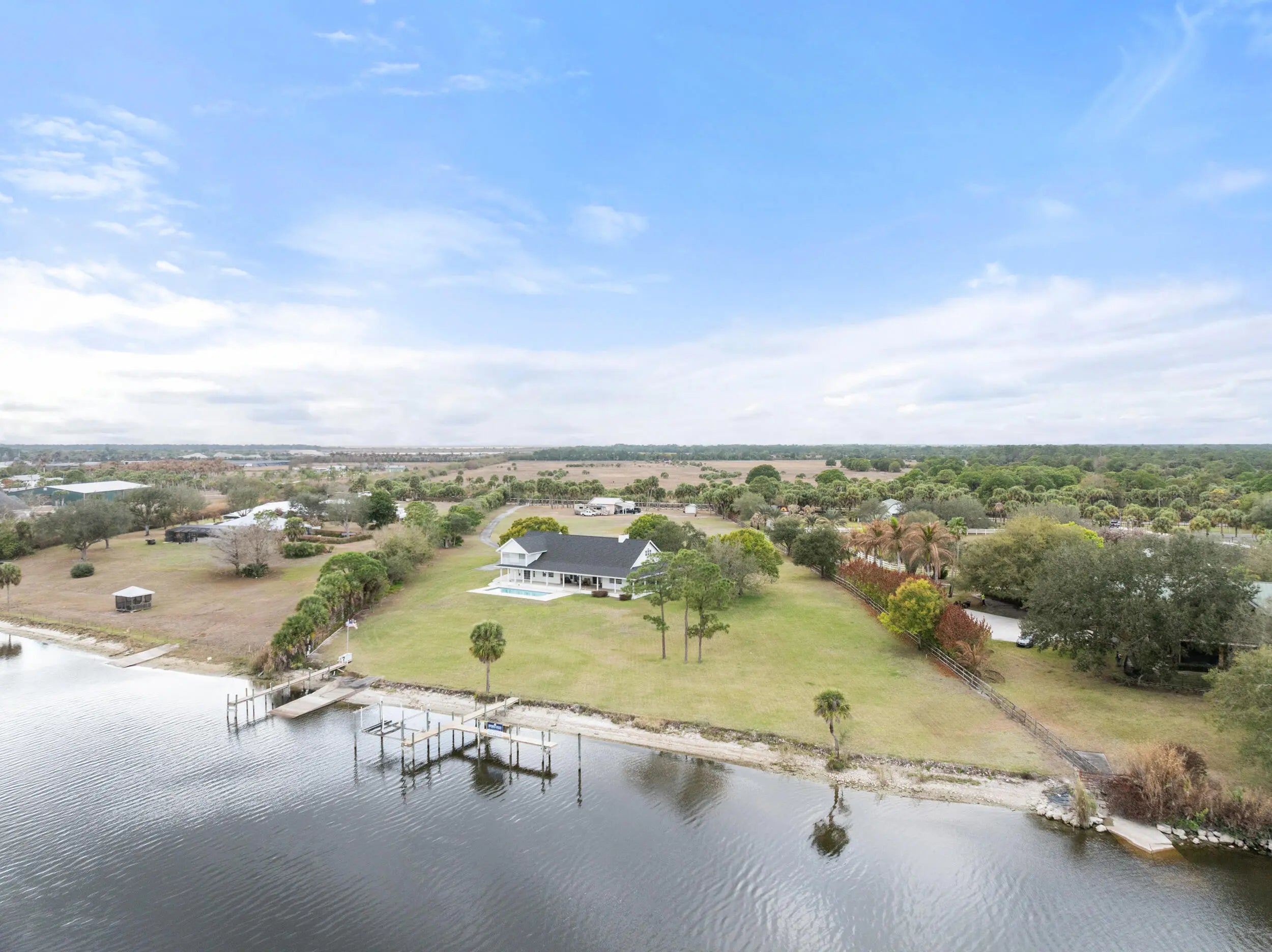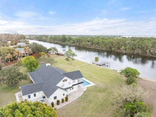 5 ACRES!! 380 SF OF WATER FRONT!! From sunrise until sunset, you will feel like you're on vacation every day at this rare 5 acre private waterfront estate in Palm City. Unmatched Serenity and peace abound as you overlook the water from the wrap around porch or the upstairs balcony. Sitting at roughly 30 feet of elevation, the views are stunning. The home features 4785 square feet of living space which includes attached guest quarters, making it perfect for entertaining or multigenerational families. Boasting 5 bedrooms all with en-suite baths, 2 kitchens and multiple flex rooms the home awaits your personal touch to fulfill your vision and make it your own. Outside you will find 5 cleared acres of natural beauty for outside activities or adding additional living quarters. There is a 2000 square foot workshop with enough addtional space to store your water toys or extra vehicles. Overlooking the river is an 18' by 40' private pool, 2 boat docks and a boat ramp permitted by USACE and over 380' of water frontage. Natural beach shoreline with minimal erosion. Situated on the St. Lucie River which connects the Atlantic to the Gulf of Mexico it is a boater's paradise, allowing easy navigation from the east coast to the west coast with deep water and no fixed bridges. The property is also just minutes from the newly developed Apogee Golf Club, one of South Florida's most exclusive private golf destinations featuring multiple championship courses and world-class amenities. Major capital improvements completed in April of 2024, include a new roof, new gutters and downspouts and exterior paint. The well pump and 2 AC units were replaced in 2021. Whether you choose to enjoy the property as-is, expand, or re-imagine it entirely, opportunities of this size, frontage, and permitting are extraordinarily rare.