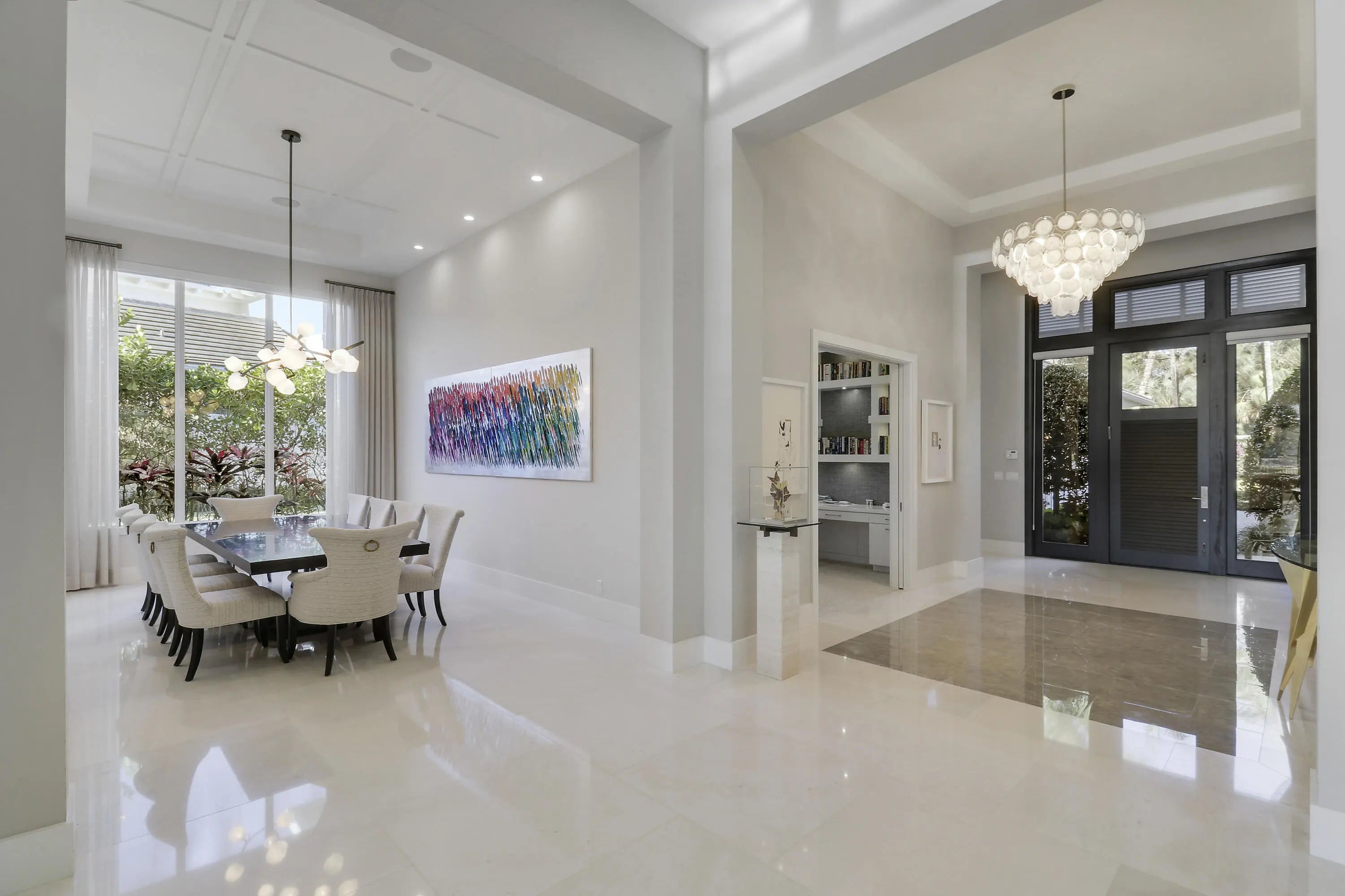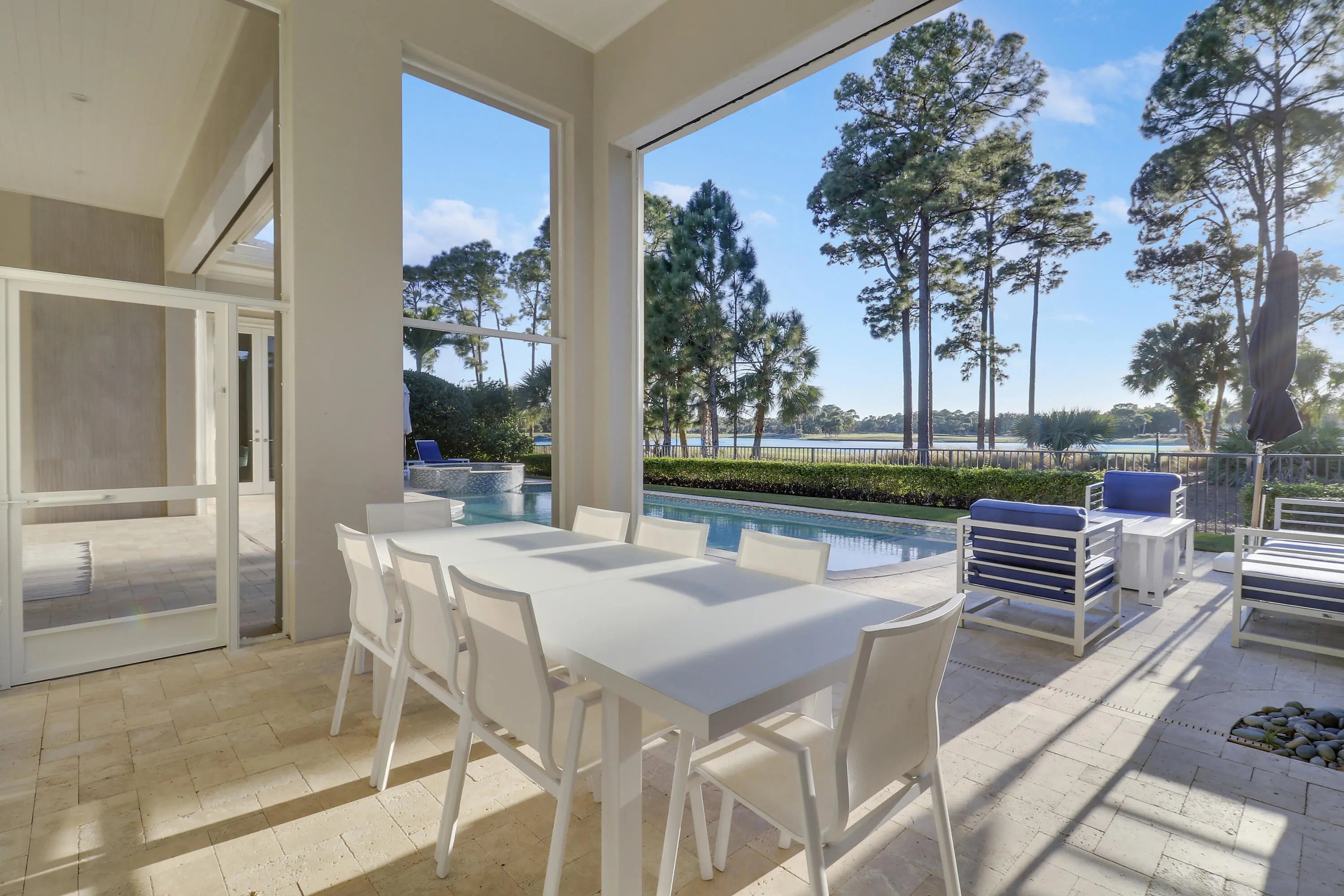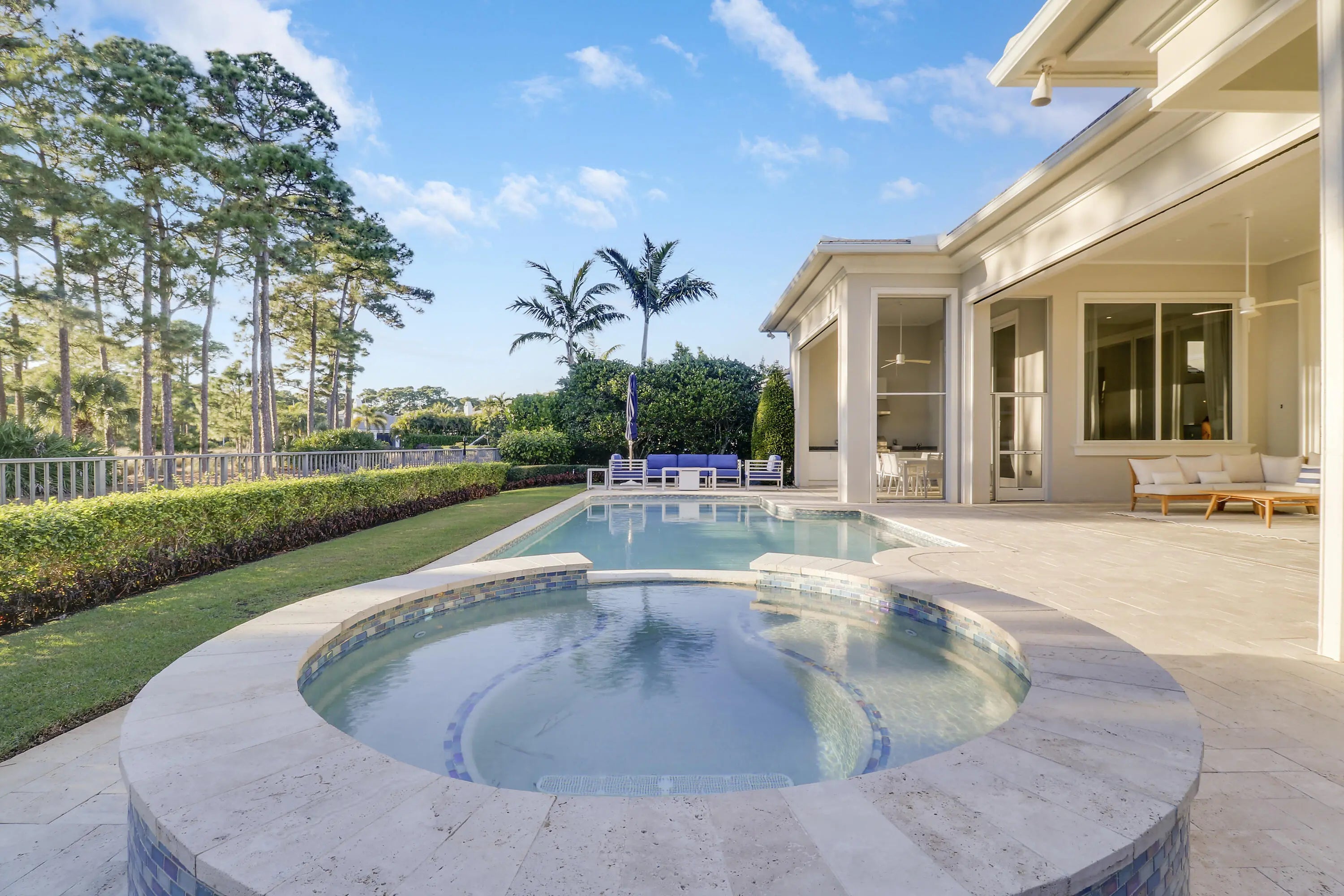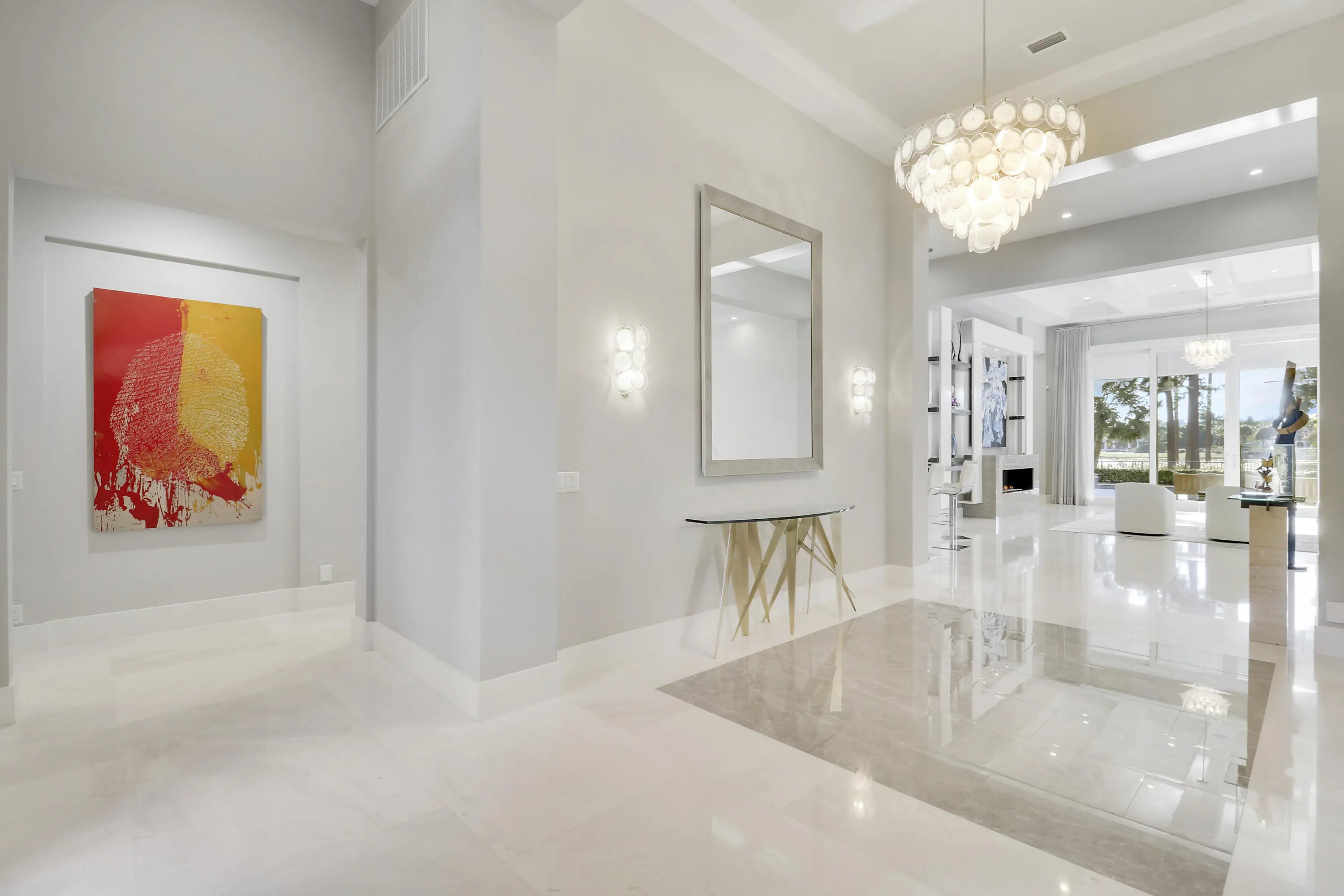 Spectacular 1-story residence by Mustapick Homes on a .39 acre lot featuring 4 full bedroom suites + an office/den, 5.5 baths, epic golf and lake views, 36x36'' Diamond White marble floors, Imported Italian kitchen w/ Thermador appliances, Stormy Sky and Calcutta Quartz counter tops, wet bar, and coffered ceiling heights up to 15'. The primary suite is enormous with a sitting room. Separate his and her baths and closets. Her built-out closet is the size of a guestroom! The outdoor area features a summer kitchen, phantom retractable screens, heated pool & spa, and some of the best views in Old Palm. This gorgeous home is being offered furnished so you begin enjoying this home and the Old Palm right away. This is a rare offering so act quickly and don't miss your opportunity! Additional Features: Air conditioned garage European White Oak Floors in the guest suites