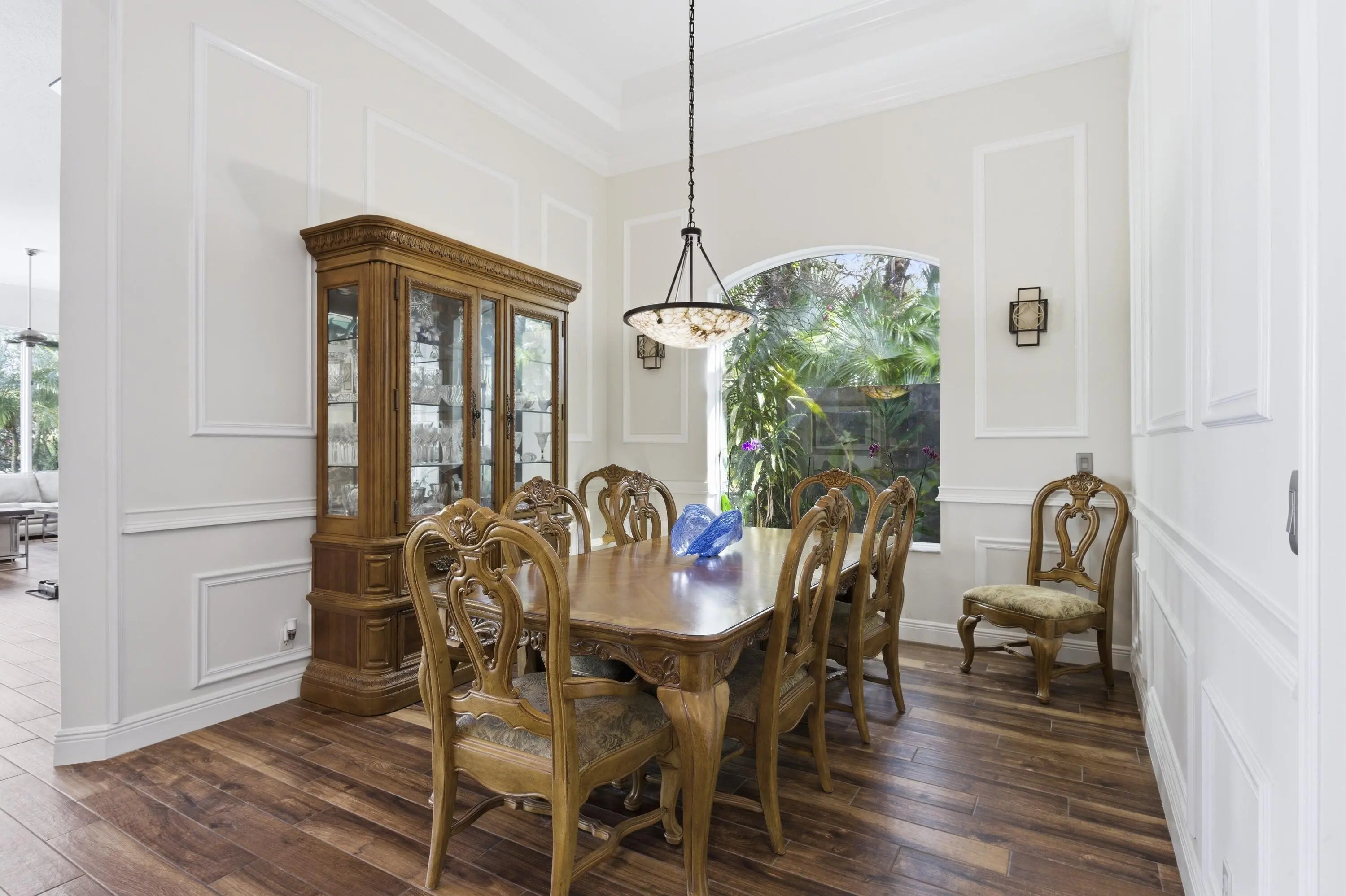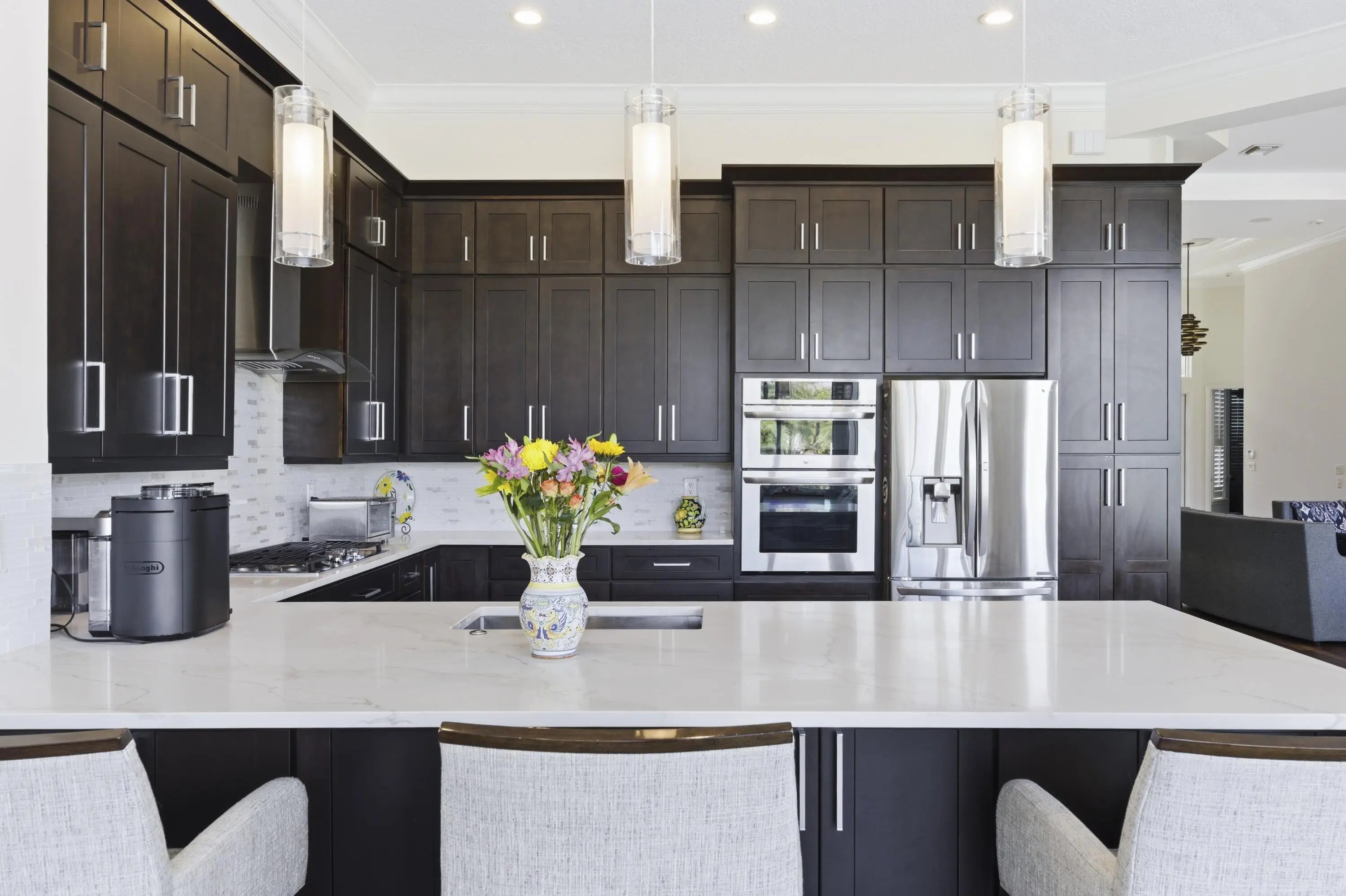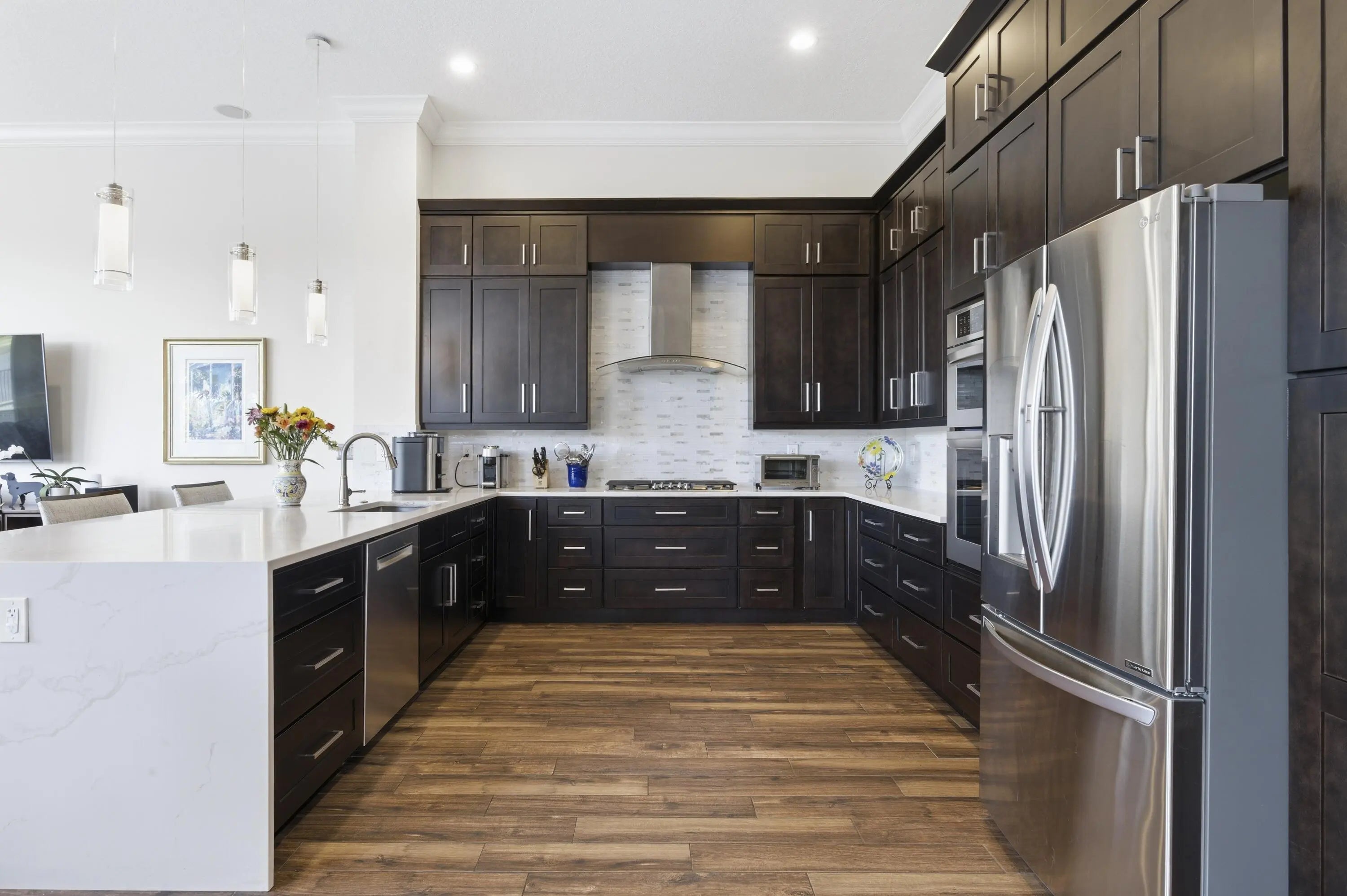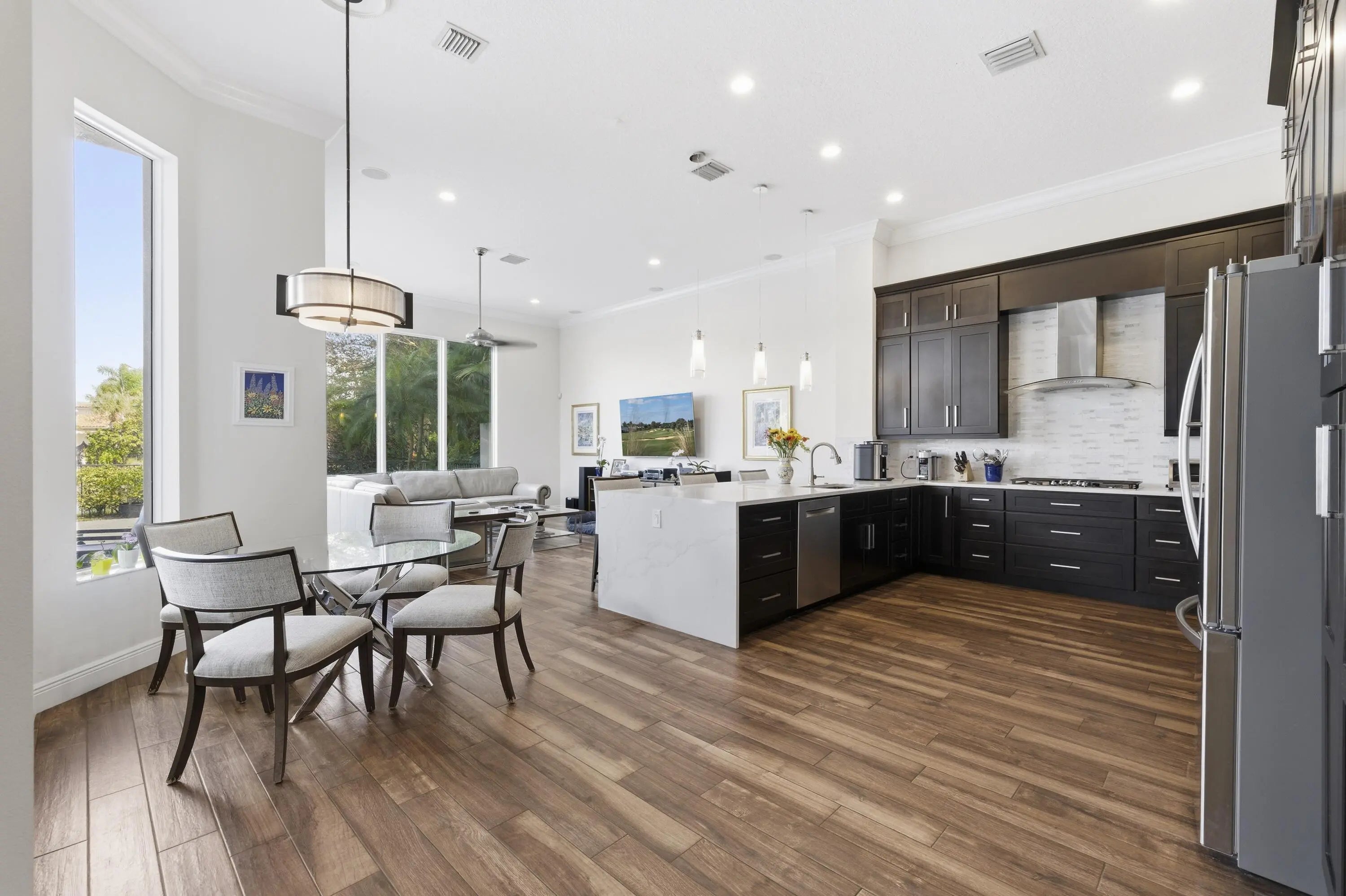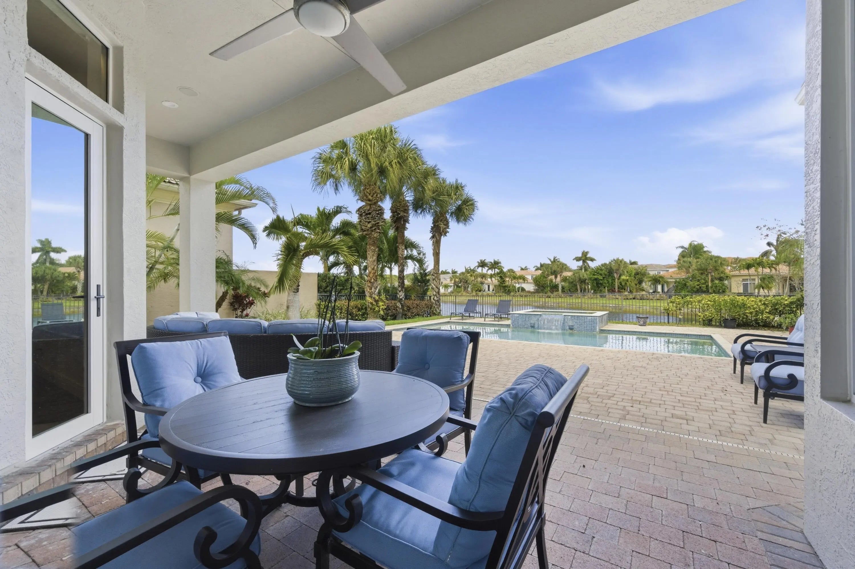 Sweeping panoramic views highlight this exceptional private corner lot, offering a beautiful setting for both everyday living and entertaining. The expansive backyard serves as a private retreat, featuring a sparkling saltwater pool and spa—perfect for relaxing while enjoying the scenery. Enter the contemporary residence through a landscaped lanai with a private front gate and impressive double entry doors. Inside, wide-open views immediately capture your attention, creating a seamless flow between indoor and outdoor living spaces. The desirable Malaga model offers a thoughtfully designed layout with spacious, light-filled living areas. The gourmet kitchen includes stainless steel appliances, ample cabinetry, and generous counter space, ideal for daily living or hosting gatherings.